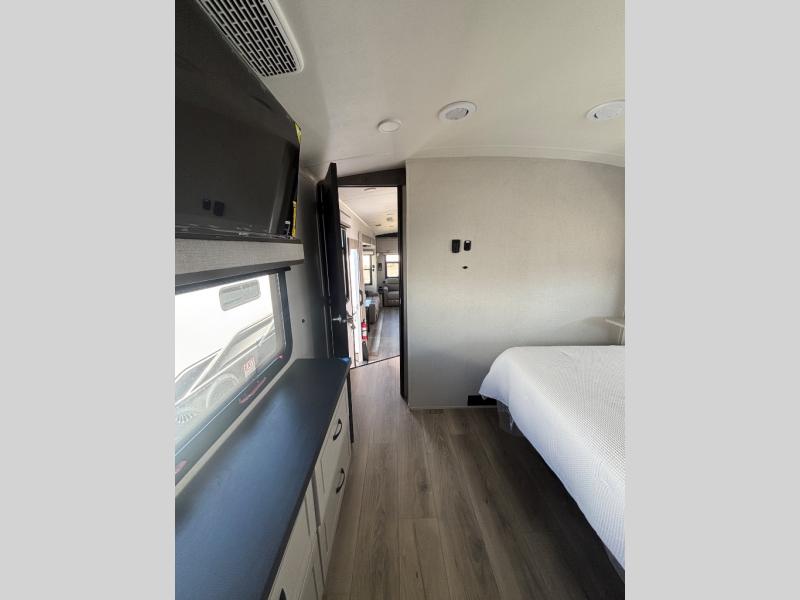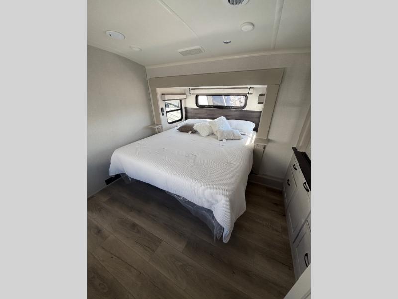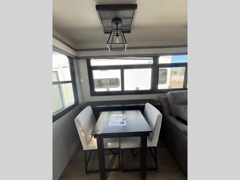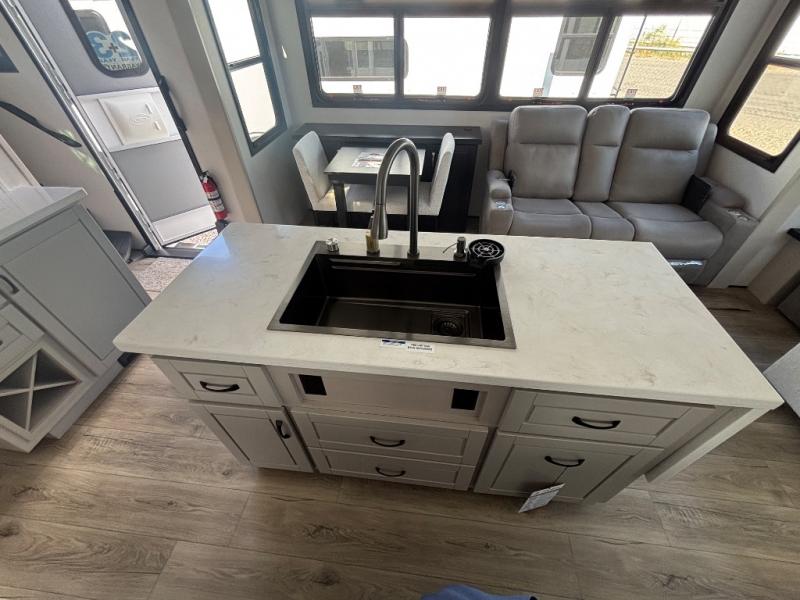 Whether you want to live in this fifth wheel or travel for long periods at a time, you will enjoy the spacious main living and kitchen area with dual slide outs as well as the bedroom with a slide out king bed. You will also find a walk-in closet with hamper and prepped space for a washer/dryer option, and a flip-top dresser with 32" TV. Easily get cleaned up in the full bathroom which also has linen storage. The cook will have a residential refrigerator to store all the cold items and beverages, a kitchen island, a pantry and a residential 24" stove. The 50" Smart LED HDTV with fully digital HDMI output and home entertainment system with subwoofer and fireplace below will provide a cozy place to watch your shows while relaxing on the theater seats, the tri-fold sofa, or the roll-top dinette table.