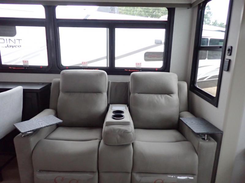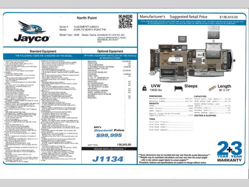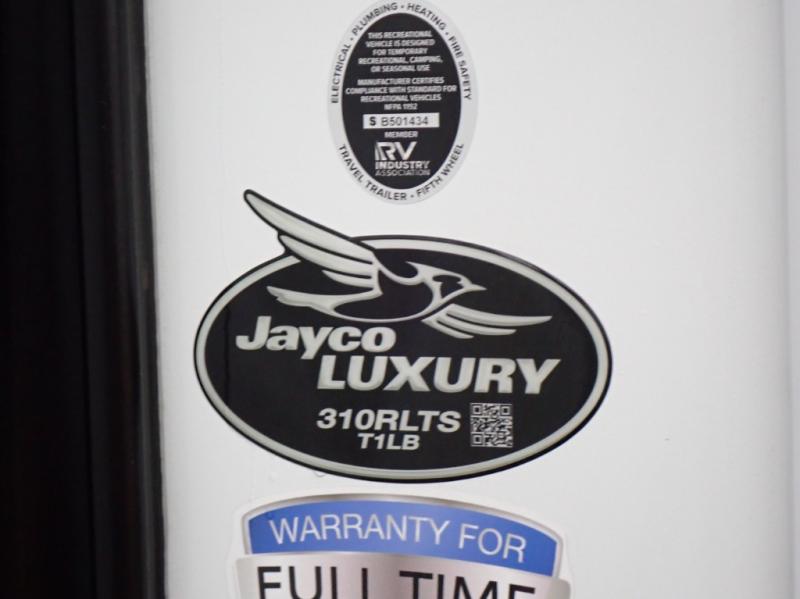 This North Point has a large rear living room with a tri-fold sofa, theater seating, entertainment center, and fireplace. The North Point 310RLTS is backed by Jayco's industry best 2-year full-time use warranty.