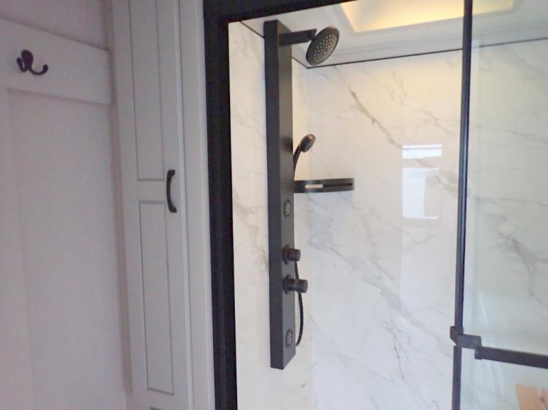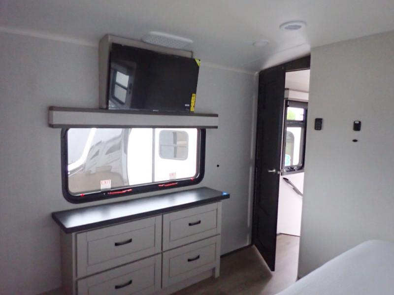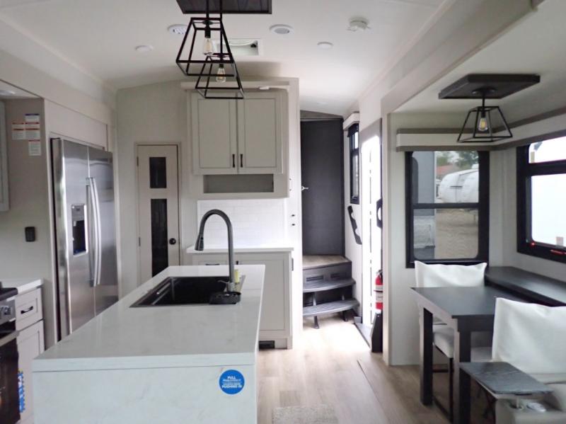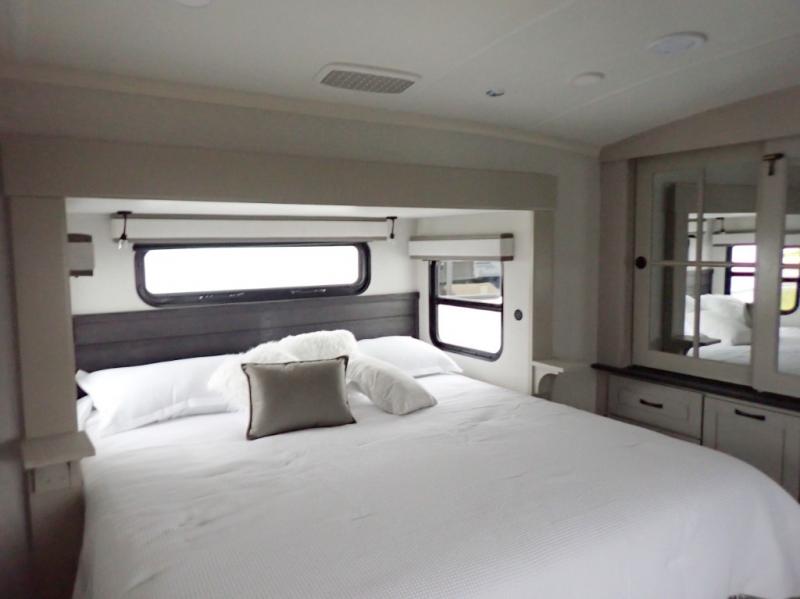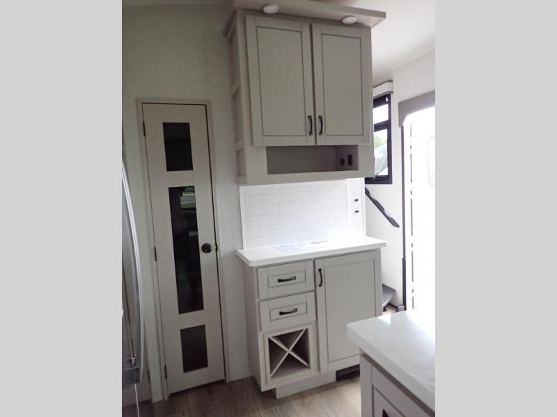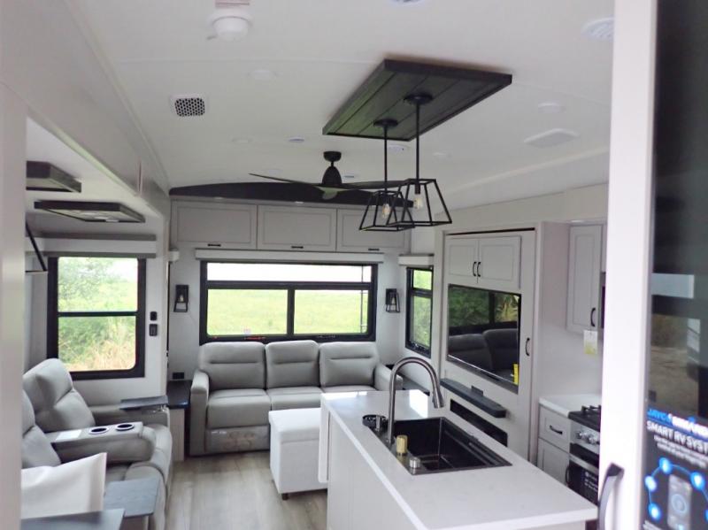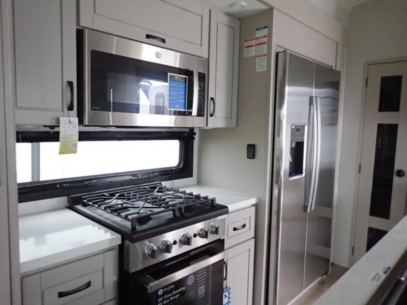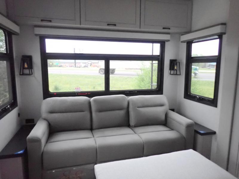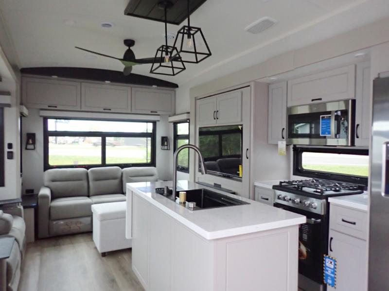 Whether you want to live in this fifth wheel or travel for long periods at a time, you will enjoy the spacious main living and kitchen area with dual slide outs as well as the bedroom with a slide out king bed. You will also find a walk-in closet with hamper and prepped space for a washer/dryer option, and a flip-top dresser with 32" TV. Easily get cleaned up in the full bathroom which also has linen storage. The cook will have a residential refrigerator to store all the cold items and beverages, a kitchen island, a pantry and a residential 24" stove. The 50" Smart LED HDTV with fully digital HDMI output and home entertainment system with subwoofer and fireplace below will provide a cozy place to watch your shows while relaxing on the theater seats, the tri-fold sofa, or the roll-top dinette table.