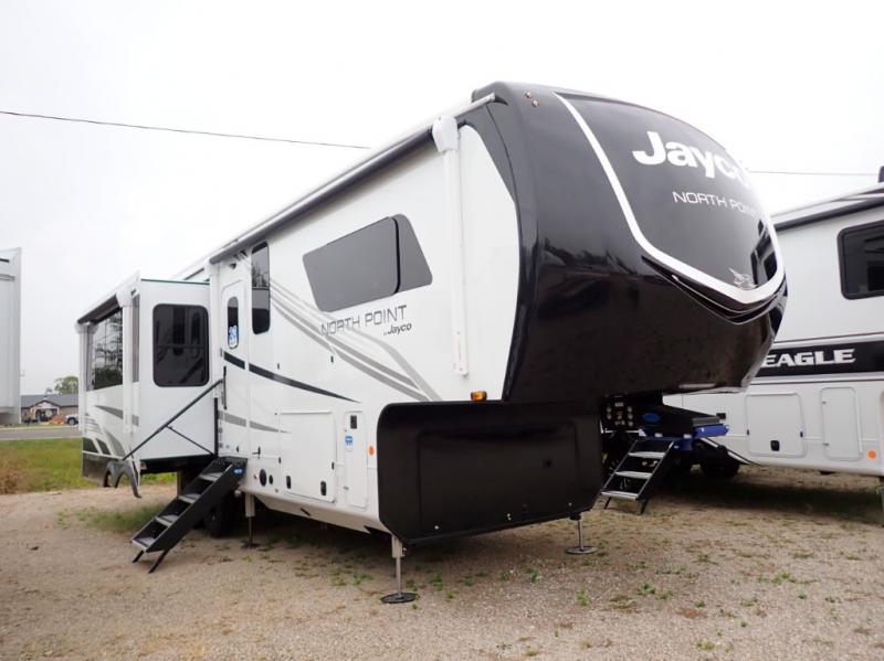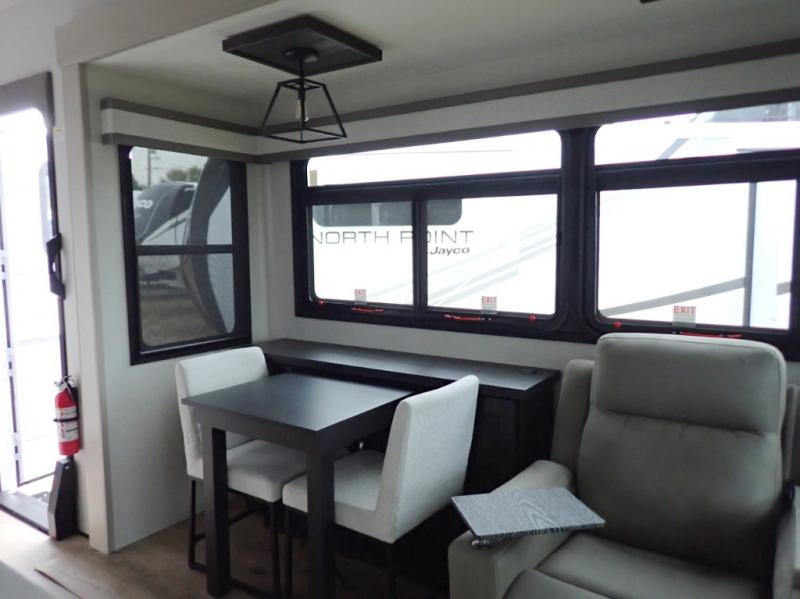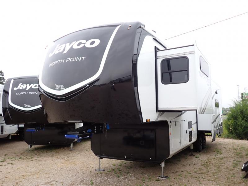 With any North Point fifth wheel by Jayco you begin with a strong foundation with a custom frame, designed and sized specifically to best support each unit. Constructed with Stronghold VBL™ aluminum framed, vacuum bond laminated walls and the Magnum Truss™ XL6™ roof system with an Alpha roof membrane system, which is the strongest tested roof in the industry. The 5-Star Handling package is included with Uniroyal tires, a MORryde rubber pin box, Dexter axles with Nev-R-Adjust brakes, MORryde CRE-3000 rubberized suspension and wet bolt fasteners and bronze bushings. The interior has handcrafted hardwood glazed doors and drawers, vinyl flooring throughout, an integrated under-mount sink in the main bathroom, plus so much more you just have to see one to believe it all!