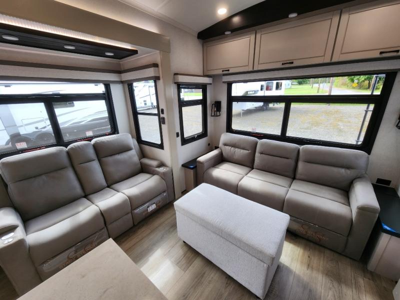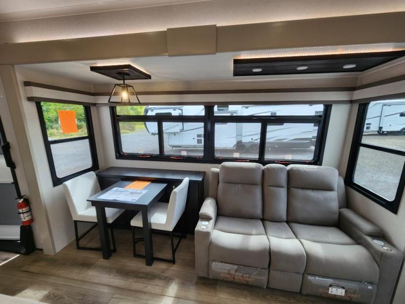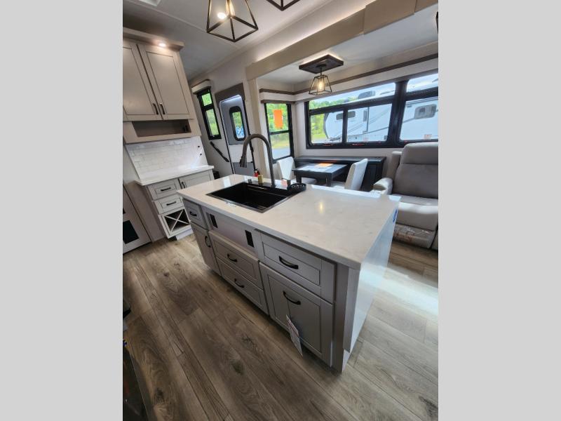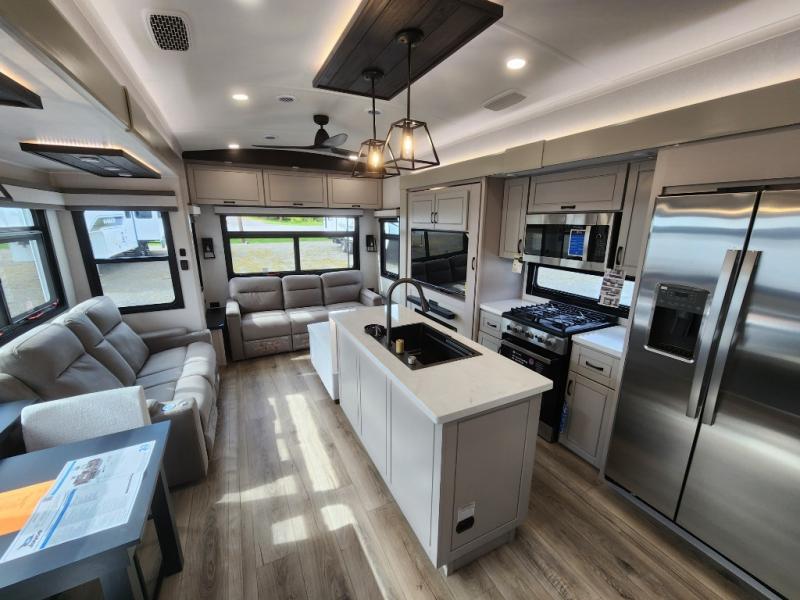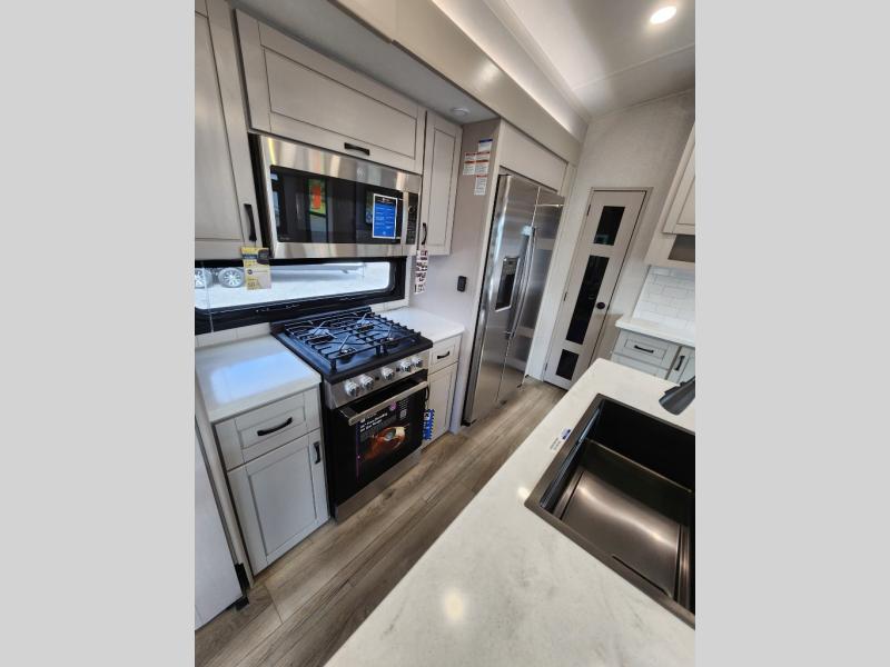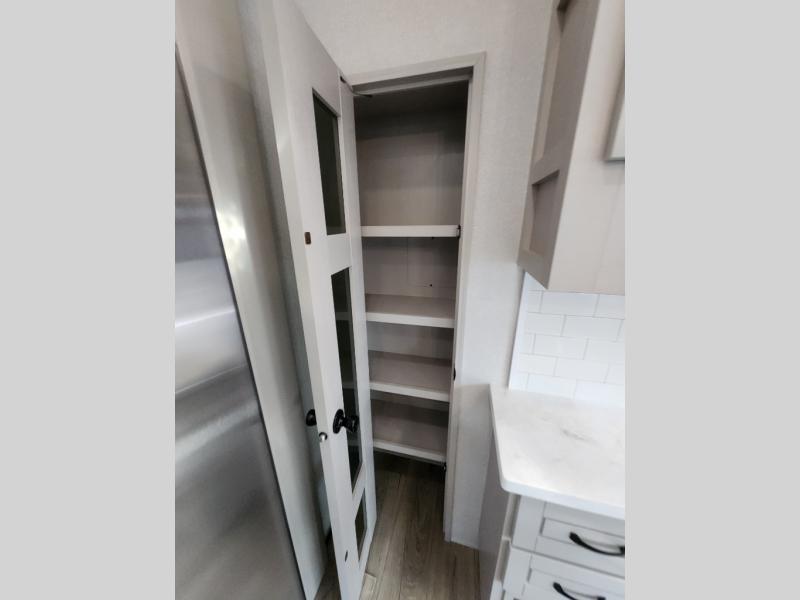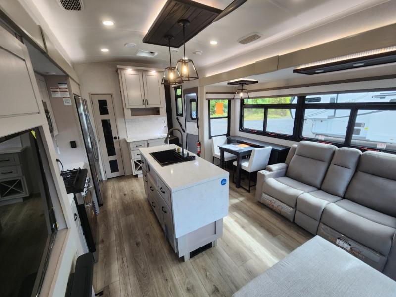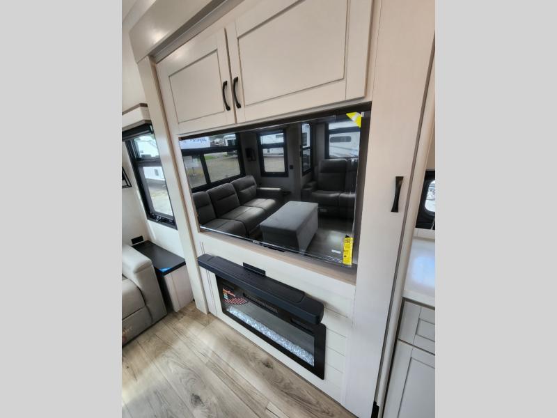 Whether you want to live in this fifth wheel or travel for long periods at a time, you will enjoy the spacious main living and kitchen area with dual slide outs as well as the bedroom with a slide out king bed. You will also find a walk-in closet with hamper and prepped space for a washer/dryer option, and a flip-top dresser with 32" TV. Easily get cleaned up in the full bathroom which also has linen storage. The cook will have a residential refrigerator to store all the cold items and beverages, a kitchen island, a pantry and a residential 24" stove. The 50" Smart LED HDTV with fully digital HDMI output and home entertainment system with subwoofer and fireplace below will provide a cozy place to watch your shows while relaxing on the theater seats, the tri-fold sofa, or the roll-top dinette table.