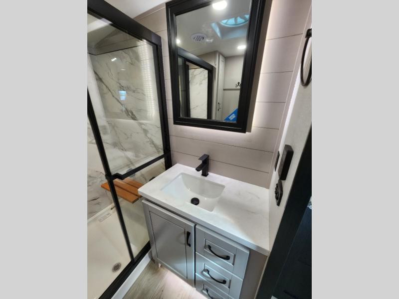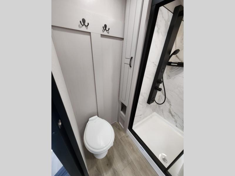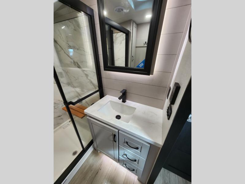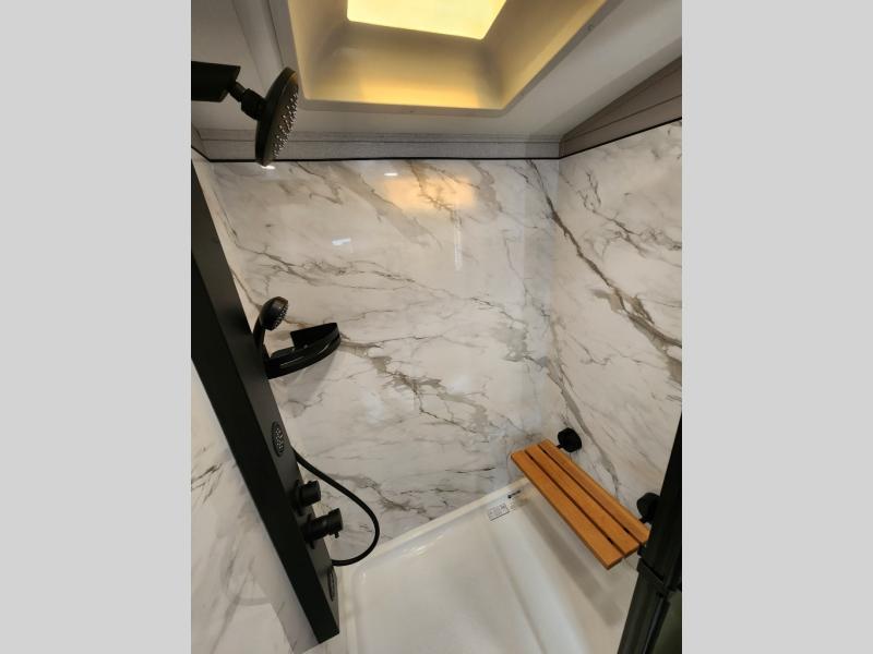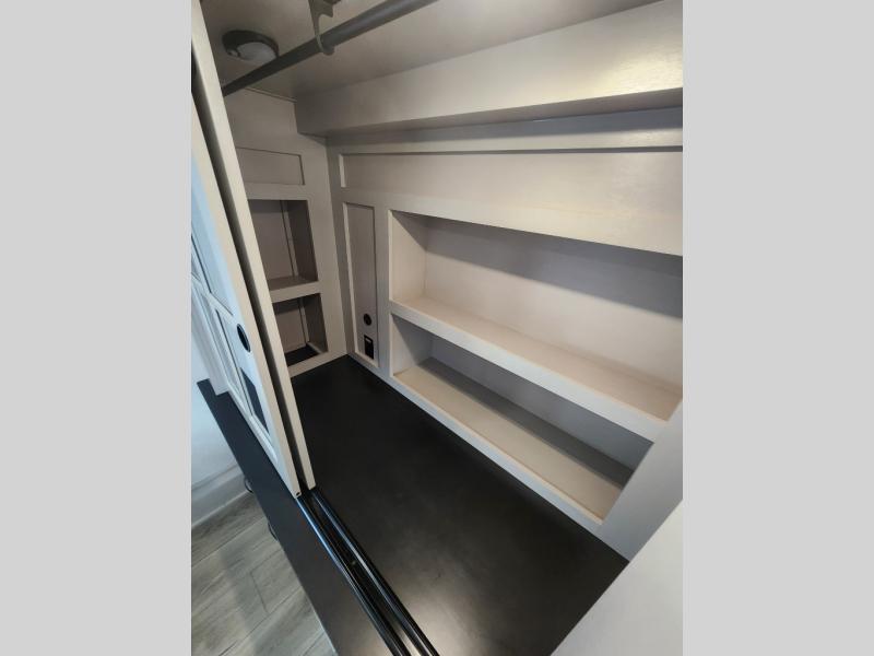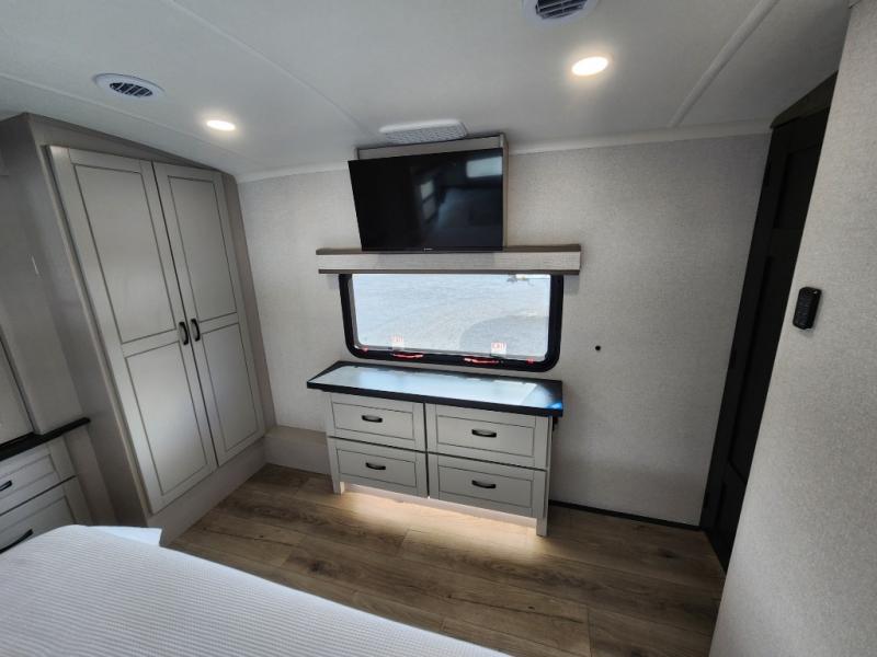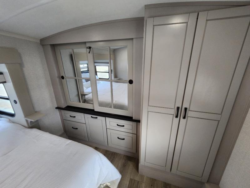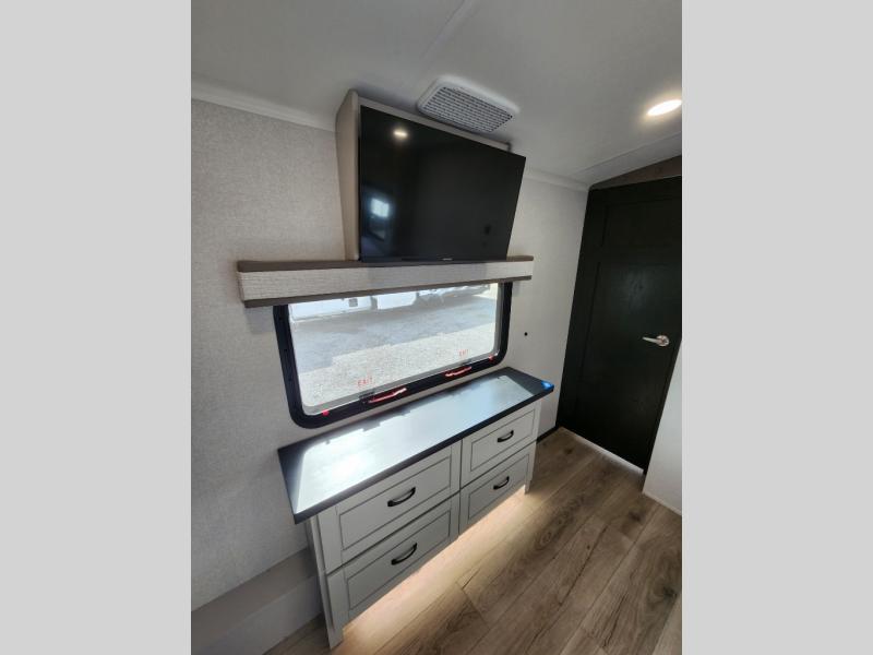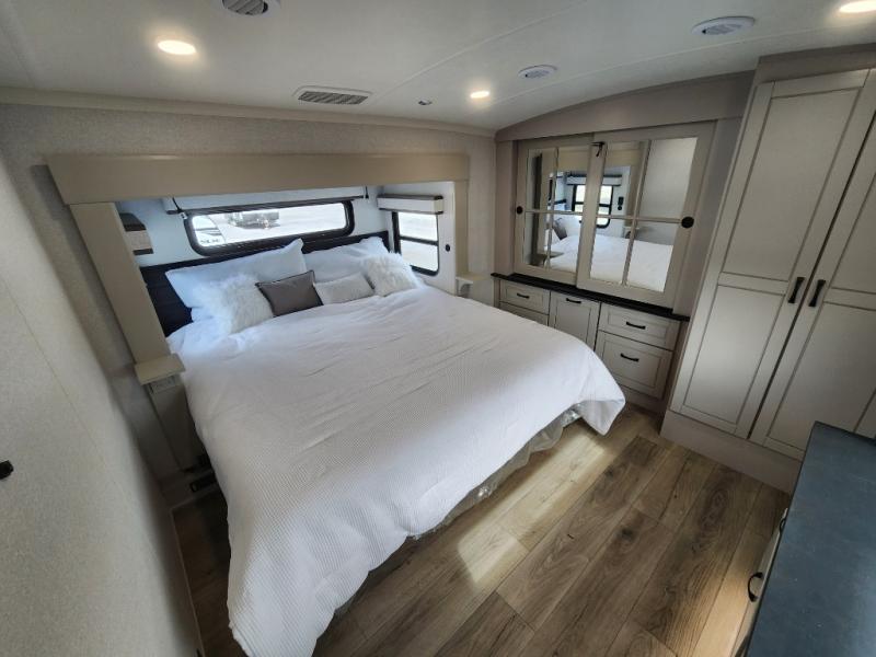 Whether you want to live in this fifth wheel or travel for long periods at a time, you will enjoy the spacious main living and kitchen area with dual slide outs as well as the bedroom with a slide out king bed. You will also find a walk-in closet with hamper and prepped space for a washer/dryer option, and a flip-top dresser with 32" TV. Easily get cleaned up in the full bathroom which also has linen storage. The cook will have a residential refrigerator to store all the cold items and beverages, a kitchen island, a pantry and a residential 24" stove. The 50" Smart LED HDTV with fully digital HDMI output and home entertainment system with subwoofer and fireplace below will provide a cozy place to watch your shows while relaxing on the theater seats, the tri-fold sofa, or the roll-top dinette table.