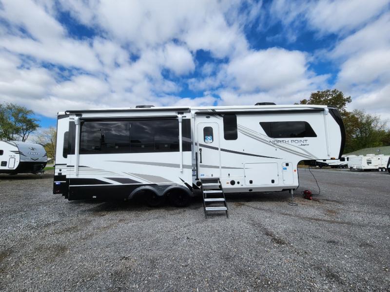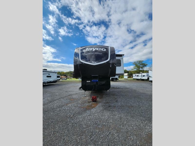 With any North Point fifth wheel by Jayco you begin with a strong foundation with a custom frame, designed and sized specifically to best support each unit. Constructed with Stronghold VBL™ aluminum framed, vacuum bond laminated walls and the Magnum Truss™ XL6™ roof system with an Alpha roof membrane system, which is the strongest tested roof in the industry. The 5-Star Handling package is included with Uniroyal tires, a MORryde rubber pin box, Dexter axles with Nev-R-Adjust brakes, MORryde CRE-3000 rubberized suspension and wet bolt fasteners and bronze bushings. The interior has handcrafted hardwood glazed doors and drawers, vinyl flooring throughout, an integrated under-mount sink in the main bathroom, plus so much more you just have to see one to believe it all!