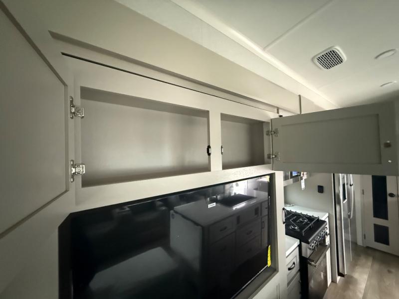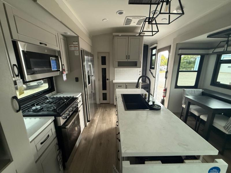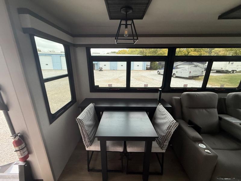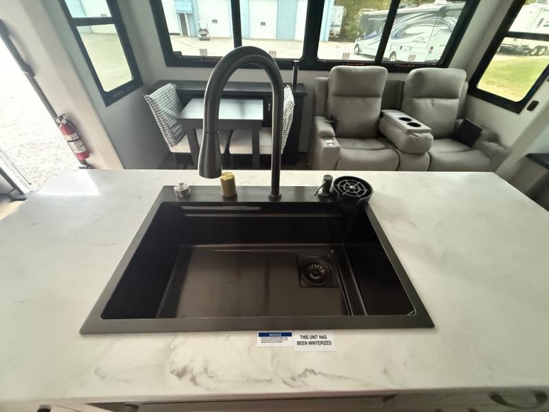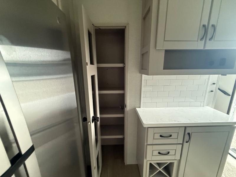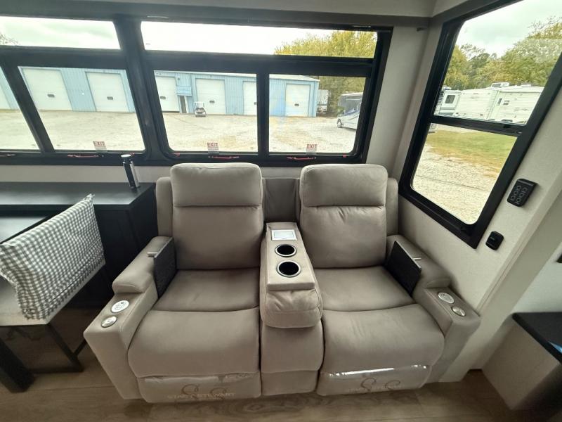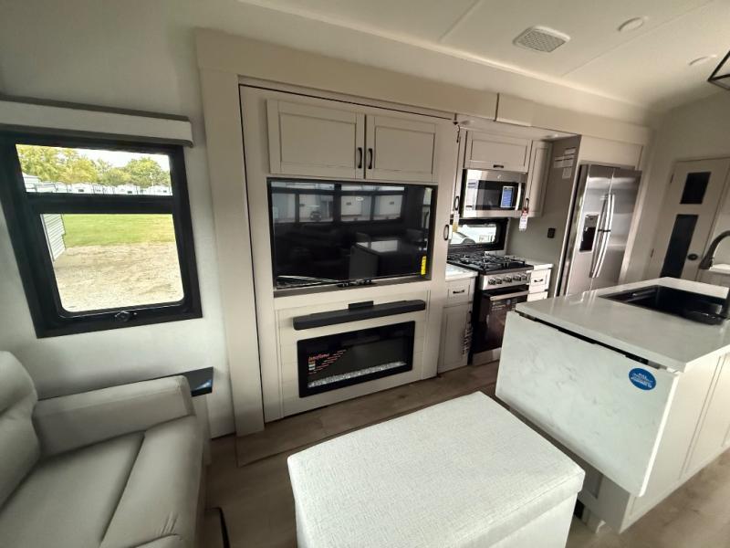 Whether you want to live in this fifth wheel or travel for long periods at a time, you will enjoy the spacious main living and kitchen area with dual slide outs as well as the bedroom with a slide out king bed. You will also find a walk-in closet with hamper and prepped space for a washer/dryer option, and a flip-top dresser with 32" TV. Easily get cleaned up in the full bathroom which also has linen storage. The cook will have a residential refrigerator to store all the cold items and beverages, a kitchen island, a pantry and a residential 24" stove. The 50" Smart LED HDTV with fully digital HDMI output and home entertainment system with subwoofer and fireplace below will provide a cozy place to watch your shows while relaxing on the theater seats, the tri-fold sofa, or the roll-top dinette table.