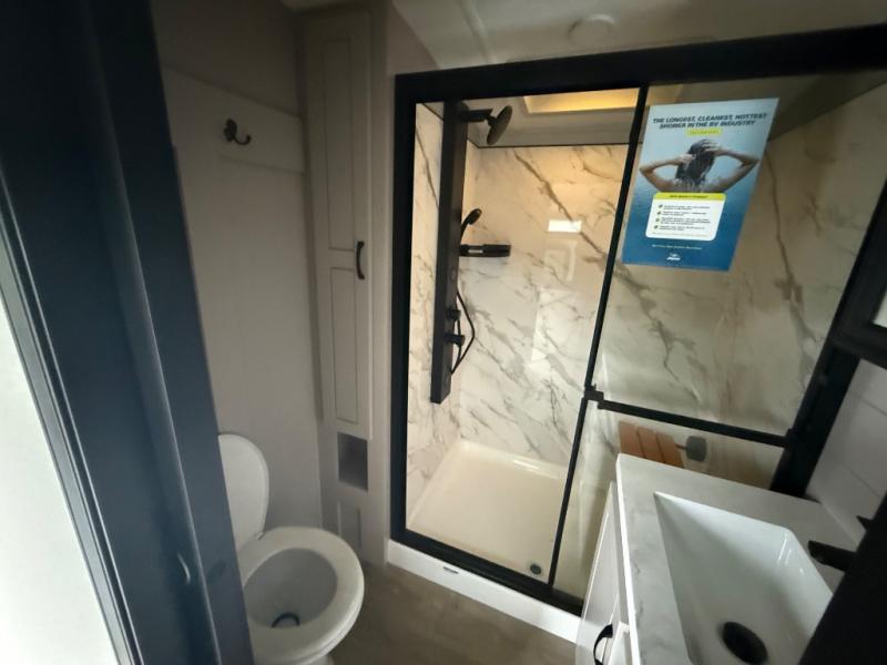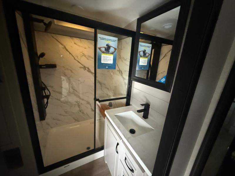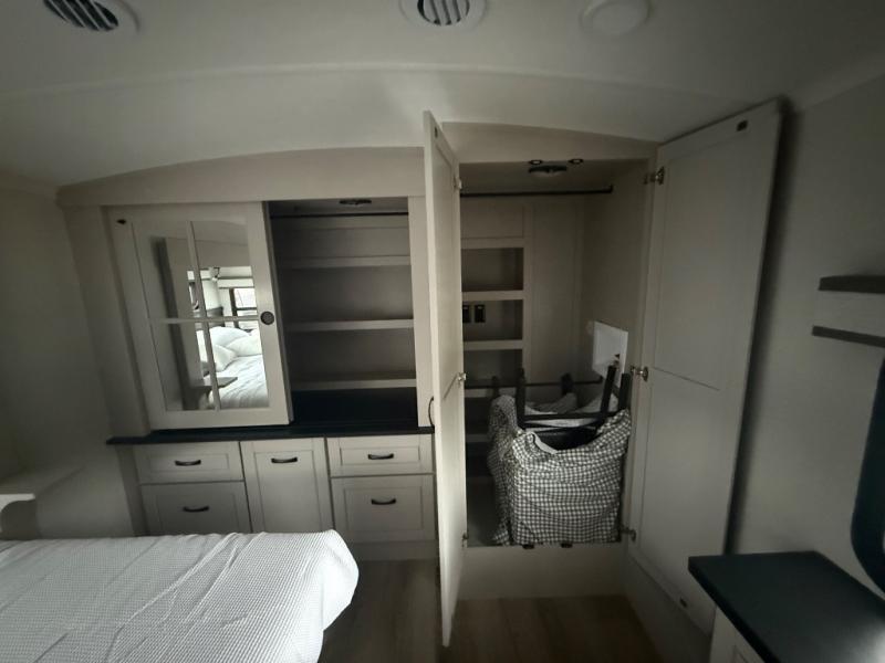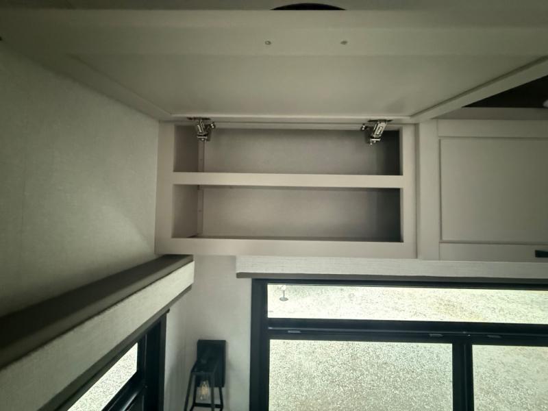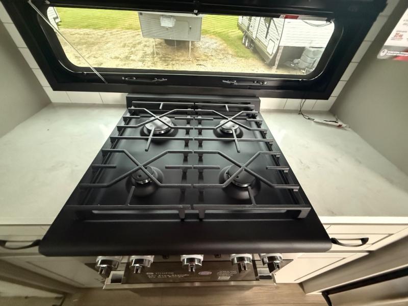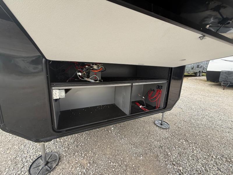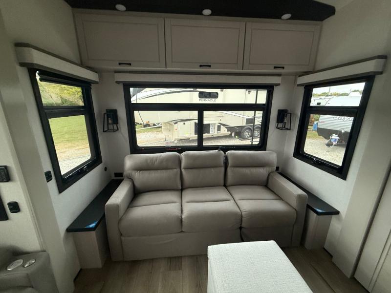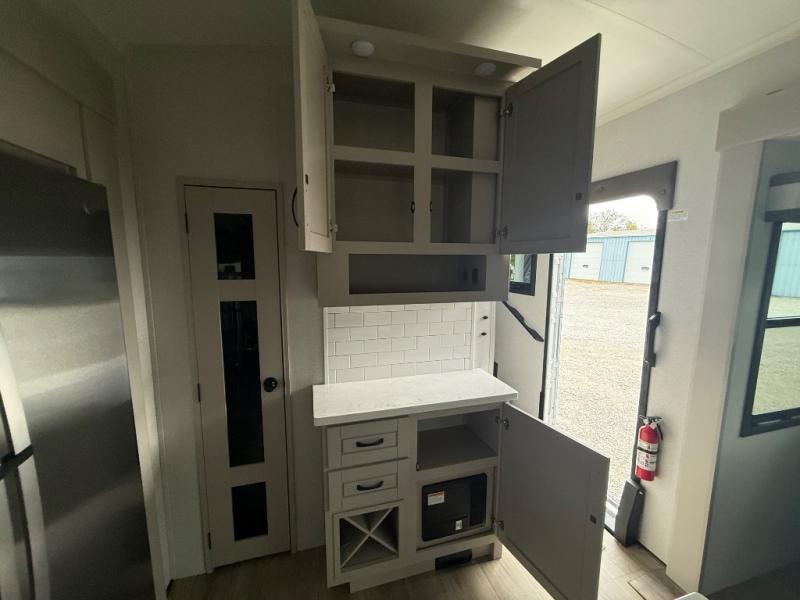 Whether you want to live in this fifth wheel or travel for long periods at a time, you will enjoy the spacious main living and kitchen area with dual slide outs as well as the bedroom with a slide out king bed. You will also find a walk-in closet with hamper and prepped space for a washer/dryer option, and a flip-top dresser with 32" TV. Easily get cleaned up in the full bathroom which also has linen storage. The cook will have a residential refrigerator to store all the cold items and beverages, a kitchen island, a pantry and a residential 24" stove. The 50" Smart LED HDTV with fully digital HDMI output and home entertainment system with subwoofer and fireplace below will provide a cozy place to watch your shows while relaxing on the theater seats, the tri-fold sofa, or the roll-top dinette table.