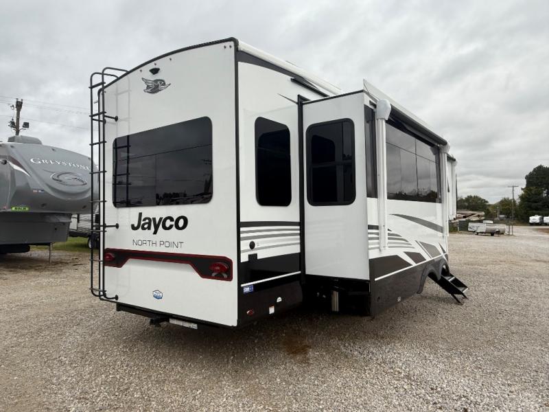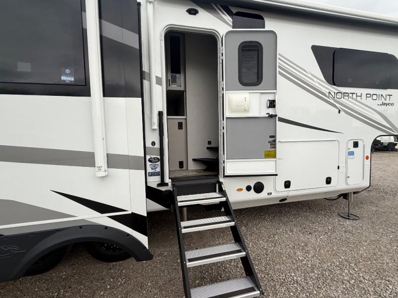 With any North Point fifth wheel by Jayco you begin with a strong foundation with a custom frame, designed and sized specifically to best support each unit. Constructed with Stronghold VBL™ aluminum framed, vacuum bond laminated walls and the Magnum Truss™ XL6™ roof system with an Alpha roof membrane system, which is the strongest tested roof in the industry. The 5-Star Handling package is included with Uniroyal tires, a MORryde rubber pin box, Dexter axles with Nev-R-Adjust brakes, MORryde CRE-3000 rubberized suspension and wet bolt fasteners and bronze bushings. The interior has handcrafted hardwood glazed doors and drawers, vinyl flooring throughout, an integrated under-mount sink in the main bathroom, plus so much more you just have to see one to believe it all!