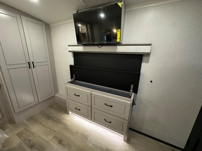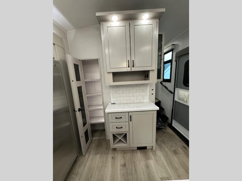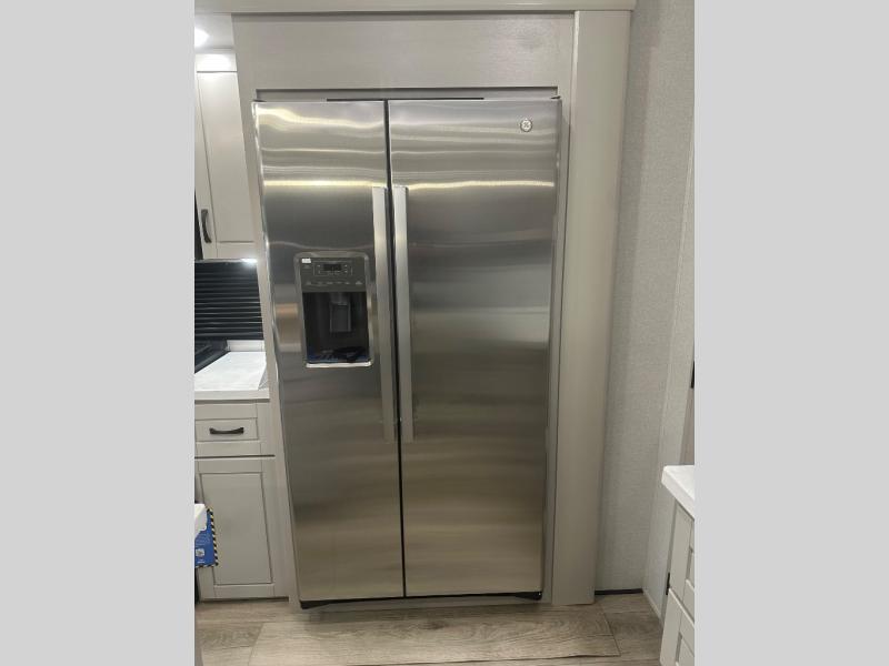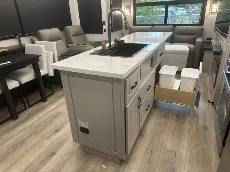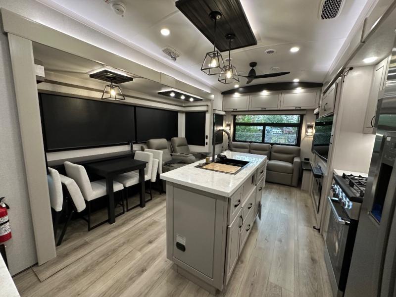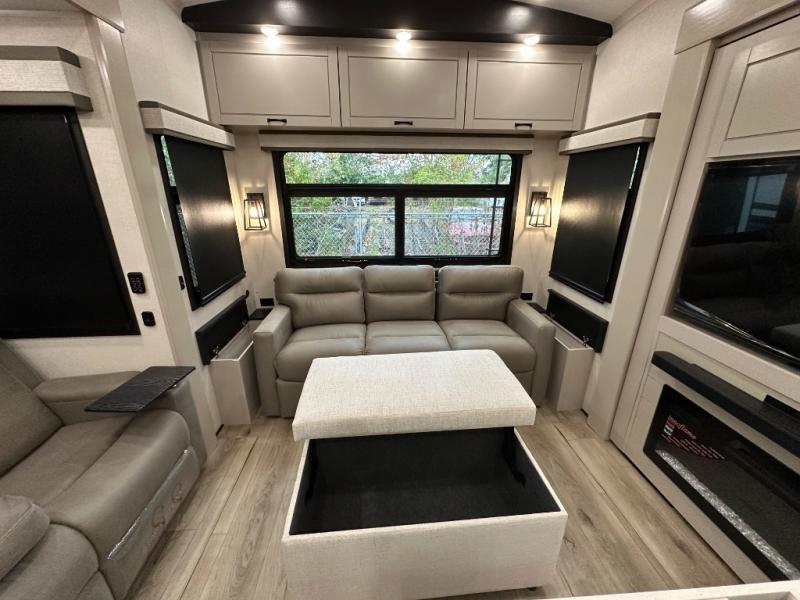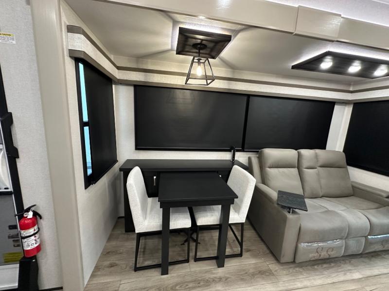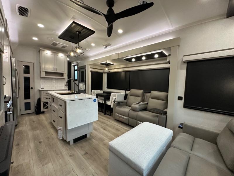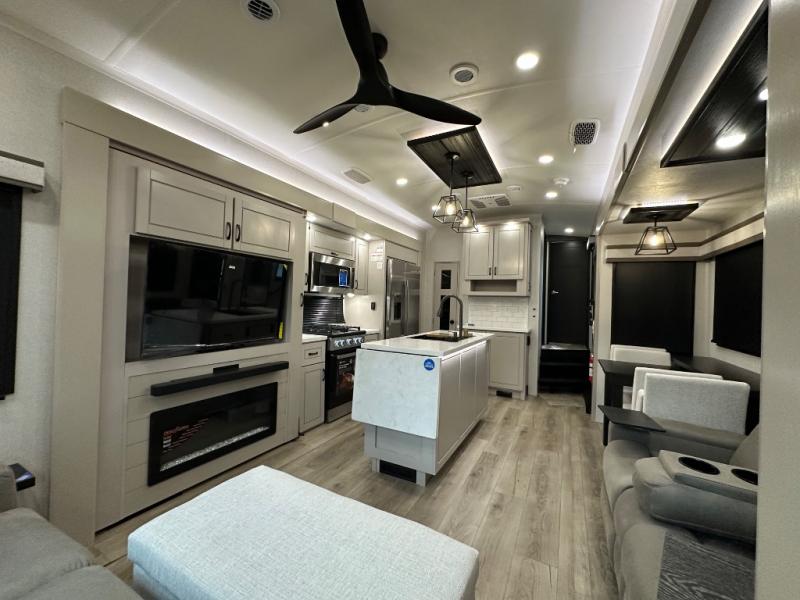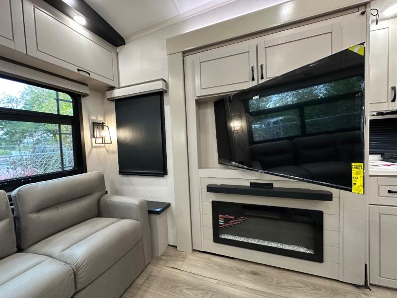 Whether you want to live in this fifth wheel or travel for long periods at a time, you will enjoy the spacious main living and kitchen area with dual slide outs as well as the bedroom with a slide out king bed. You will also find a walk-in closet with hamper and prepped space for a washer/dryer option, and a flip-top dresser with 32" TV. Easily get cleaned up in the full bathroom which also has linen storage. The cook will have a residential refrigerator to store all the cold items and beverages, a kitchen island, a pantry and a residential 24" stove. The 50" Smart LED HDTV with fully digital HDMI output and home entertainment system with subwoofer and fireplace below will provide a cozy place to watch your shows while relaxing on the theater seats, the tri-fold sofa, or the roll-top dinette table.