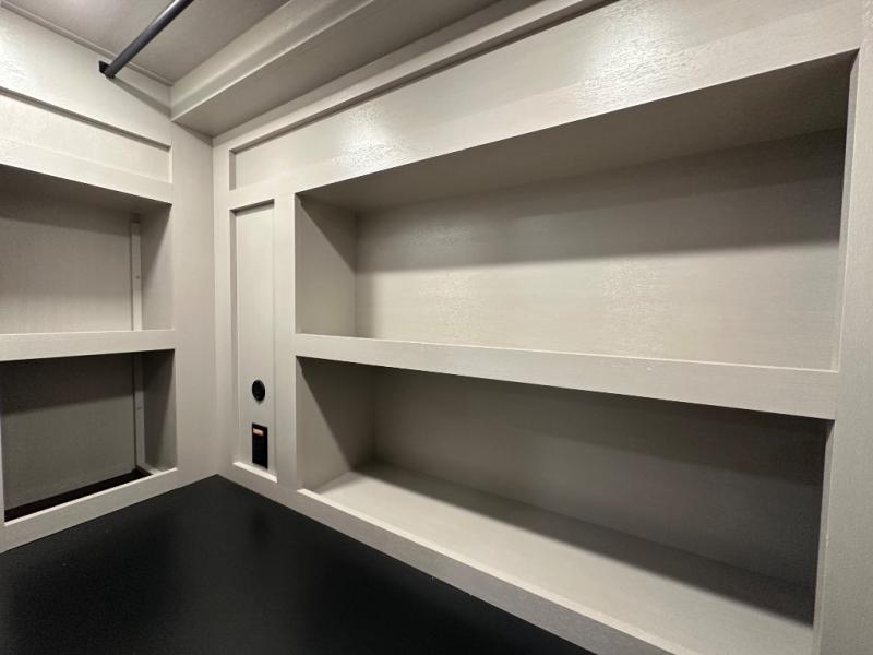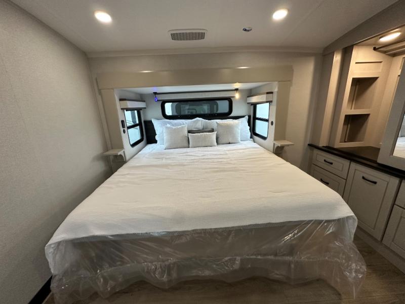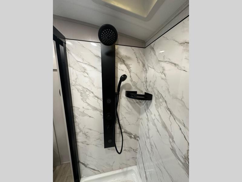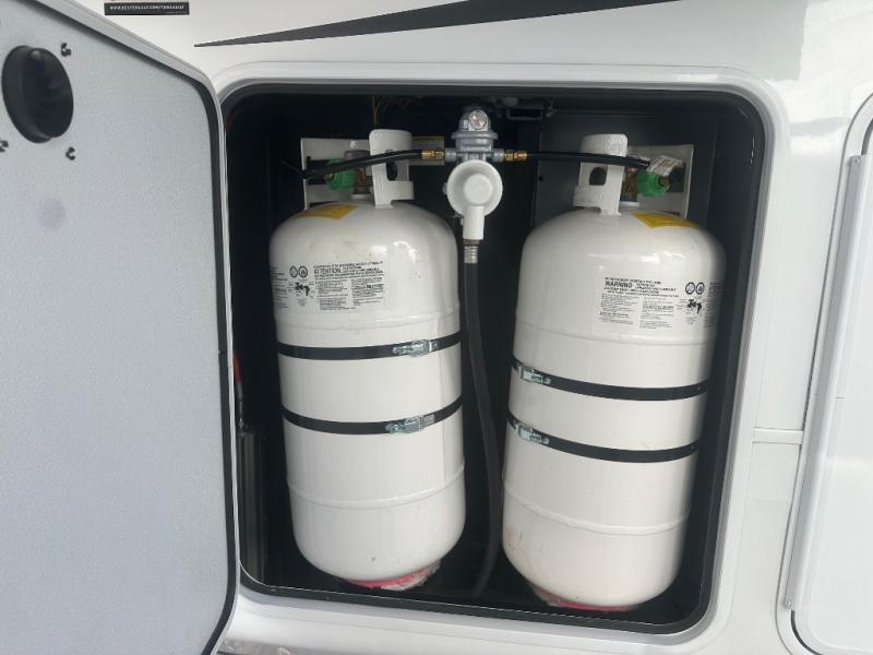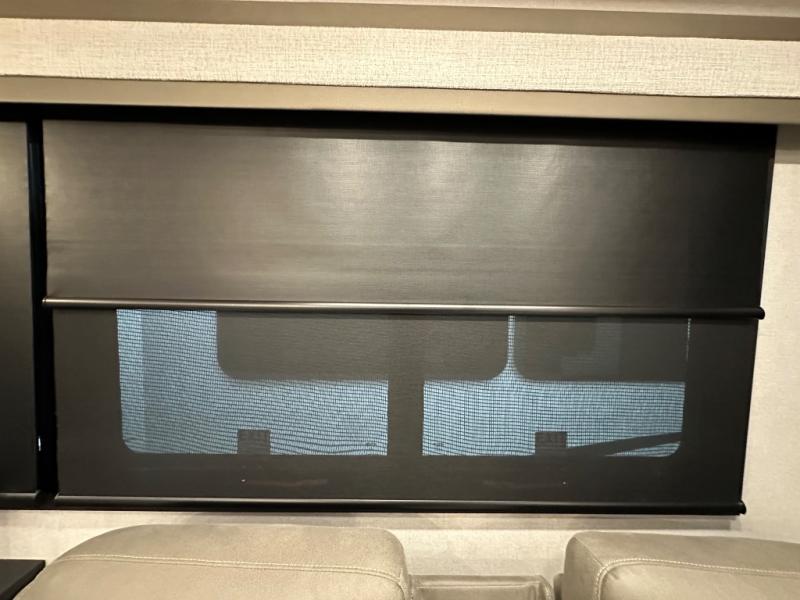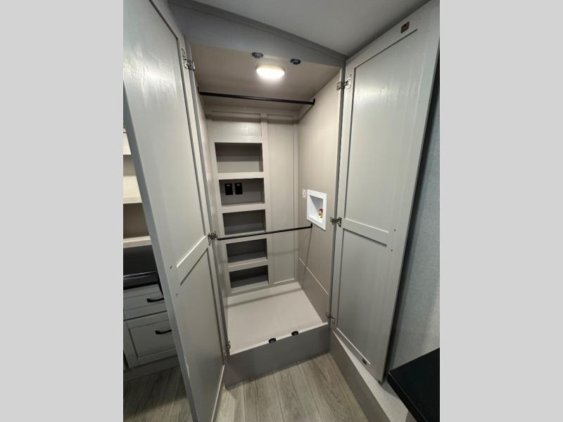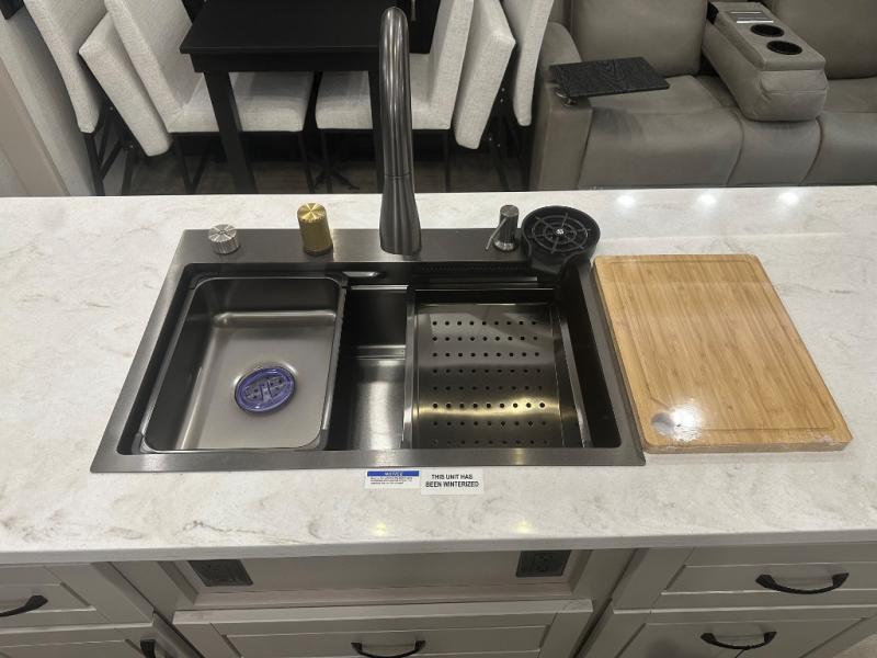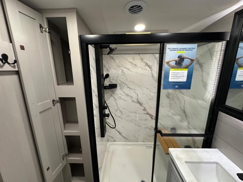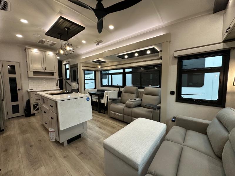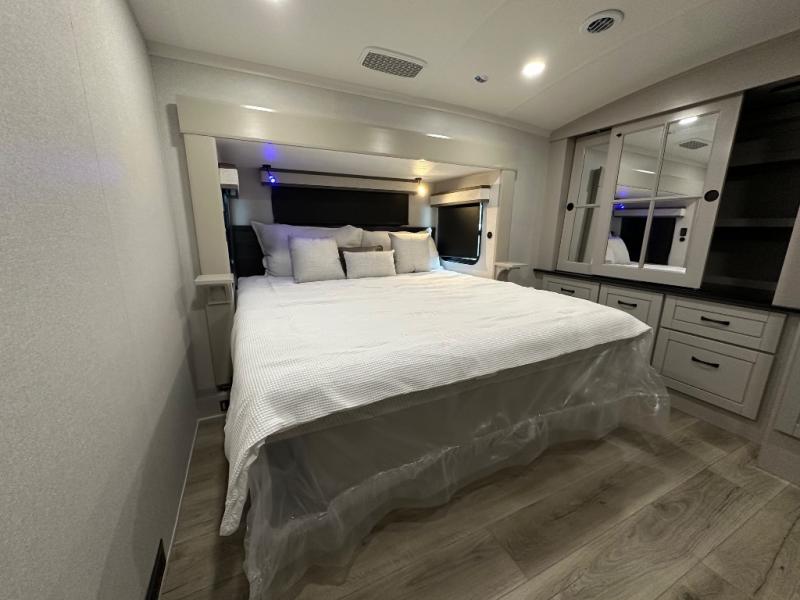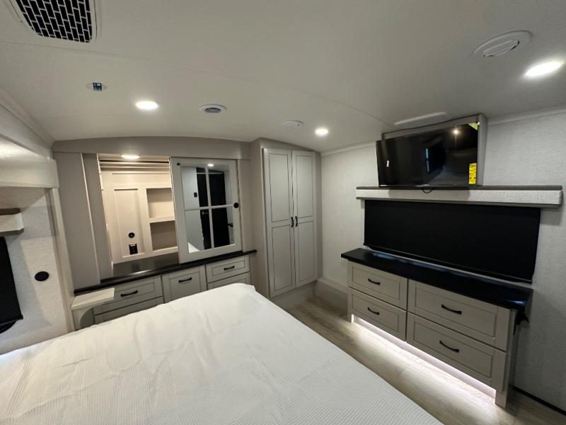 Whether you want to live in this fifth wheel or travel for long periods at a time, you will enjoy the spacious main living and kitchen area with dual slide outs as well as the bedroom with a slide out king bed. You will also find a walk-in closet with hamper and prepped space for a washer/dryer option, and a flip-top dresser with 32" TV. Easily get cleaned up in the full bathroom which also has linen storage. The cook will have a residential refrigerator to store all the cold items and beverages, a kitchen island, a pantry and a residential 24" stove. The 50" Smart LED HDTV with fully digital HDMI output and home entertainment system with subwoofer and fireplace below will provide a cozy place to watch your shows while relaxing on the theater seats, the tri-fold sofa, or the roll-top dinette table.