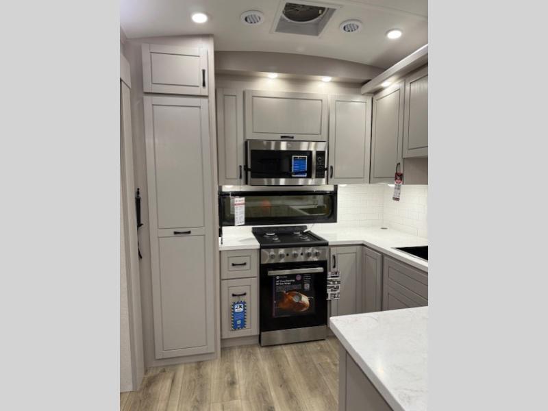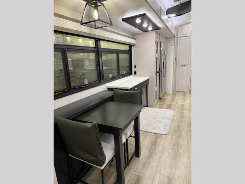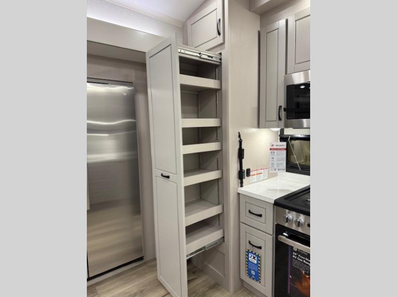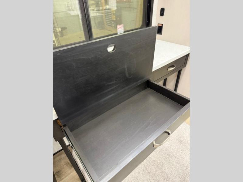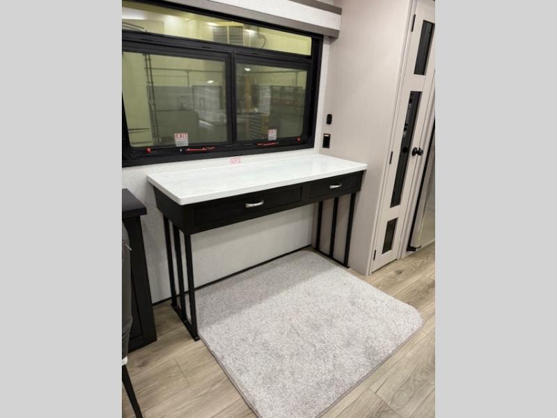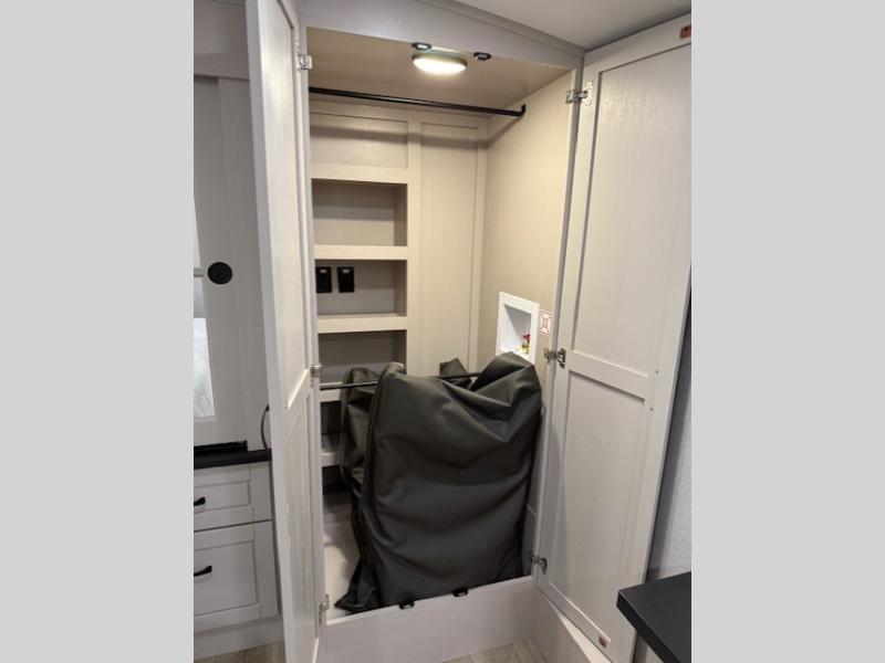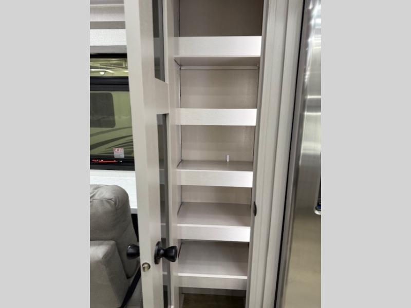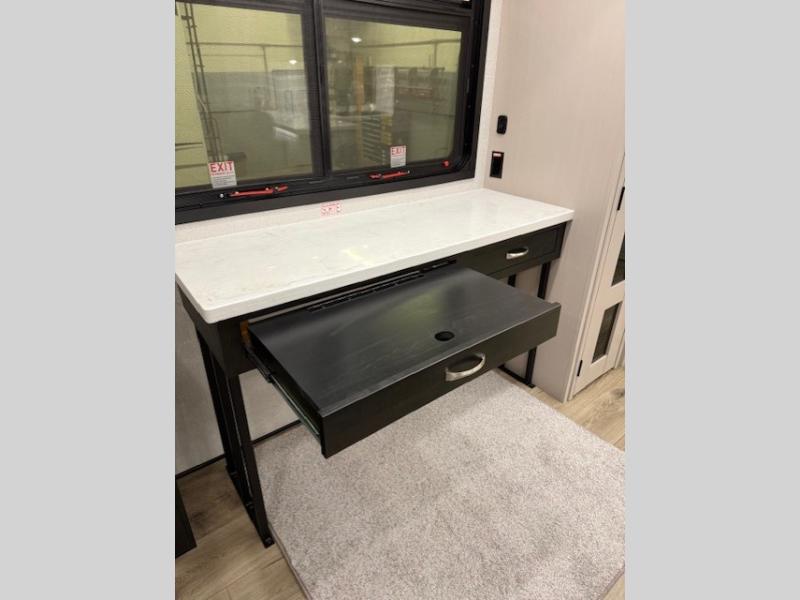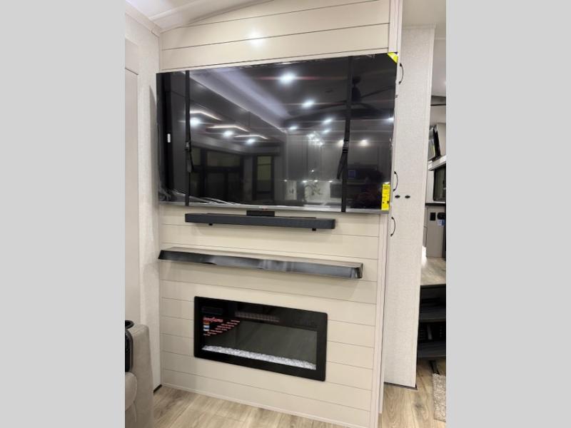 You can't go wrong when camping in this triple slide out fifth wheel! Once you've arrived at your destination and unloaded the pass-through storage, you can make lunch in the rear kitchen with generous counter space. There are also two pantries, one being a pull-out, plus a convenient pull-out butcher block so you can chop fresh veggies! You can enjoy your meal at the roll-top dinette with chairs, and if you need to get some work done, the desk/coffee bar will provide a space for your laptop. An L-shaped sofa and theater seat in the main living area will create an inviting space, plus there is a 65" TV and a mantle with a fireplace just like at home! Freshen up in the full bath at the end of the day, then head to the front private bedroom for a great night's rest on the king bed slide out. There is a closet with drawers and a hamper below, a chest with a TV, plus washer and dryer prep for the option to add these appliances; how convenient!