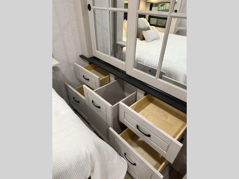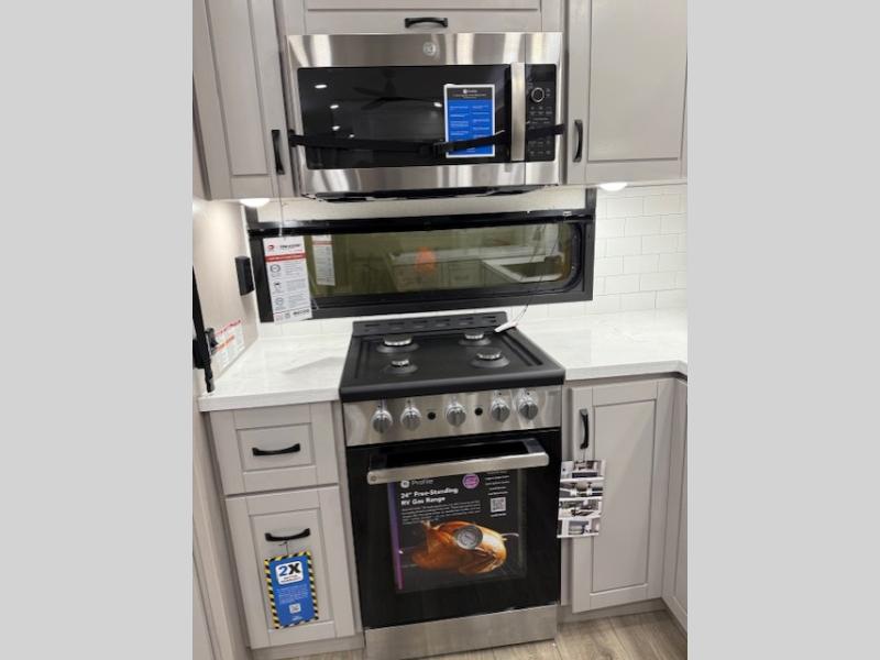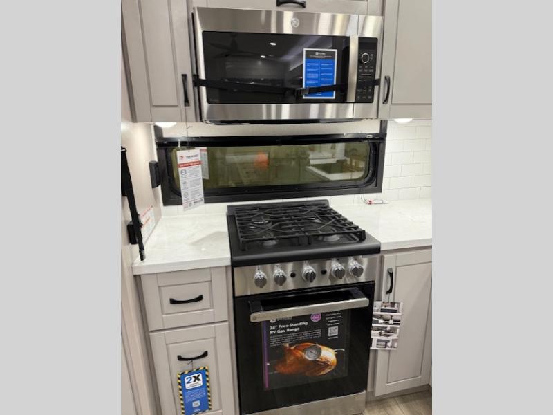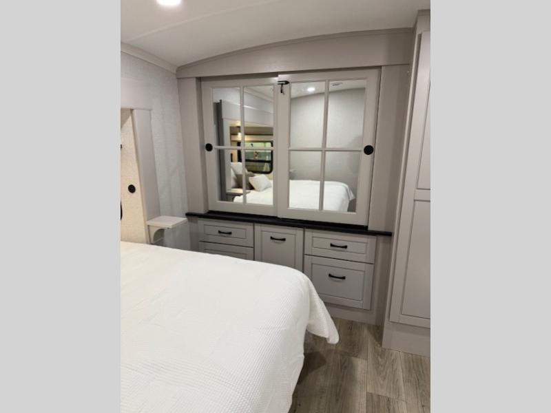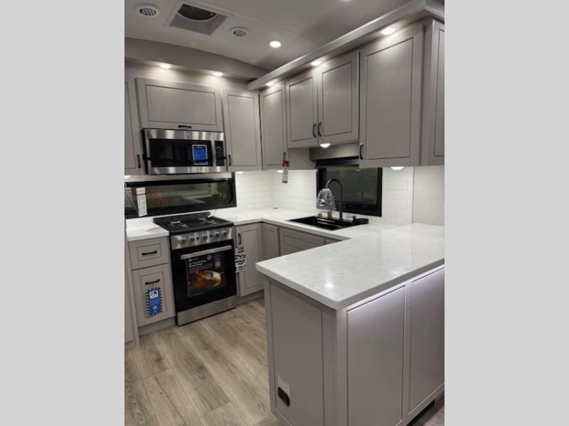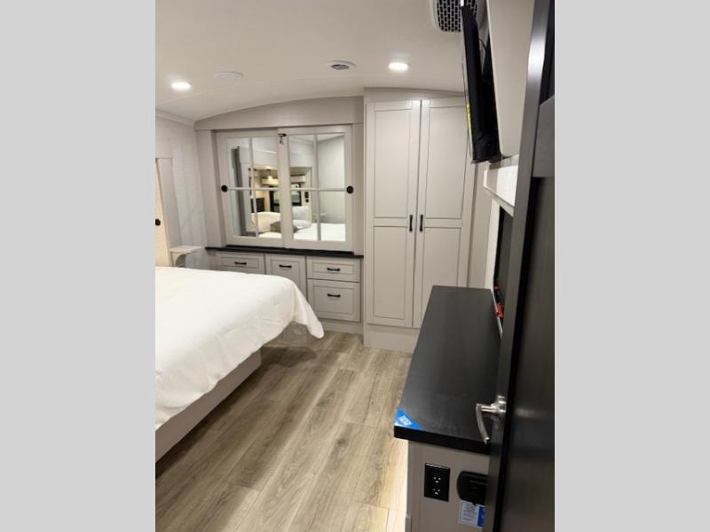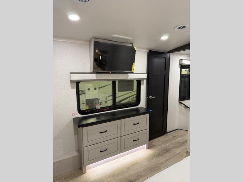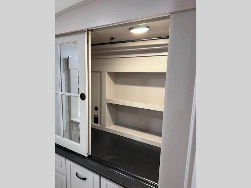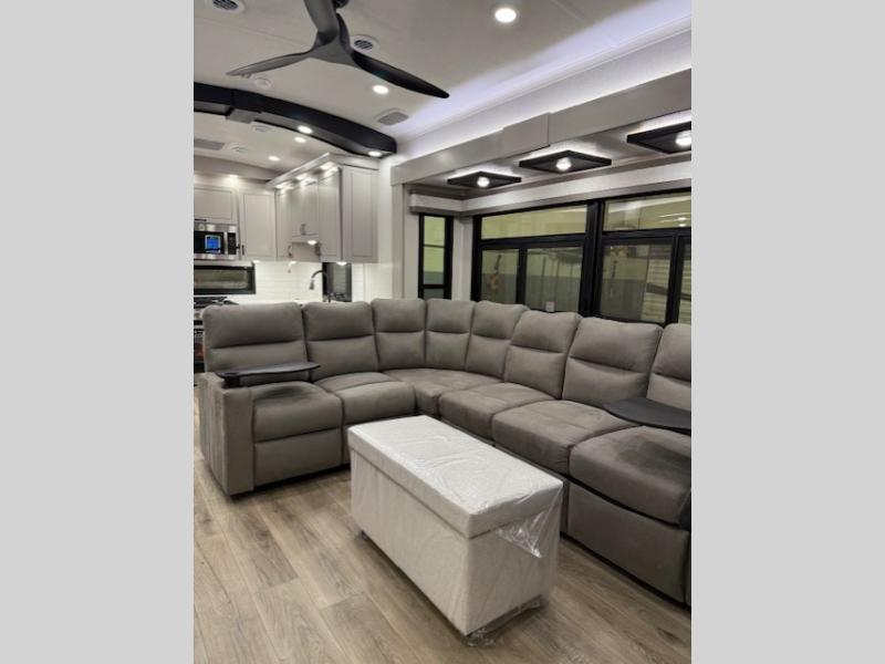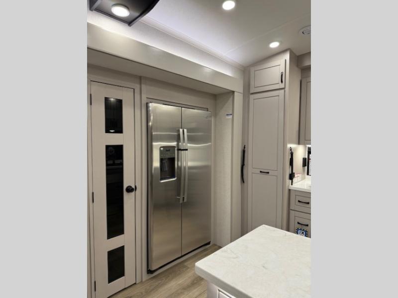 You can't go wrong when camping in this triple slide out fifth wheel! Once you've arrived at your destination and unloaded the pass-through storage, you can make lunch in the rear kitchen with generous counter space. There are also two pantries, one being a pull-out, plus a convenient pull-out butcher block so you can chop fresh veggies! You can enjoy your meal at the roll-top dinette with chairs, and if you need to get some work done, the desk/coffee bar will provide a space for your laptop. An L-shaped sofa and theater seat in the main living area will create an inviting space, plus there is a 65" TV and a mantle with a fireplace just like at home! Freshen up in the full bath at the end of the day, then head to the front private bedroom for a great night's rest on the king bed slide out. There is a closet with drawers and a hamper below, a chest with a TV, plus washer and dryer prep for the option to add these appliances; how convenient!
