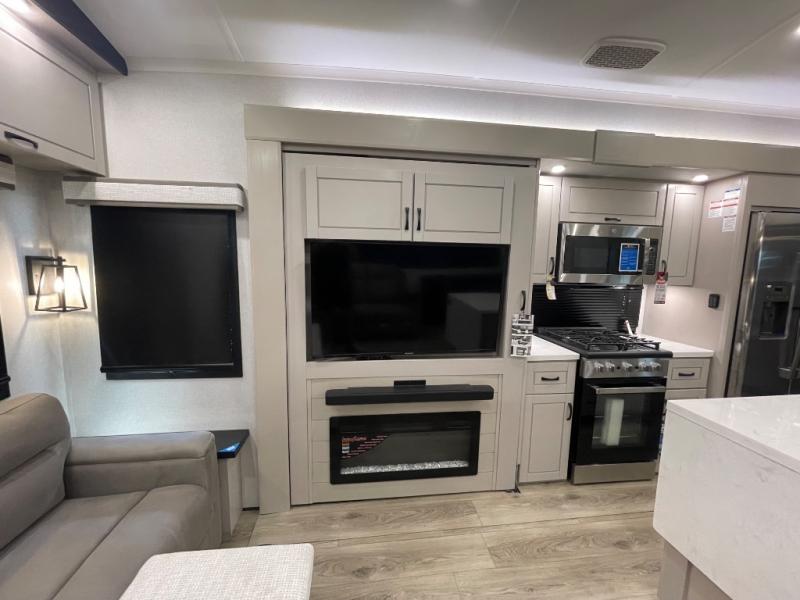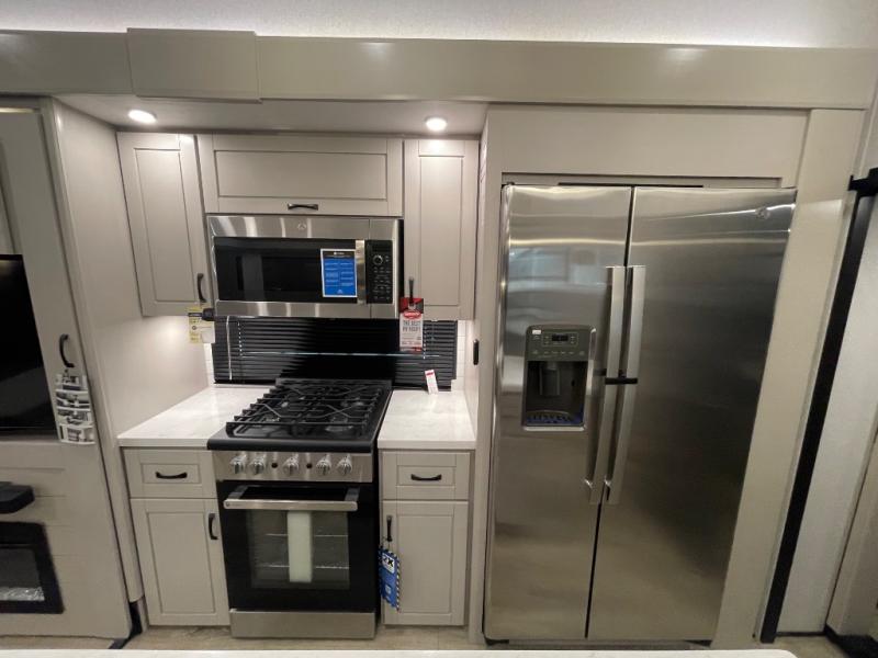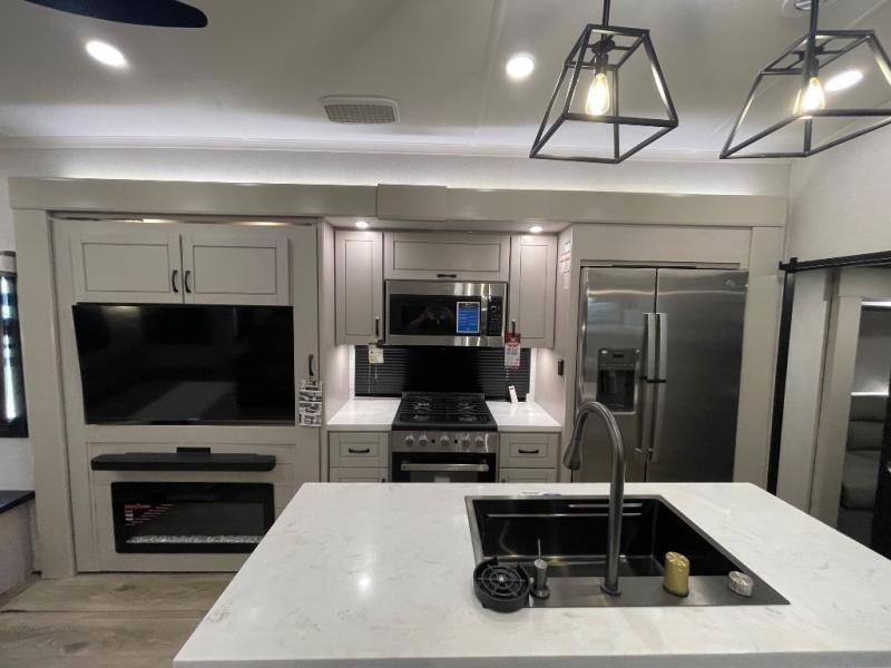 You can work from anywhere with this fifth wheel thanks to the middle bonus room that offers a desk with TV above, a tri-fold sofa with removable table, a flip-up bunk and a closet. This multi-use room works for just about anything including an extra living area and bunkhouse. The shoe storage under the interior steps, the linen cabinet in the full bathroom, the walk-in closet in the bedroom, and the overhead cabinets plus exterior storage allows you to bring whatever you want. Enjoy cooking in the kitchen that provides an island with a flip-up butcher block, a residential refrigerator, a pantry, and everything you need to keep everyone fed. The theater seats, the tri-fold sofa and the free standing table without a pedestal are great places to sit while watching the 50" Smart LED HDTV with fully digital HDMI output and home entertainment system with subwoofer, plus there is a fireplace below for those chilly evenings.