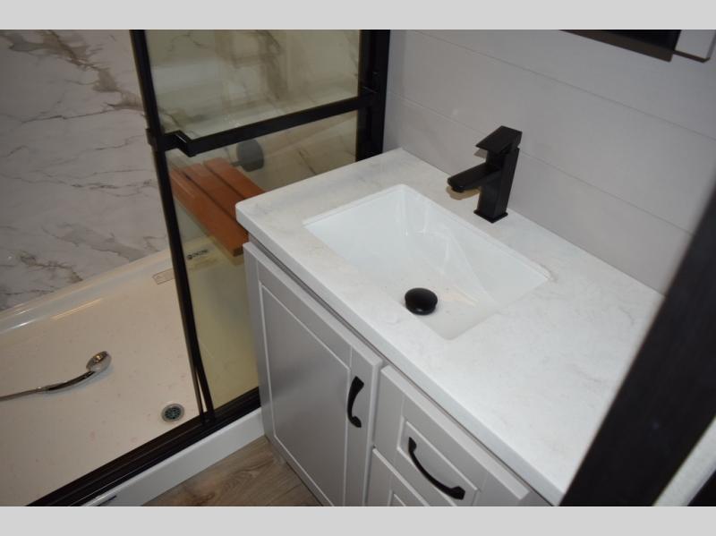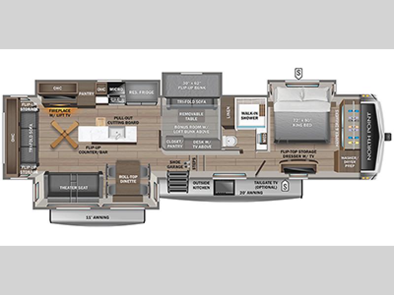 With any North Point fifth wheel by Jayco you begin with a strong foundation with a custom frame, designed and sized specifically to best support each unit. Constructed with Stronghold VBL™ aluminum framed, vacuum bond laminated walls and the Magnum Truss™ XL6™ roof system with an Alpha roof membrane system, which is the strongest tested roof in the industry. The 5-Star Handling package is included with Uniroyal tires, a MORryde rubber pin box, Dexter axles with Nev-R-Adjust brakes, MORryde CRE-3000 rubberized suspension and wet bolt fasteners and bronze bushings. The interior has handcrafted hardwood glazed doors and drawers, vinyl flooring throughout, an integrated under-mount sink in the main bathroom, plus so much more you just have to see one to believe it all!