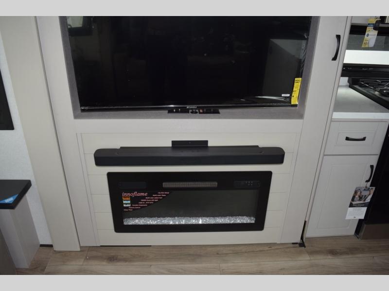 You can work from anywhere with this fifth wheel thanks to the middle bonus room that offers a desk with TV above, a tri-fold sofa with removable table, a flip-up bunk and a closet. This multi-use room works for just about anything including an extra living area and bunkhouse. The shoe storage under the interior steps, the linen cabinet in the full bathroom, the walk-in closet in the bedroom, and the overhead cabinets plus exterior storage allows you to bring whatever you want. Enjoy cooking in the kitchen that provides an island with a flip-up butcher block, a residential refrigerator, a pantry, and everything you need to keep everyone fed. The theater seats, the tri-fold sofa and the free standing table without a pedestal are great places to sit while watching the 50" Smart LED HDTV with fully digital HDMI output and home entertainment system with subwoofer, plus there is a fireplace below for those chilly evenings.