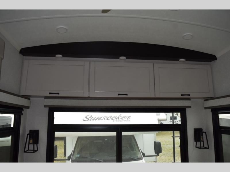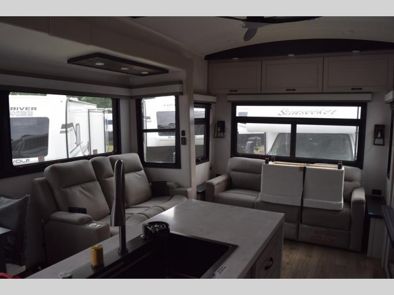 You can work from anywhere with this fifth wheel thanks to the middle bonus room that offers a desk with TV above, a tri-fold sofa with removable table, a flip-up bunk and a closet. This multi-use room works for just about anything including an extra living area and bunkhouse. The shoe storage under the interior steps, the linen cabinet in the full bathroom, the walk-in closet in the bedroom, and the overhead cabinets plus exterior storage allows you to bring whatever you want. Enjoy cooking in the kitchen that provides an island with a flip-up butcher block, a residential refrigerator, a pantry, and everything you need to keep everyone fed. The theater seats, the tri-fold sofa and the free standing table without a pedestal are great places to sit while watching the 50" Smart LED HDTV with fully digital HDMI output and home entertainment system with subwoofer, plus there is a fireplace below for those chilly evenings.