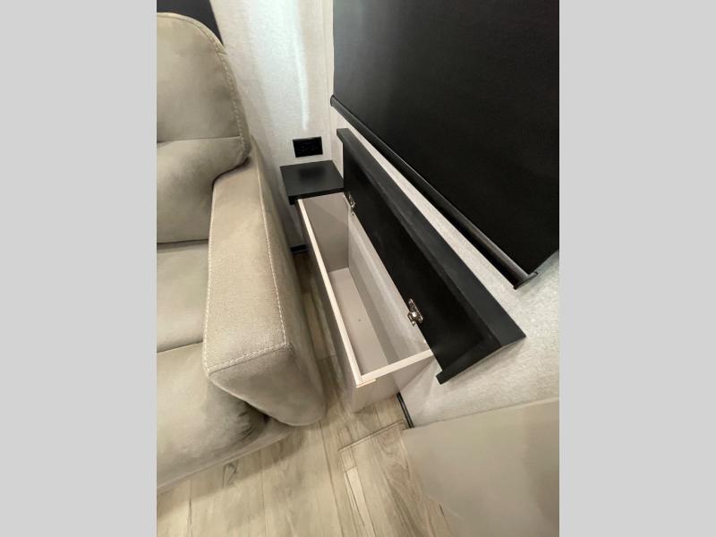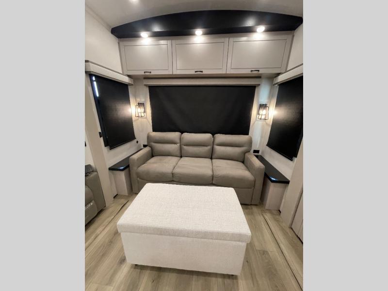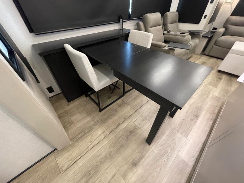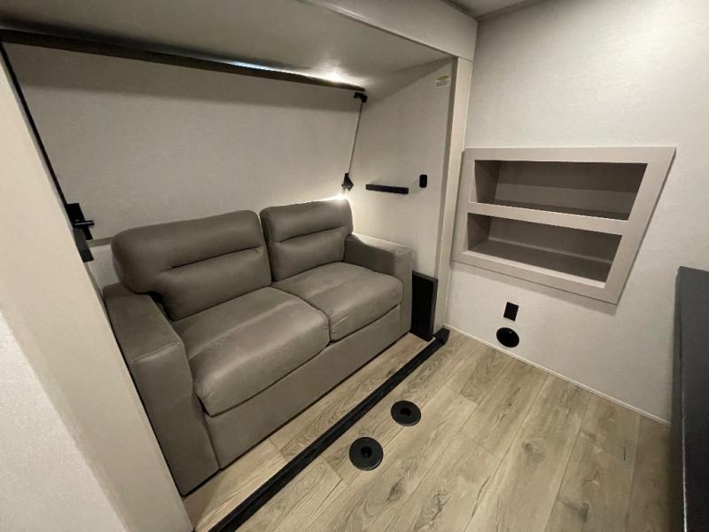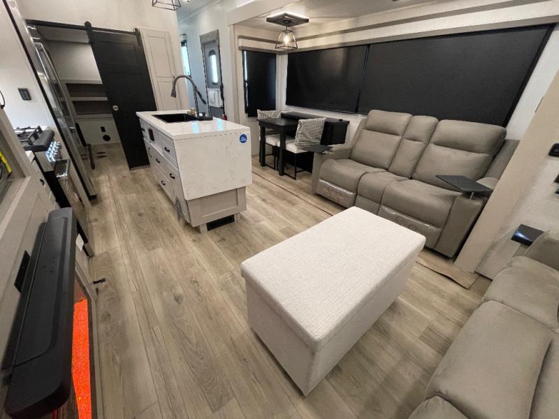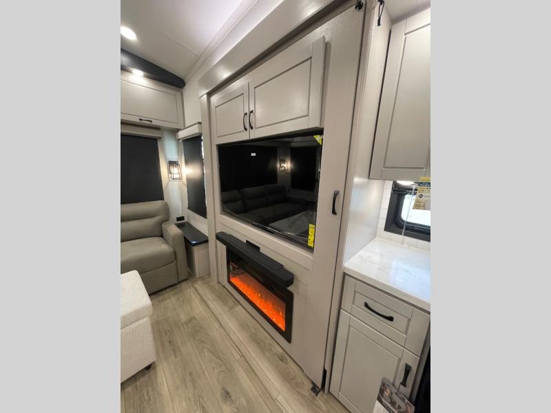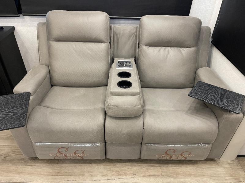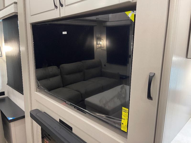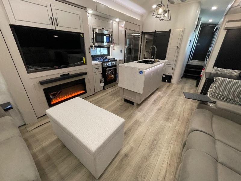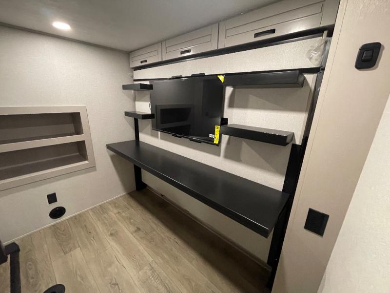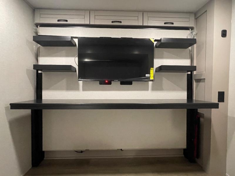 You can work from anywhere with this fifth wheel thanks to the middle bonus room that offers a desk with TV above, a tri-fold sofa with removable table, a flip-up bunk and a closet. This multi-use room works for just about anything including an extra living area and bunkhouse. The shoe storage under the interior steps, the linen cabinet in the full bathroom, the walk-in closet in the bedroom, and the overhead cabinets plus exterior storage allows you to bring whatever you want. Enjoy cooking in the kitchen that provides an island with a flip-up butcher block, a residential refrigerator, a pantry, and everything you need to keep everyone fed. The theater seats, the tri-fold sofa and the free standing table without a pedestal are great places to sit while watching the 50" Smart LED HDTV with fully digital HDMI output and home entertainment system with subwoofer, plus there is a fireplace below for those chilly evenings.