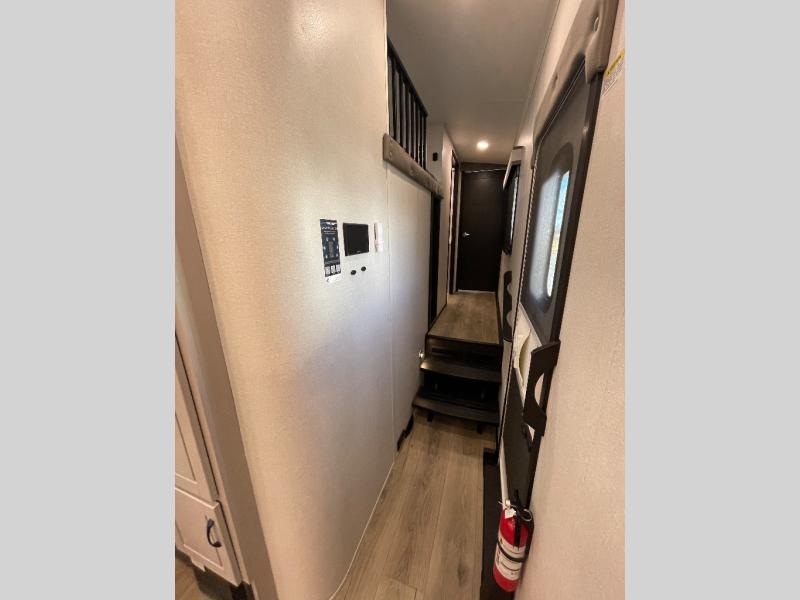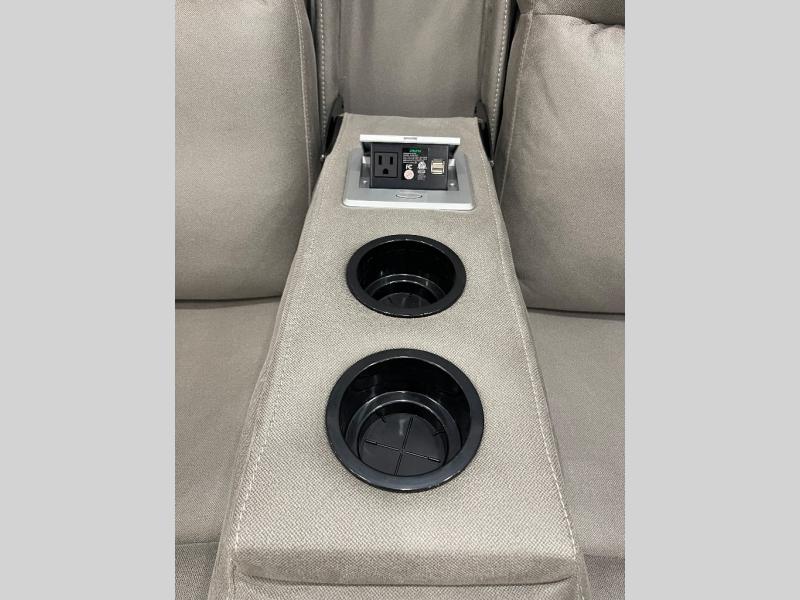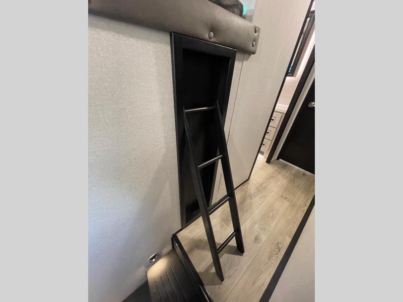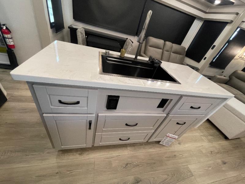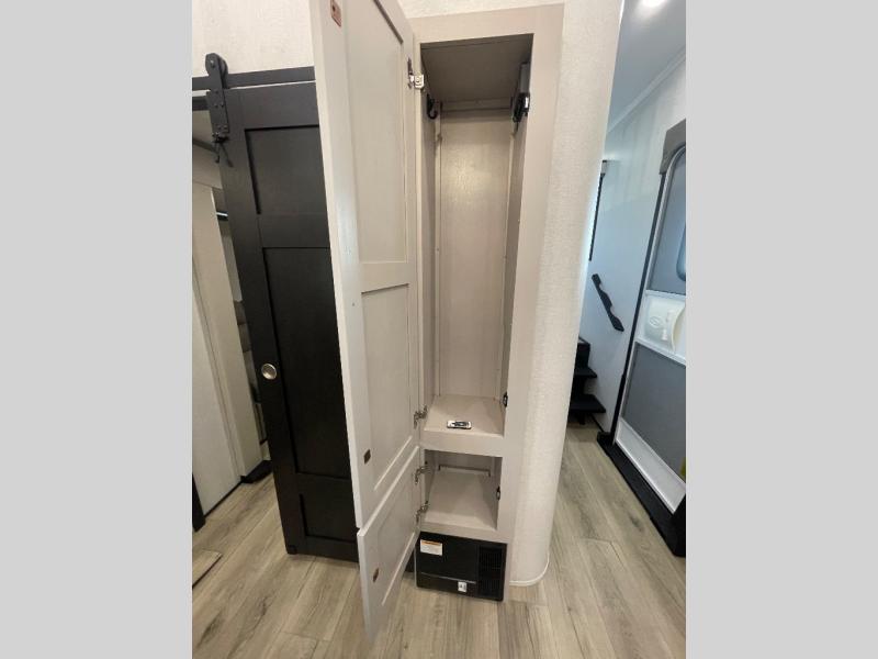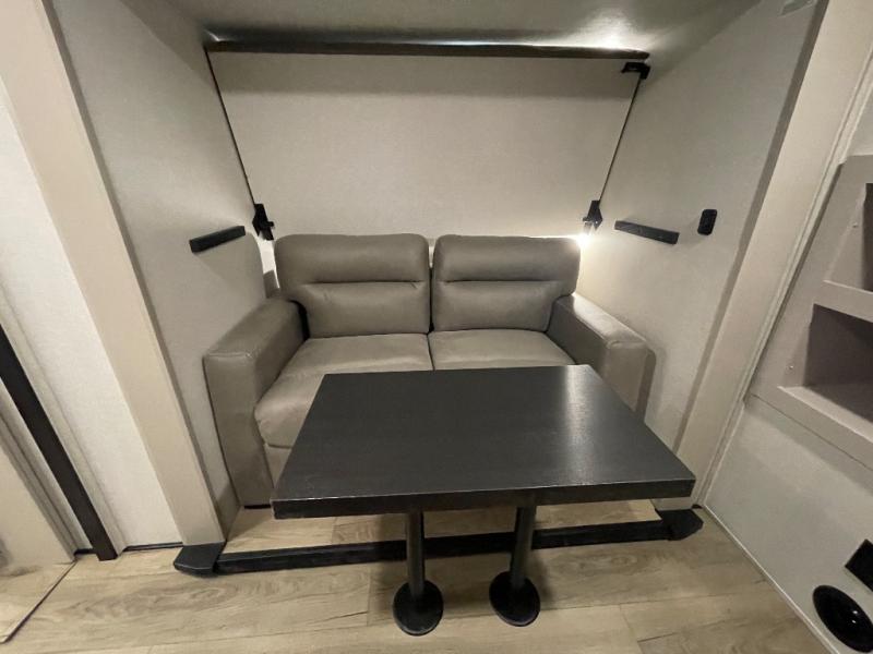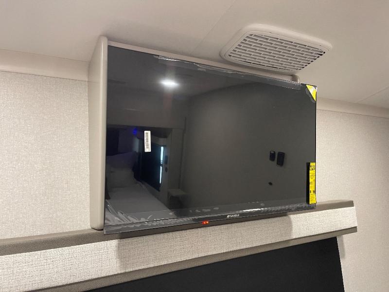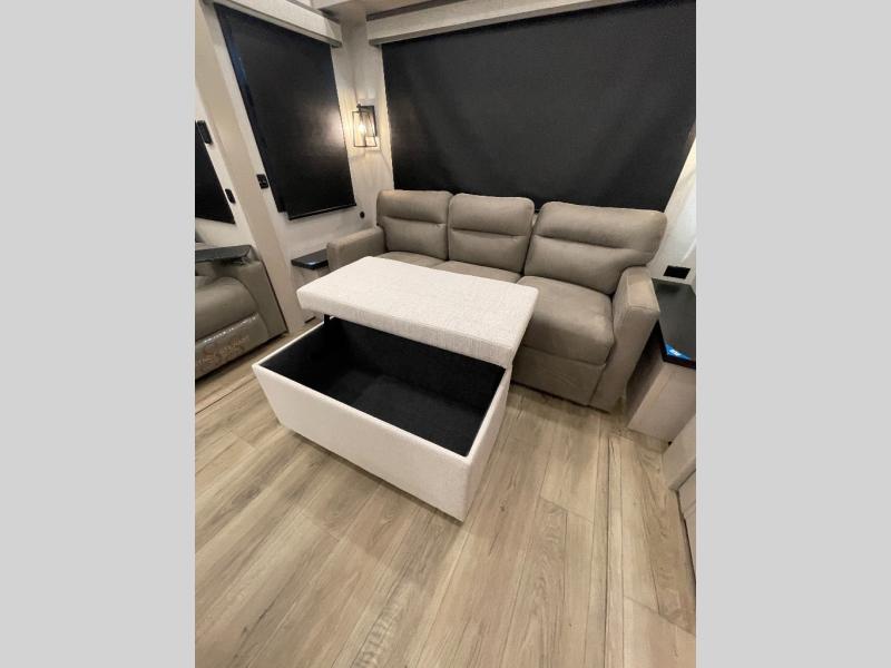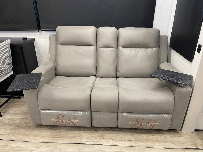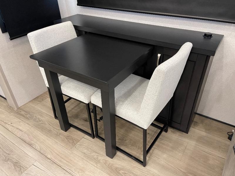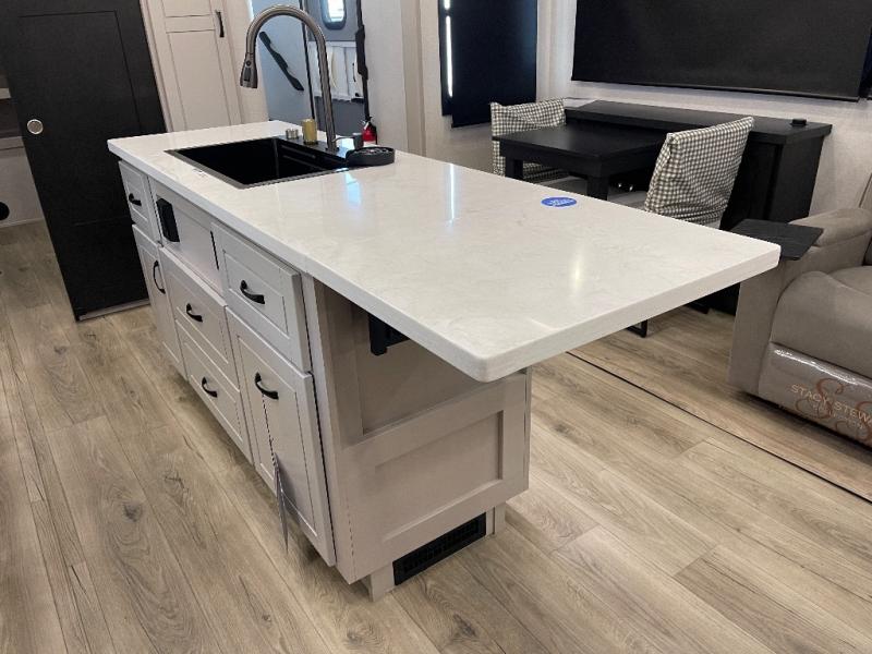 You can work from anywhere with this fifth wheel thanks to the middle bonus room that offers a desk with TV above, a tri-fold sofa with removable table, a flip-up bunk and a closet. This multi-use room works for just about anything including an extra living area and bunkhouse. The shoe storage under the interior steps, the linen cabinet in the full bathroom, the walk-in closet in the bedroom, and the overhead cabinets plus exterior storage allows you to bring whatever you want. Enjoy cooking in the kitchen that provides an island with a flip-up butcher block, a residential refrigerator, a pantry, and everything you need to keep everyone fed. The theater seats, the tri-fold sofa and the free standing table without a pedestal are great places to sit while watching the 50" Smart LED HDTV with fully digital HDMI output and home entertainment system with subwoofer, plus there is a fireplace below for those chilly evenings.