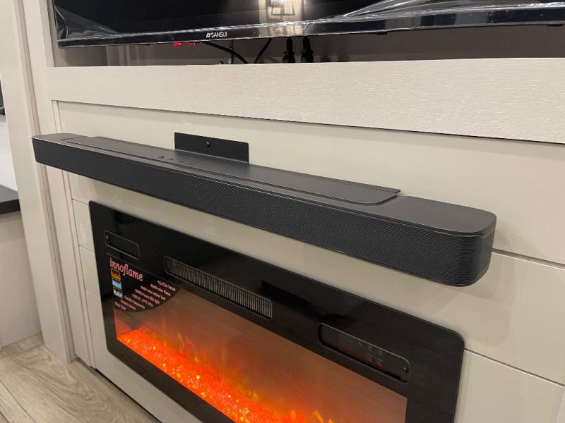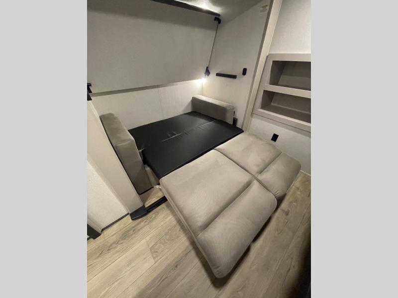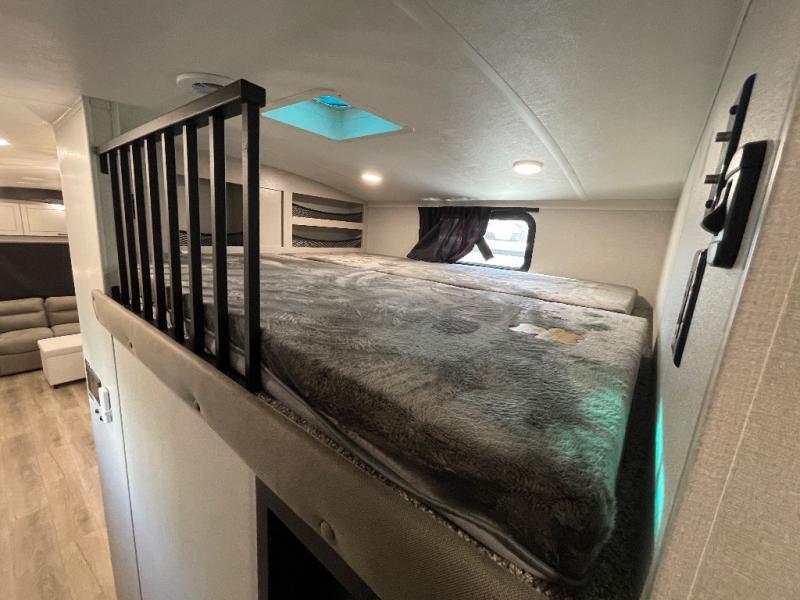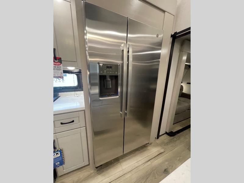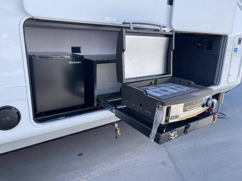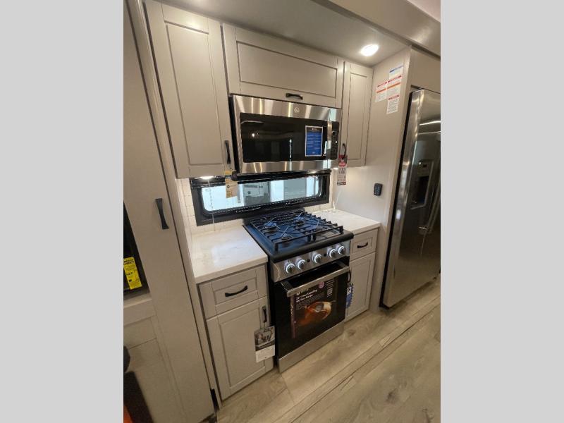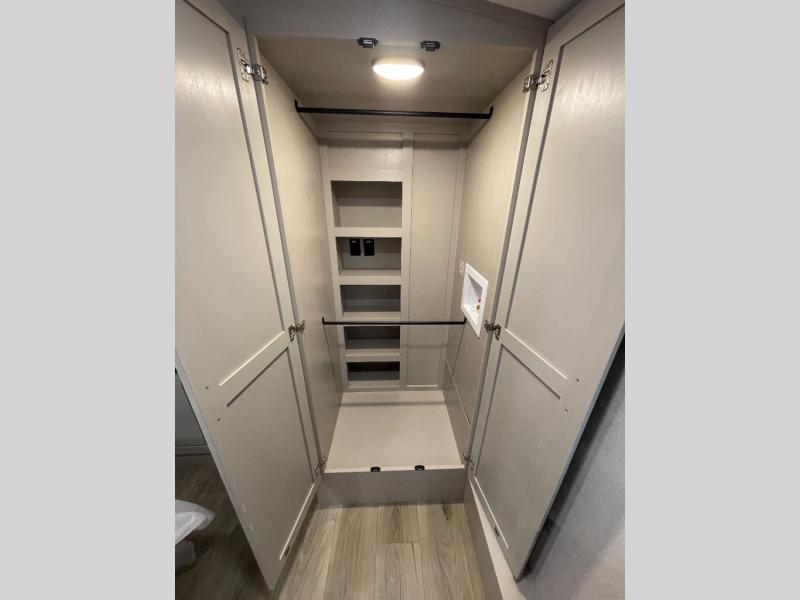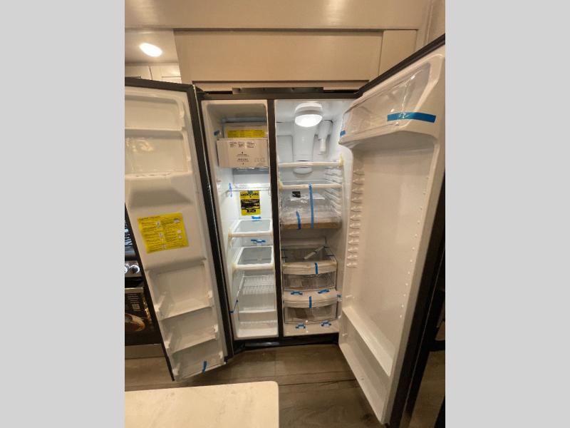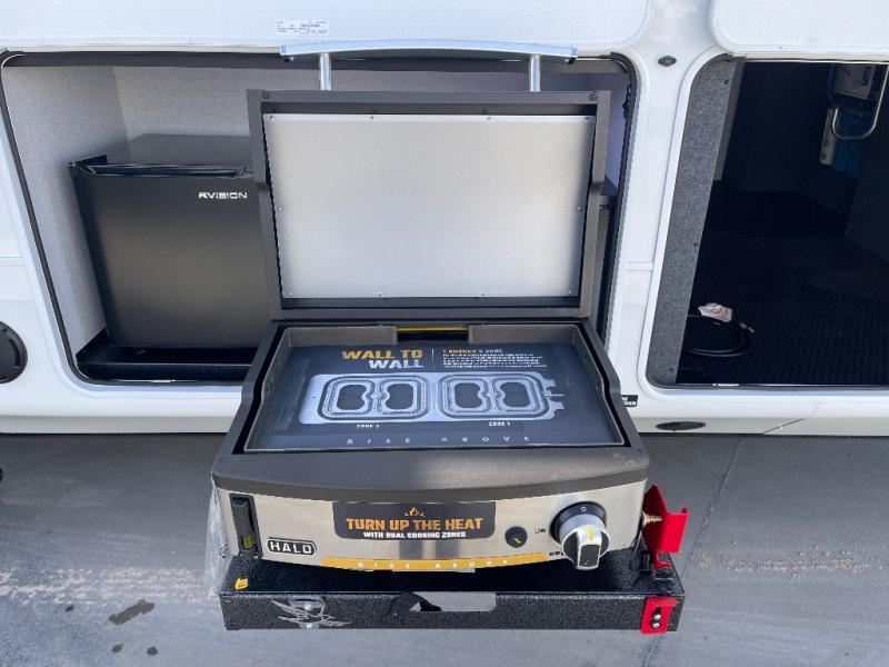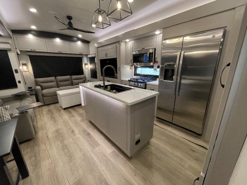 You can work from anywhere with this fifth wheel thanks to the middle bonus room that offers a desk with TV above, a tri-fold sofa with removable table, a flip-up bunk and a closet. This multi-use room works for just about anything including an extra living area and bunkhouse. The shoe storage under the interior steps, the linen cabinet in the full bathroom, the walk-in closet in the bedroom, and the overhead cabinets plus exterior storage allows you to bring whatever you want. Enjoy cooking in the kitchen that provides an island with a flip-up butcher block, a residential refrigerator, a pantry, and everything you need to keep everyone fed. The theater seats, the tri-fold sofa and the free standing table without a pedestal are great places to sit while watching the 50" Smart LED HDTV with fully digital HDMI output and home entertainment system with subwoofer, plus there is a fireplace below for those chilly evenings.