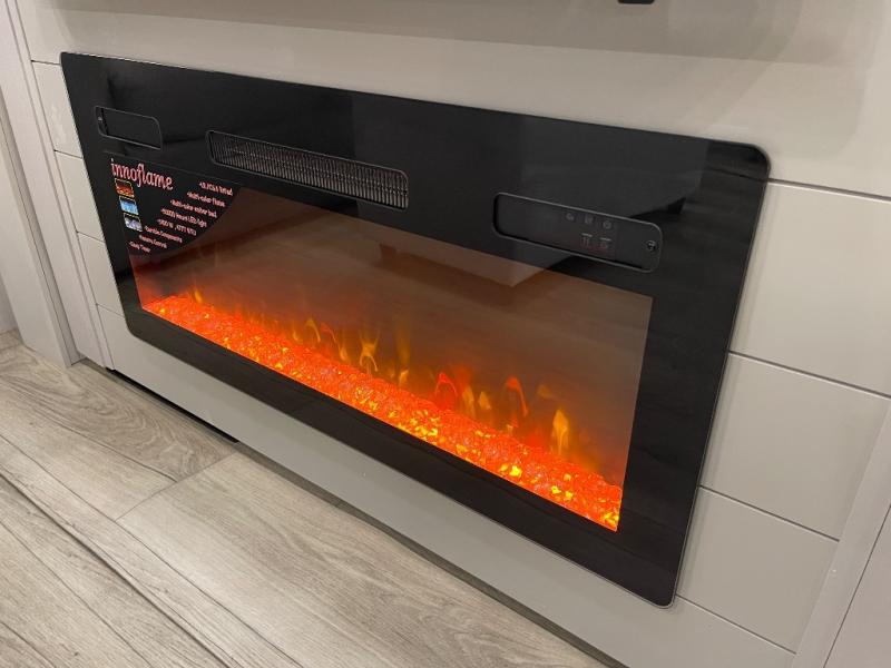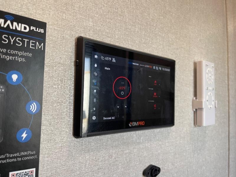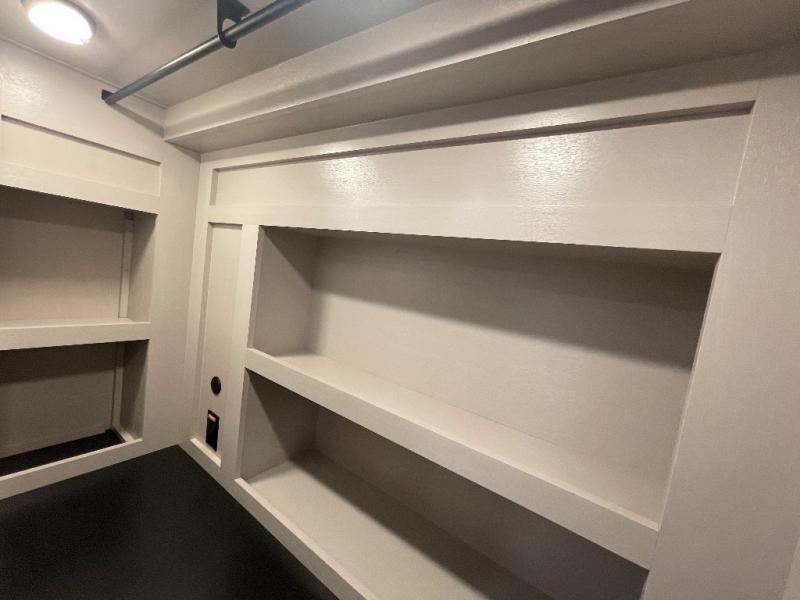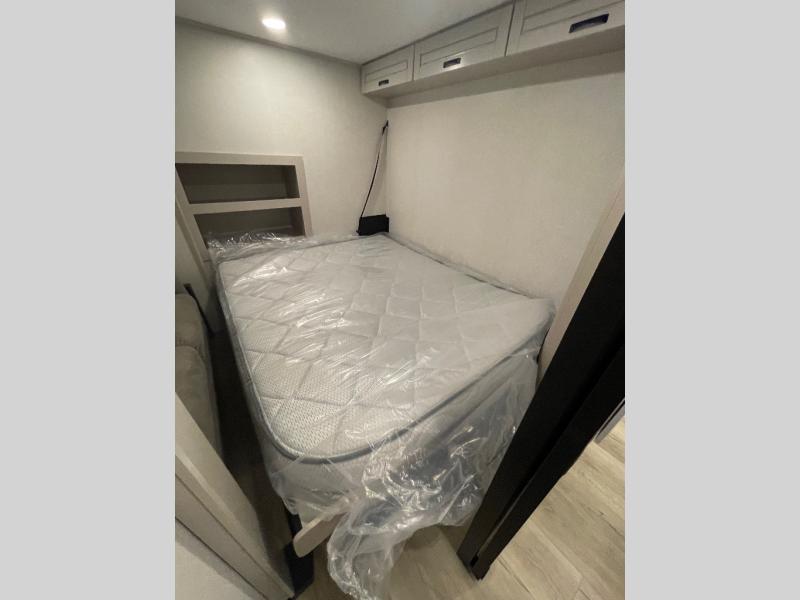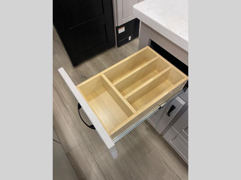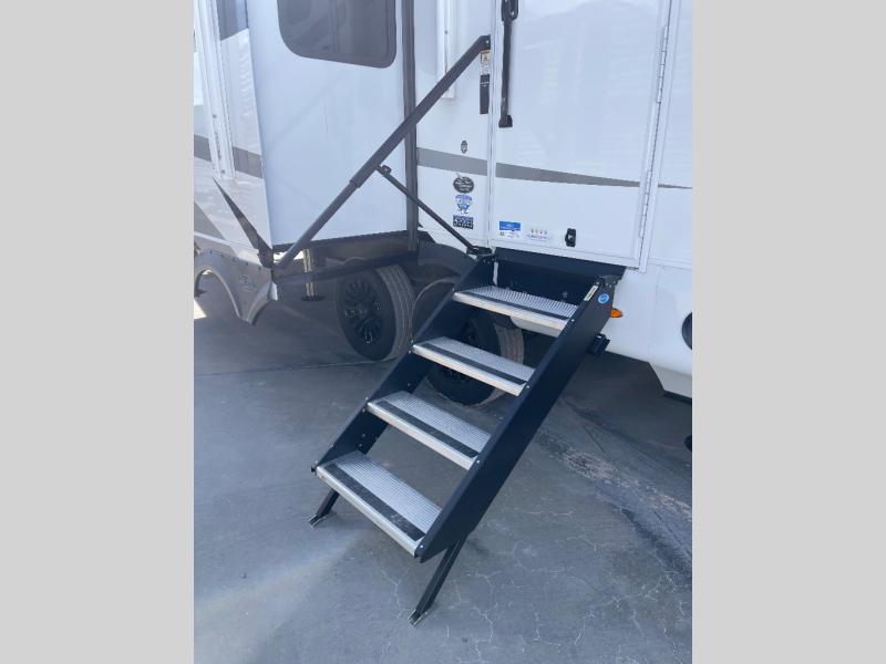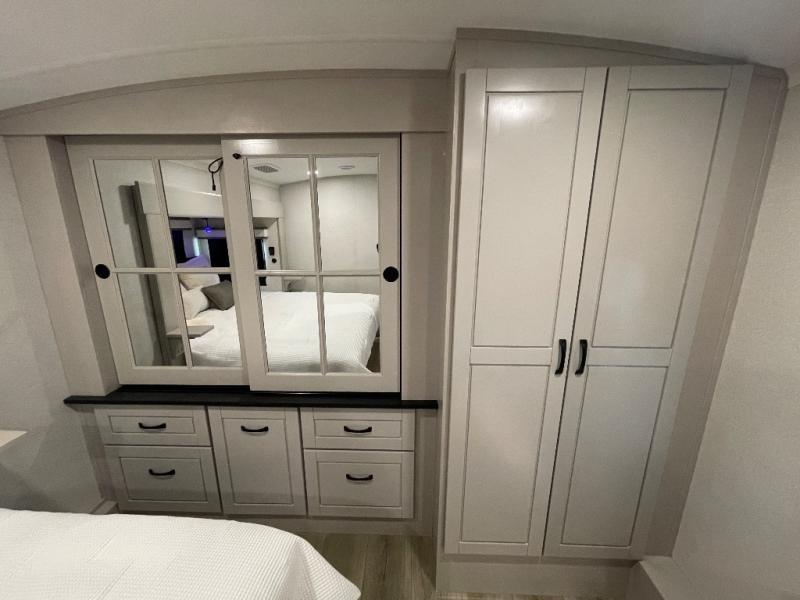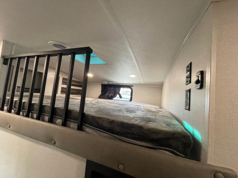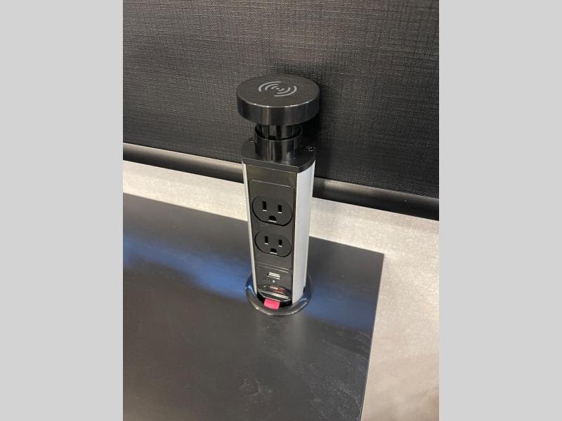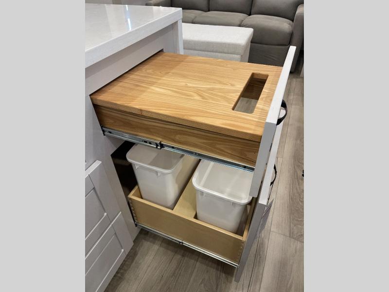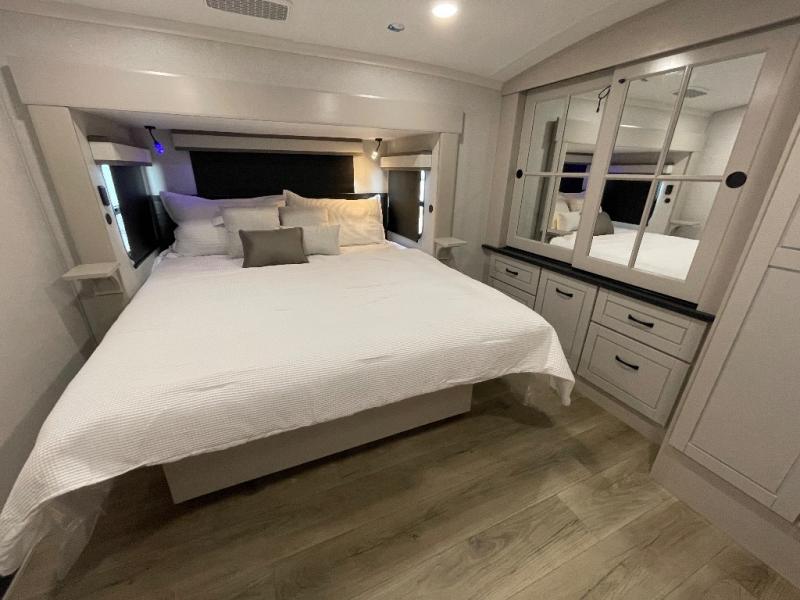 You can work from anywhere with this fifth wheel thanks to the middle bonus room that offers a desk with TV above, a tri-fold sofa with removable table, a flip-up bunk and a closet. This multi-use room works for just about anything including an extra living area and bunkhouse. The shoe storage under the interior steps, the linen cabinet in the full bathroom, the walk-in closet in the bedroom, and the overhead cabinets plus exterior storage allows you to bring whatever you want. Enjoy cooking in the kitchen that provides an island with a flip-up butcher block, a residential refrigerator, a pantry, and everything you need to keep everyone fed. The theater seats, the tri-fold sofa and the free standing table without a pedestal are great places to sit while watching the 50" Smart LED HDTV with fully digital HDMI output and home entertainment system with subwoofer, plus there is a fireplace below for those chilly evenings.