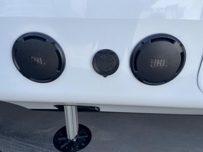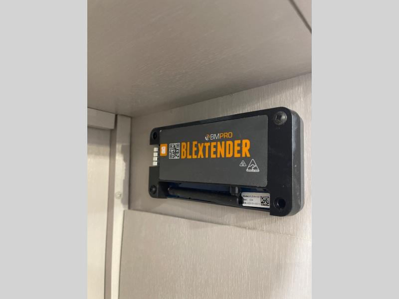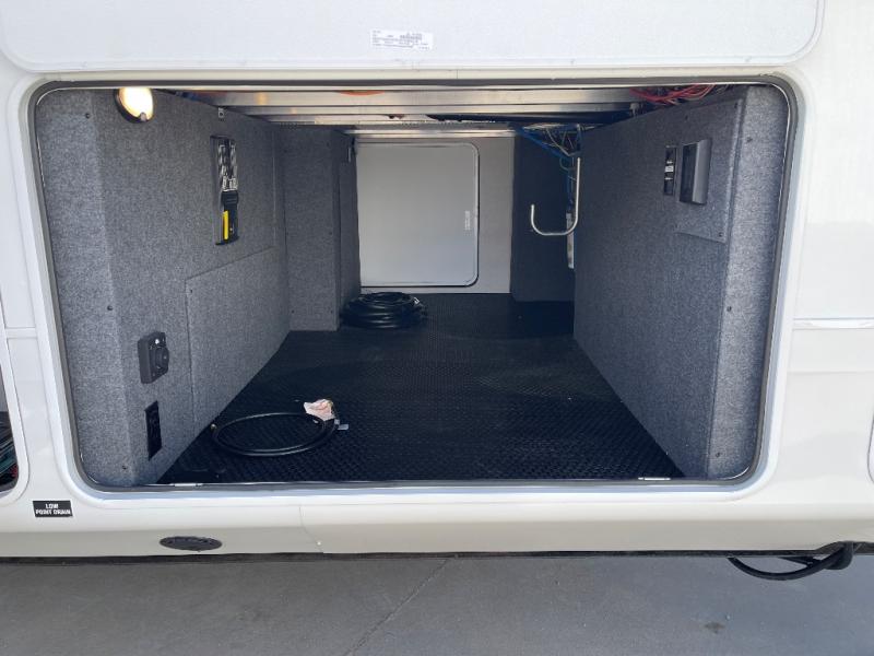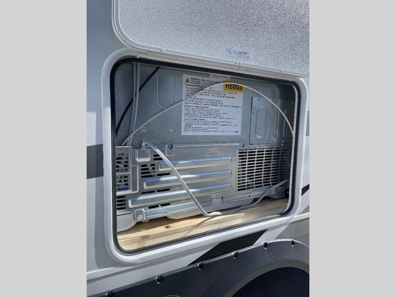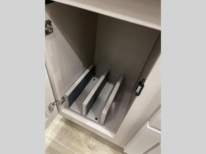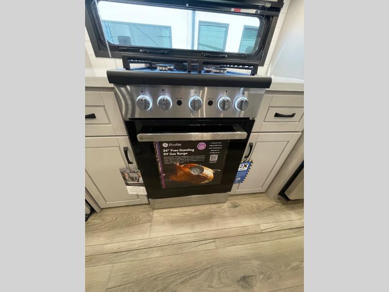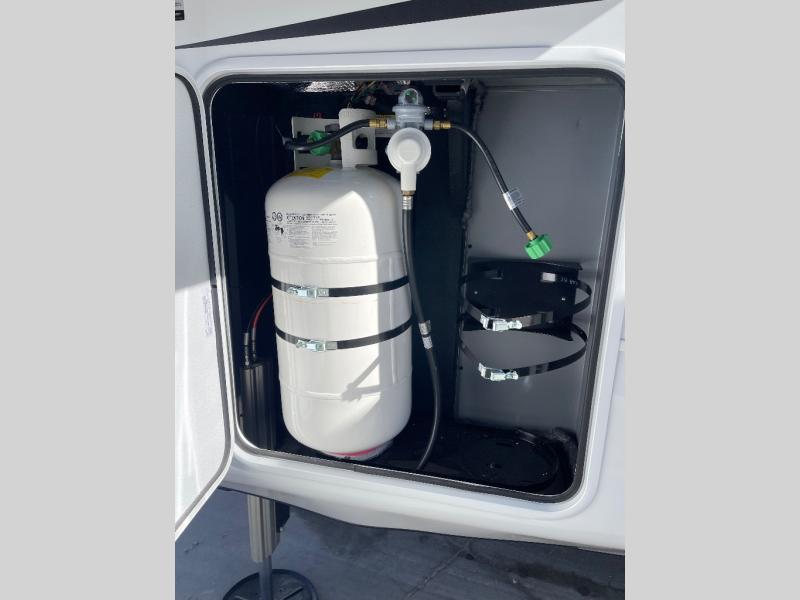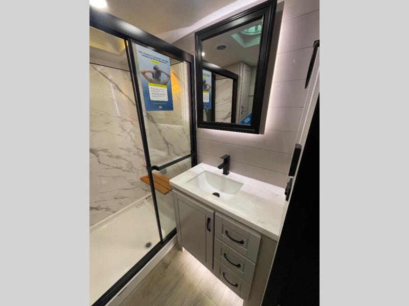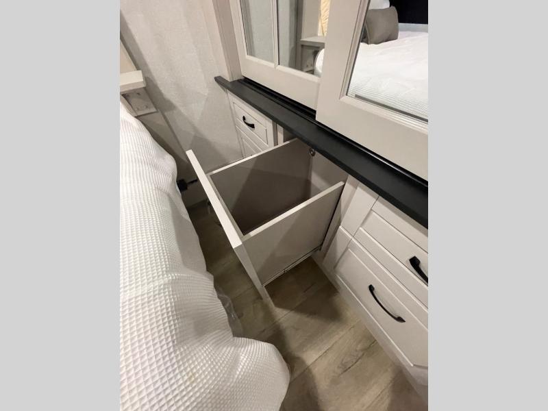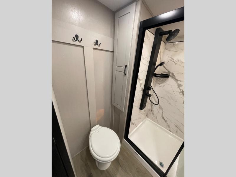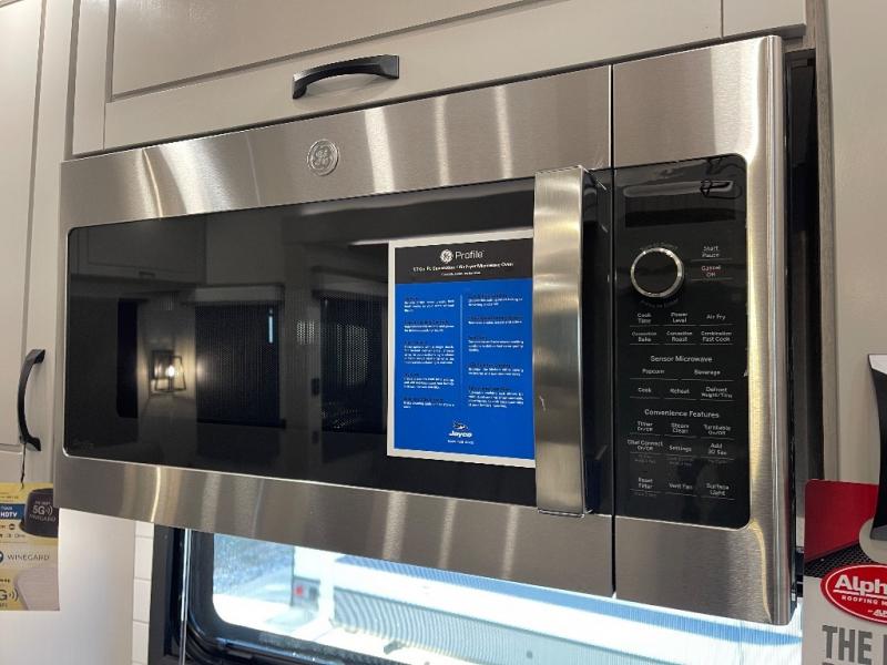 You can work from anywhere with this fifth wheel thanks to the middle bonus room that offers a desk with TV above, a tri-fold sofa with removable table, a flip-up bunk and a closet. This multi-use room works for just about anything including an extra living area and bunkhouse. The shoe storage under the interior steps, the linen cabinet in the full bathroom, the walk-in closet in the bedroom, and the overhead cabinets plus exterior storage allows you to bring whatever you want. Enjoy cooking in the kitchen that provides an island with a flip-up butcher block, a residential refrigerator, a pantry, and everything you need to keep everyone fed. The theater seats, the tri-fold sofa and the free standing table without a pedestal are great places to sit while watching the 50" Smart LED HDTV with fully digital HDMI output and home entertainment system with subwoofer, plus there is a fireplace below for those chilly evenings.