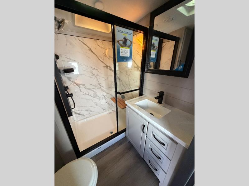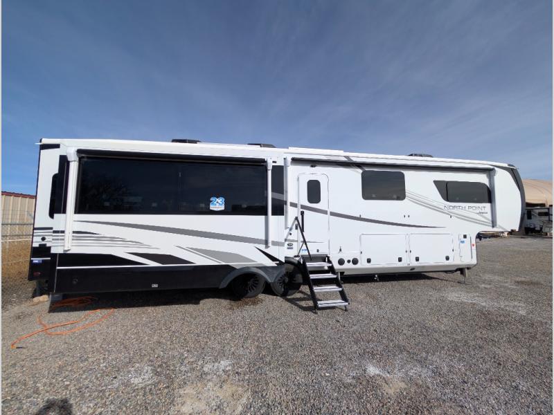 With any North Point fifth wheel by Jayco you begin with a strong foundation with a custom frame, designed and sized specifically to best support each unit. Constructed with Stronghold VBL™ aluminum framed, vacuum bond laminated walls and the Magnum Truss™ XL6™ roof system with an Alpha roof membrane system, which is the strongest tested roof in the industry. The 5-Star Handling package is included with Uniroyal tires, a MORryde rubber pin box, Dexter axles with Nev-R-Adjust brakes, MORryde CRE-3000 rubberized suspension and wet bolt fasteners and bronze bushings. The interior has handcrafted hardwood glazed doors and drawers, vinyl flooring throughout, an integrated under-mount sink in the main bathroom, plus so much more you just have to see one to believe it all!