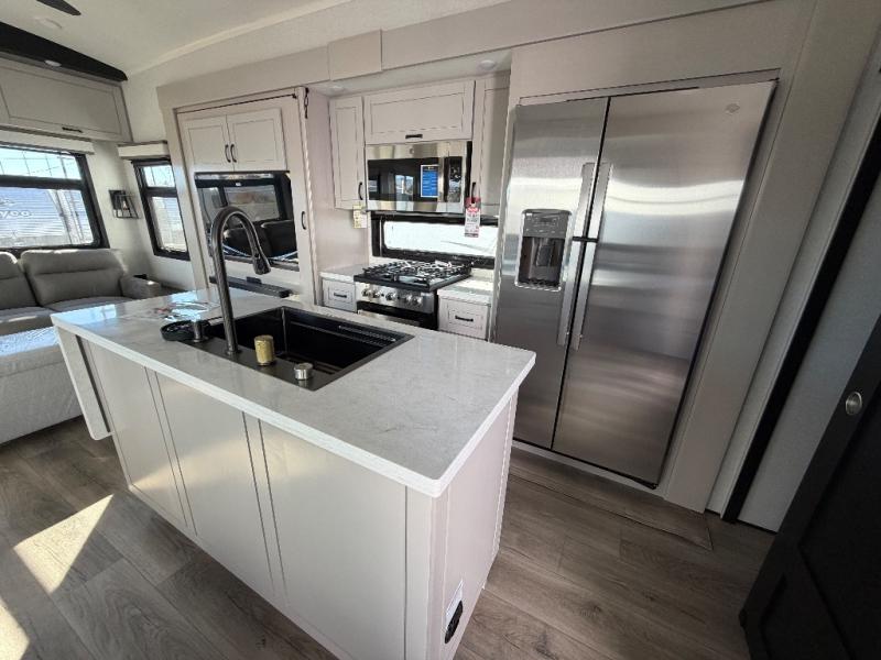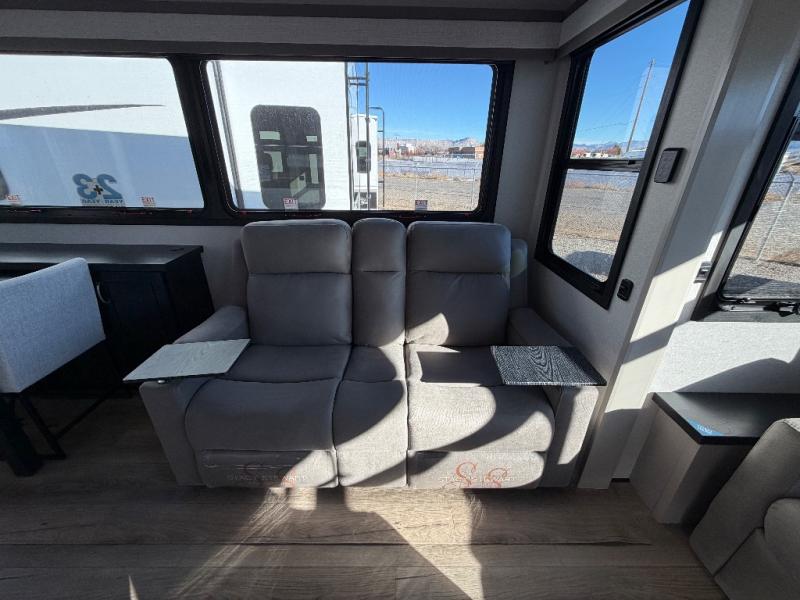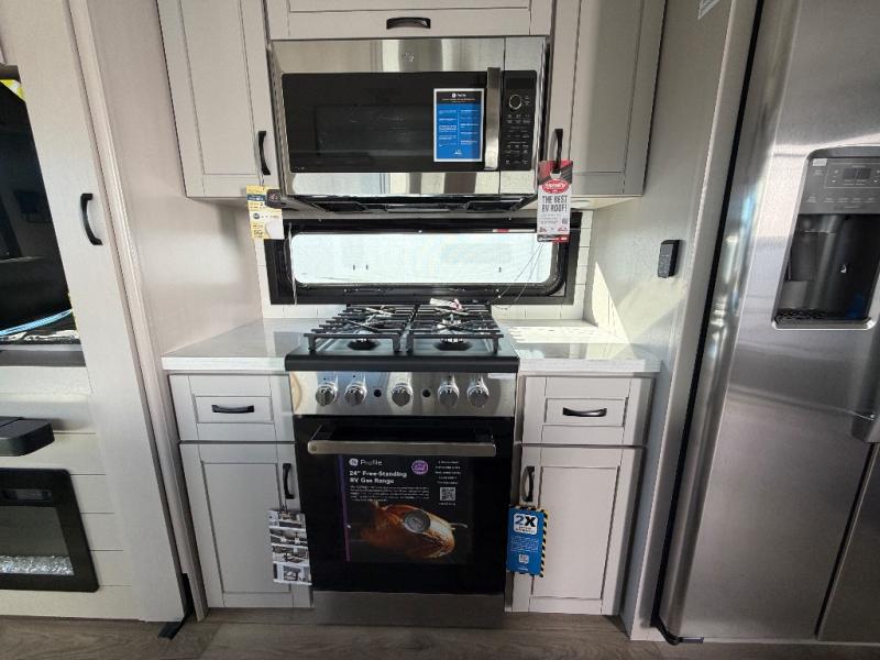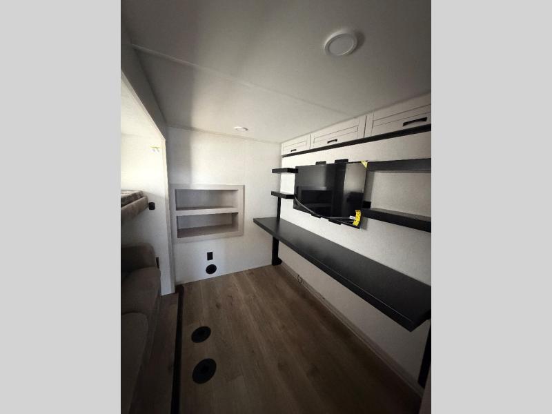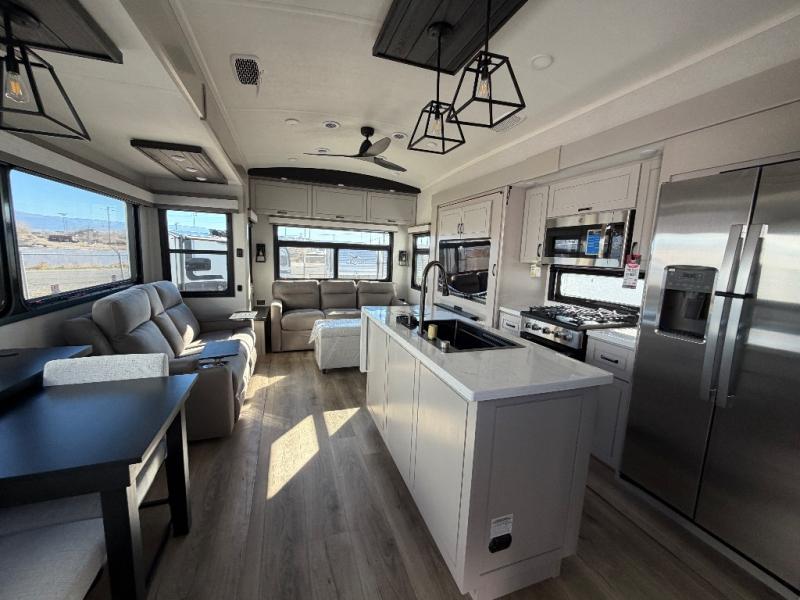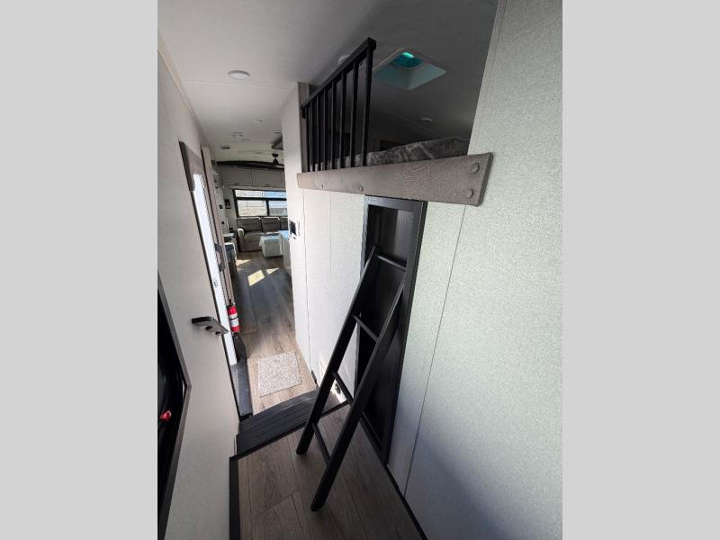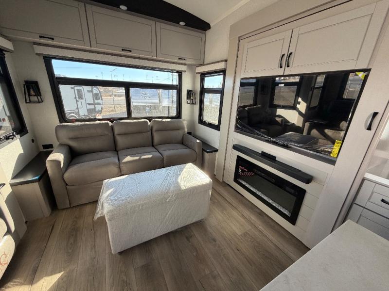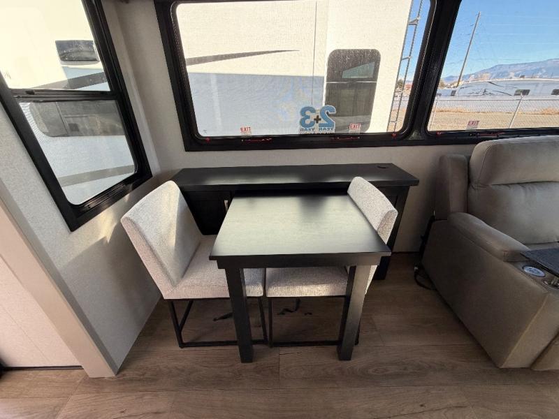 You can work from anywhere with this fifth wheel thanks to the middle bonus room that offers a desk with TV above, a tri-fold sofa with removable table, a flip-up bunk and a closet. This multi-use room works for just about anything including an extra living area and bunkhouse. The shoe storage under the interior steps, the linen cabinet in the full bathroom, the walk-in closet in the bedroom, and the overhead cabinets plus exterior storage allows you to bring whatever you want. Enjoy cooking in the kitchen that provides an island with a flip-up butcher block, a residential refrigerator, a pantry, and everything you need to keep everyone fed. The theater seats, the tri-fold sofa and the free standing table without a pedestal are great places to sit while watching the 50" Smart LED HDTV with fully digital HDMI output and home entertainment system with subwoofer, plus there is a fireplace below for those chilly evenings.