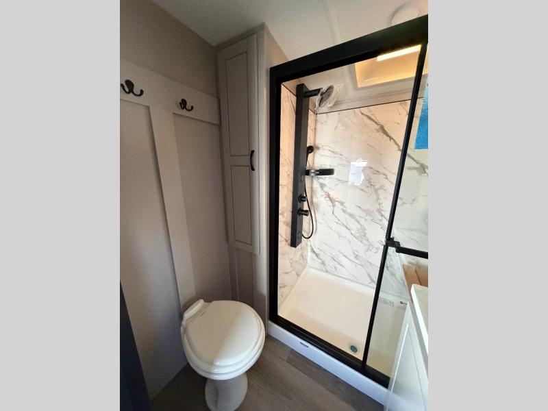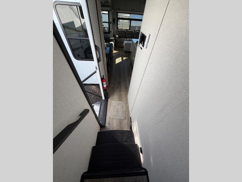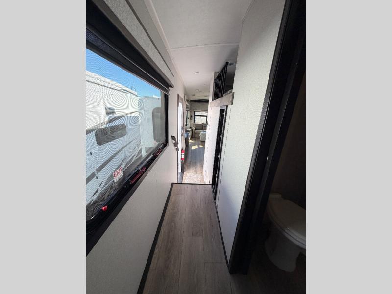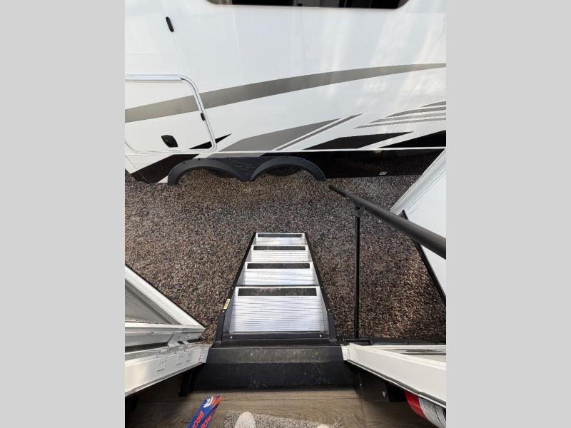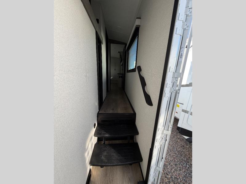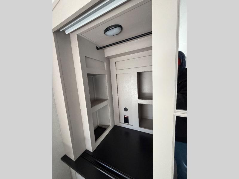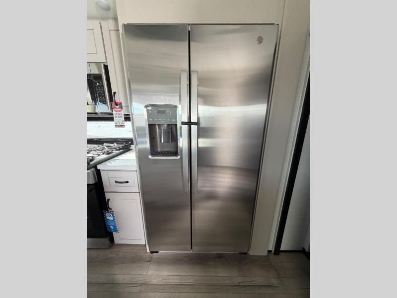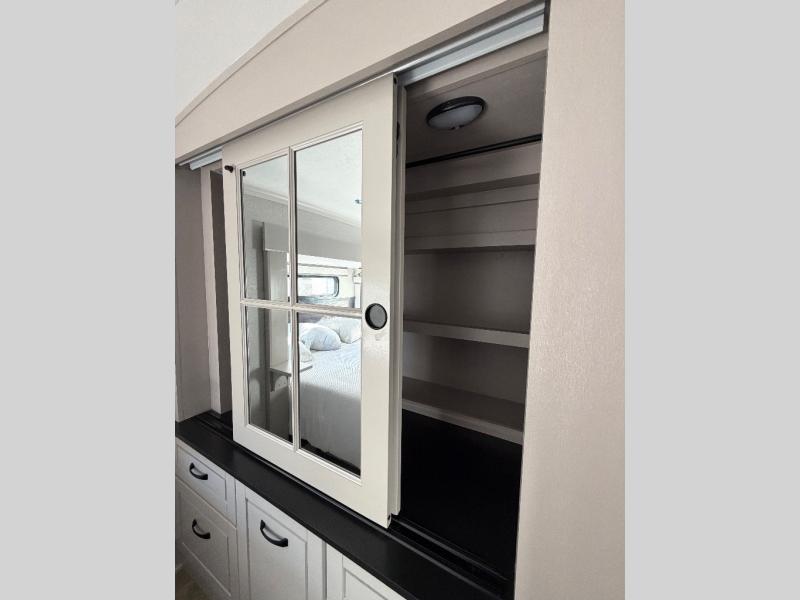 You can work from anywhere with this fifth wheel thanks to the middle bonus room that offers a desk with TV above, a tri-fold sofa with removable table, a flip-up bunk and a closet. This multi-use room works for just about anything including an extra living area and bunkhouse. The shoe storage under the interior steps, the linen cabinet in the full bathroom, the walk-in closet in the bedroom, and the overhead cabinets plus exterior storage allows you to bring whatever you want. Enjoy cooking in the kitchen that provides an island with a flip-up butcher block, a residential refrigerator, a pantry, and everything you need to keep everyone fed. The theater seats, the tri-fold sofa and the free standing table without a pedestal are great places to sit while watching the 50" Smart LED HDTV with fully digital HDMI output and home entertainment system with subwoofer, plus there is a fireplace below for those chilly evenings.