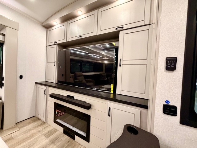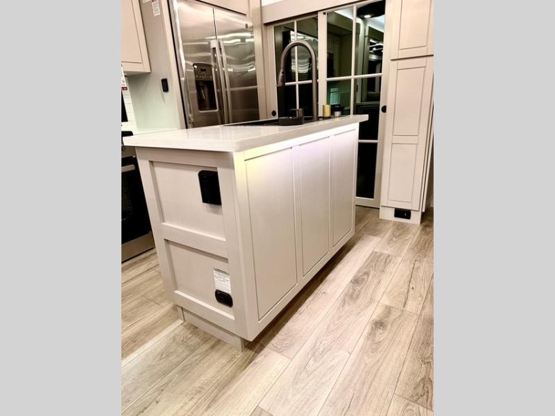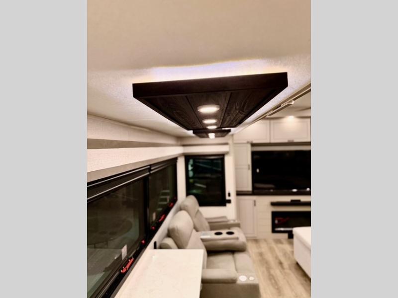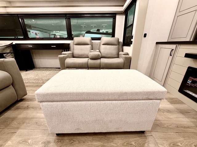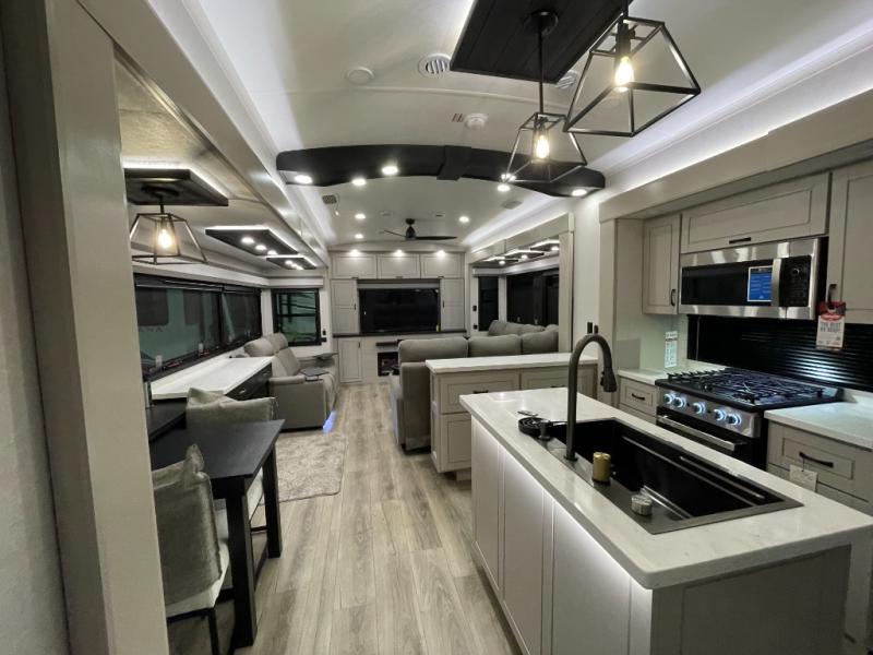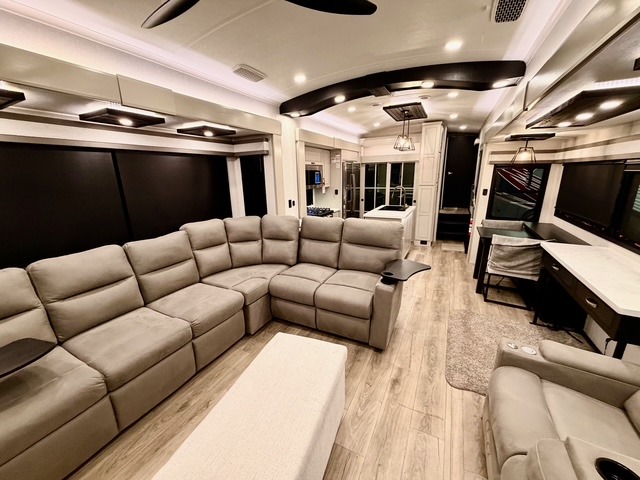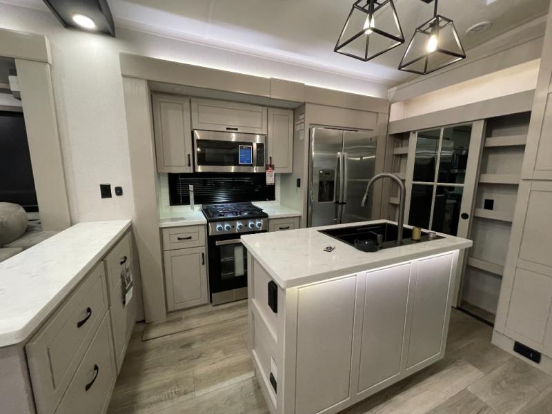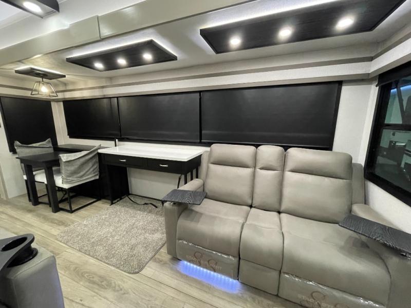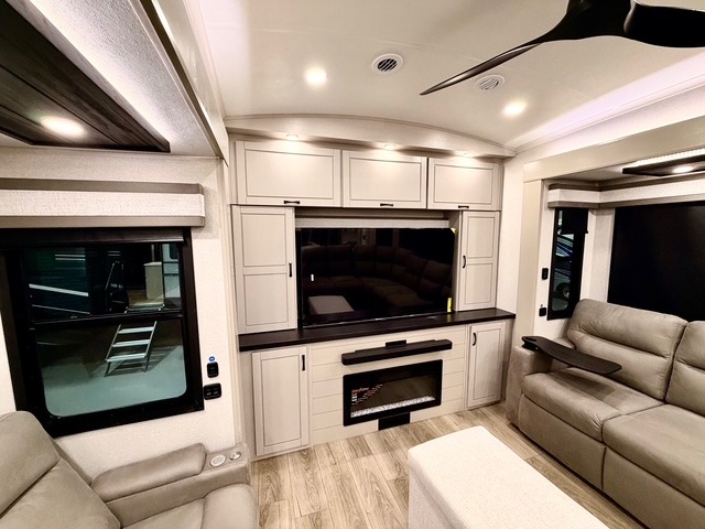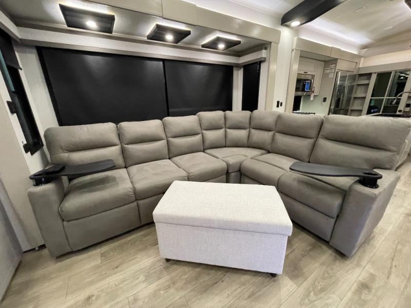 Prepare for great adventures in this fifth wheel! The rear living area features a massive L-shaped sofa which includes a hide-a-bed as well as recliner seats! Plus there's an additional set of theater seats all facing the entertainment center with a fireplace and 50" Smart TV. A flexible desk/coffee bar connects the living room to the kitchen so you can work or relax as needed. Meals will be easy to prepare with the island with sink and pull-out cutting board, plus pantry, microwave, and residential refrigerator. Up front you will find the private bedroom with its king bed, closet with drawers and hamper, and even a second TV. The full bath features a shower with seat and a linen closet for convenient storage. Outside you'll find a pair of awnings and a pull-out griddle.