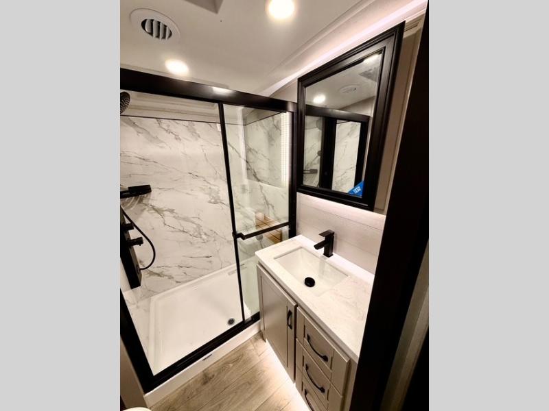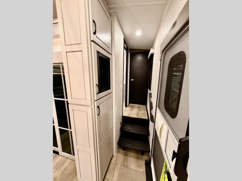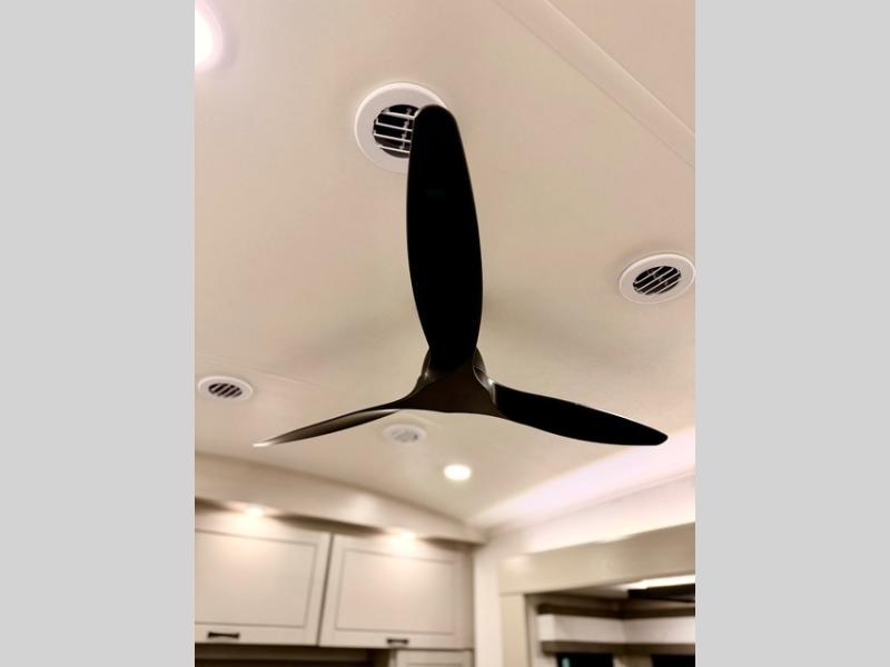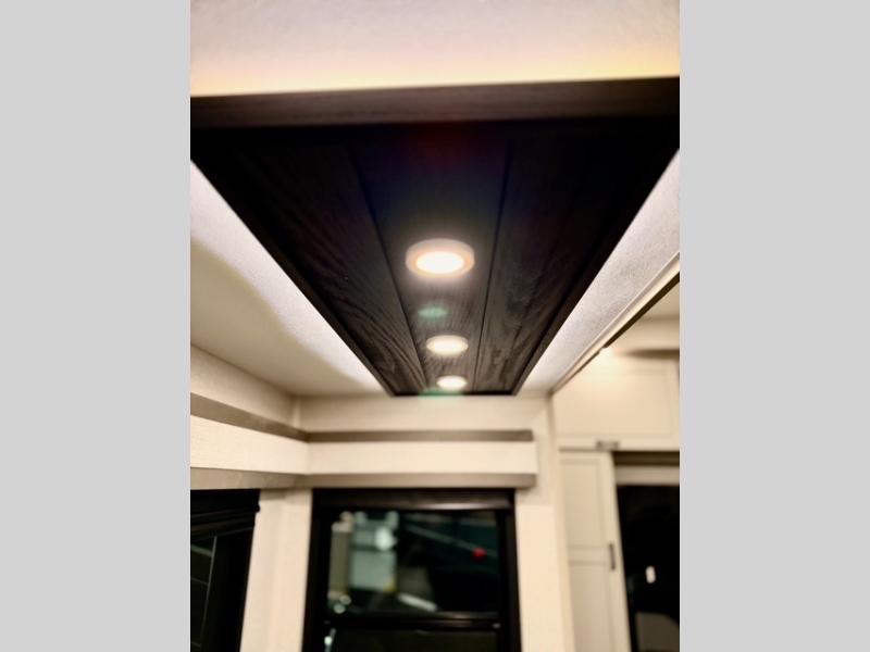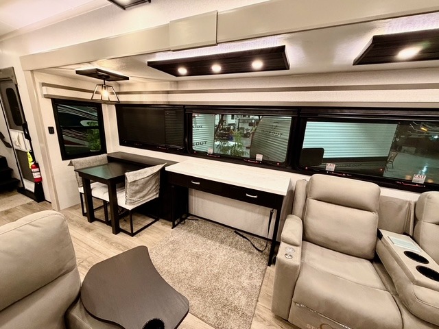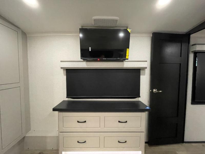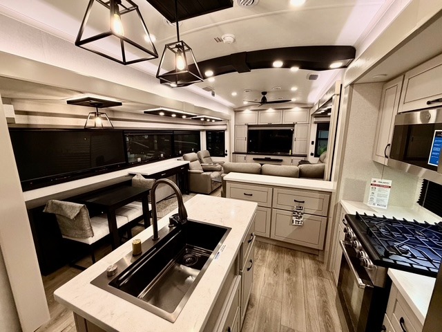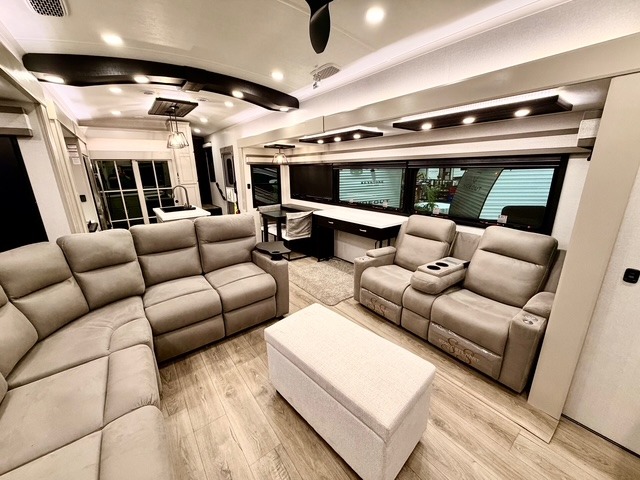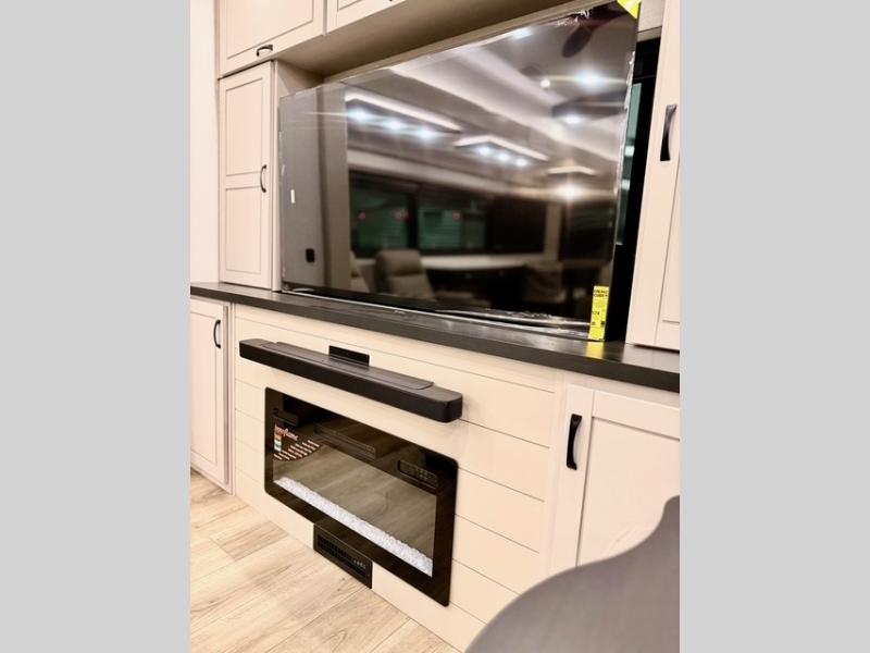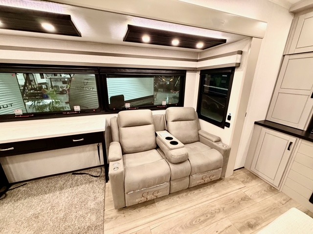 Prepare for great adventures in this fifth wheel! The rear living area features a massive L-shaped sofa which includes a hide-a-bed as well as recliner seats! Plus there's an additional set of theater seats all facing the entertainment center with a fireplace and 50" Smart TV. A flexible desk/coffee bar connects the living room to the kitchen so you can work or relax as needed. Meals will be easy to prepare with the island with sink and pull-out cutting board, plus pantry, microwave, and residential refrigerator. Up front you will find the private bedroom with its king bed, closet with drawers and hamper, and even a second TV. The full bath features a shower with seat and a linen closet for convenient storage. Outside you'll find a pair of awnings and a pull-out griddle.