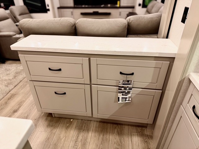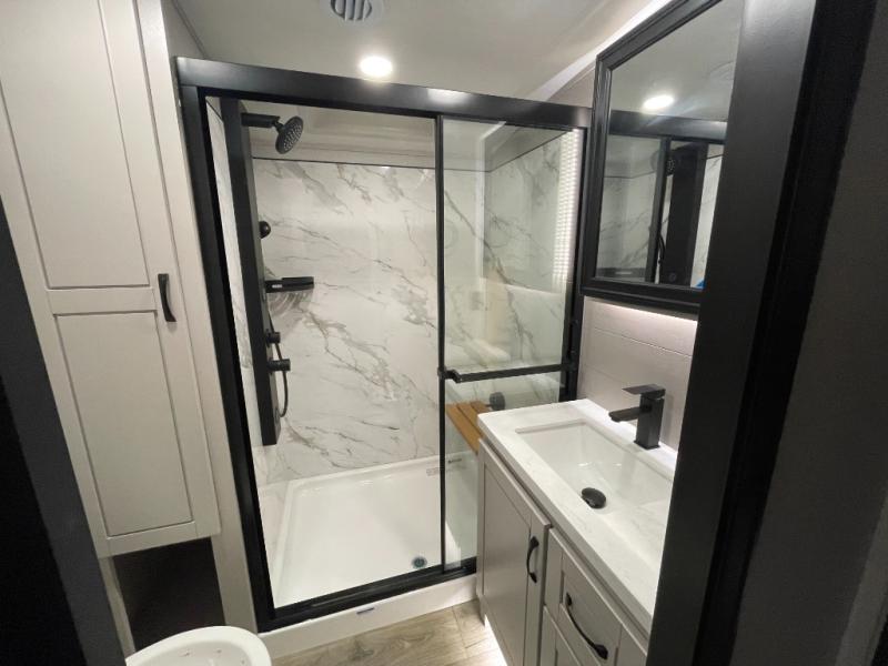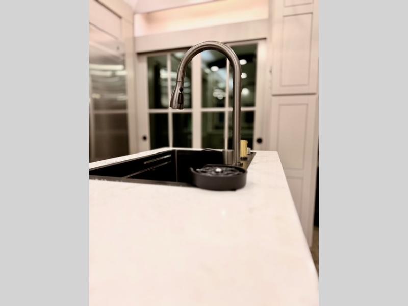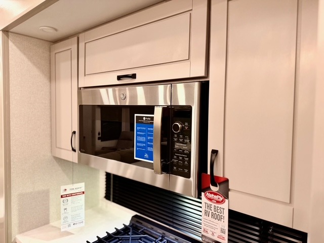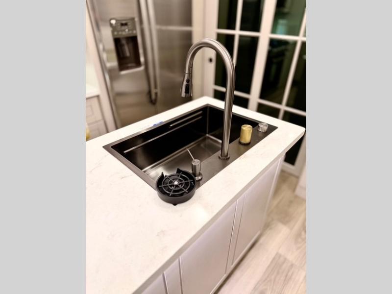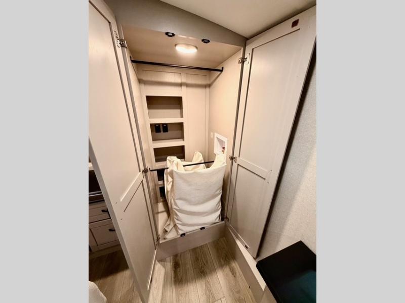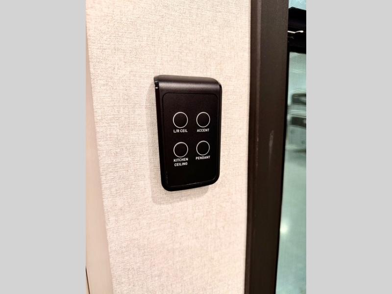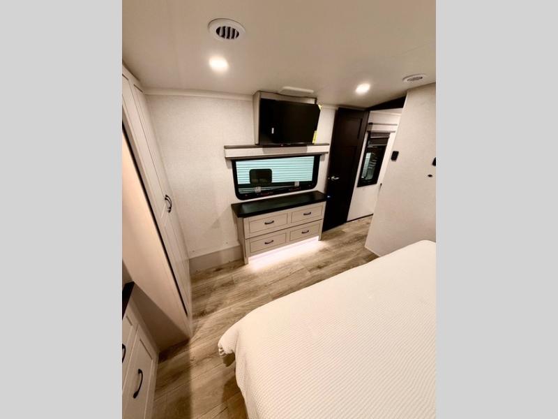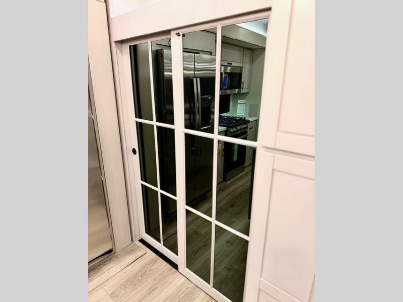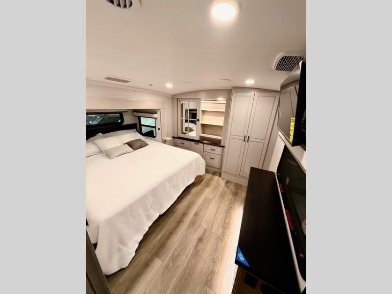 Prepare for great adventures in this fifth wheel! The rear living area features a massive L-shaped sofa which includes a hide-a-bed as well as recliner seats! Plus there's an additional set of theater seats all facing the entertainment center with a fireplace and 50" Smart TV. A flexible desk/coffee bar connects the living room to the kitchen so you can work or relax as needed. Meals will be easy to prepare with the island with sink and pull-out cutting board, plus pantry, microwave, and residential refrigerator. Up front you will find the private bedroom with its king bed, closet with drawers and hamper, and even a second TV. The full bath features a shower with seat and a linen closet for convenient storage. Outside you'll find a pair of awnings and a pull-out griddle.