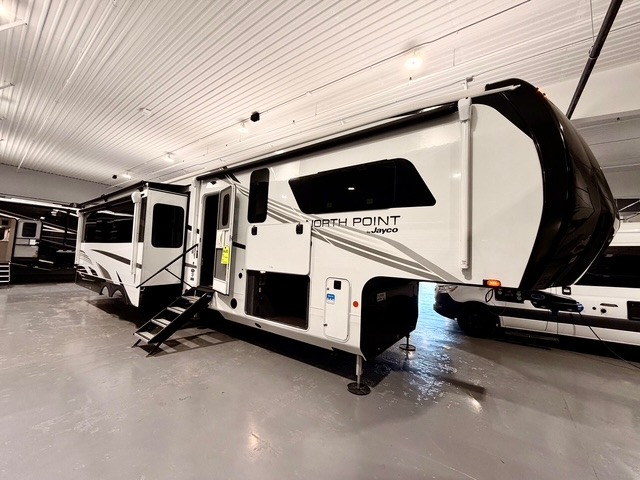 With any North Point fifth wheel by Jayco you begin with a strong foundation with a custom frame, designed and sized specifically to best support each unit. Constructed with Stronghold VBL™ aluminum framed, vacuum bond laminated walls and the Magnum Truss™ XL6™ roof system with a one-piece, seamless roof material, which is the strongest tested roof in the industry. The 5-Star Handling package is included with Uniroyal tires, a MORryde rubber pin box, Dexter axles with Nev-R-Adjust brakes, MORryde CRE-3000 rubberized suspension and wet bolt fasteners and bronze bushings. The interior has handcrafted hardwood glazed doors and drawers, vinyl flooring throughout, an integrated under-mount sink in the main bathroom, plus so much more you just have to see one to believe it all!