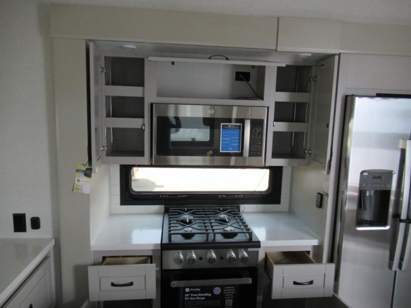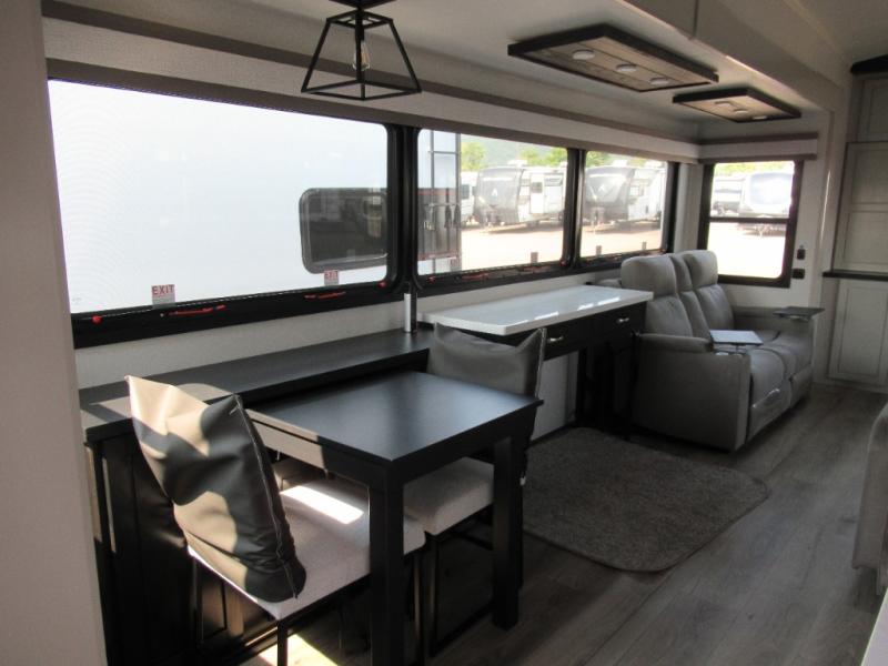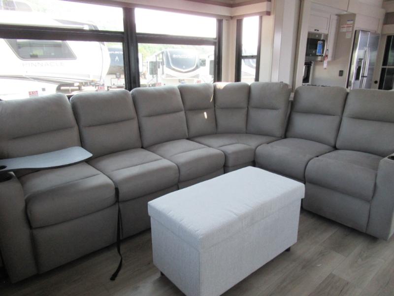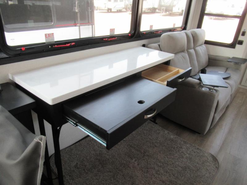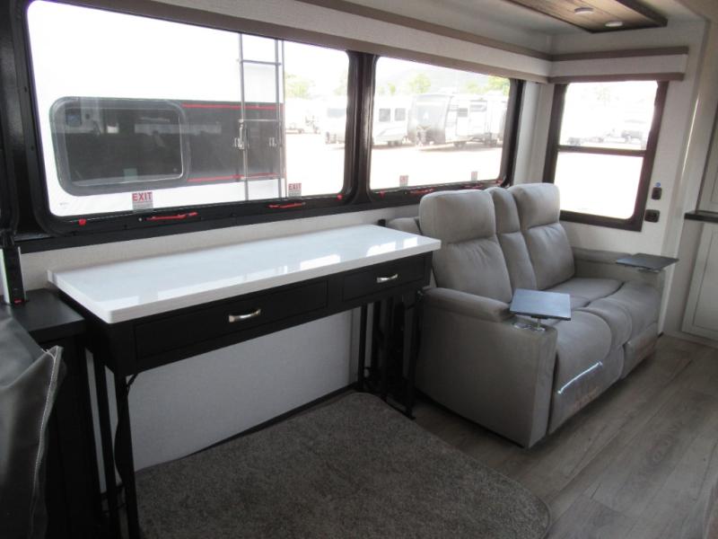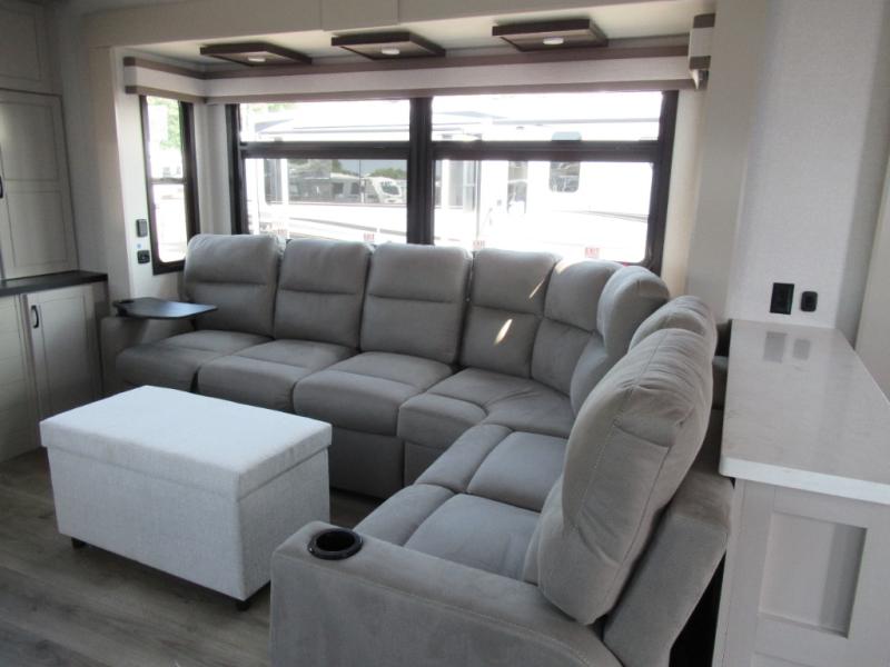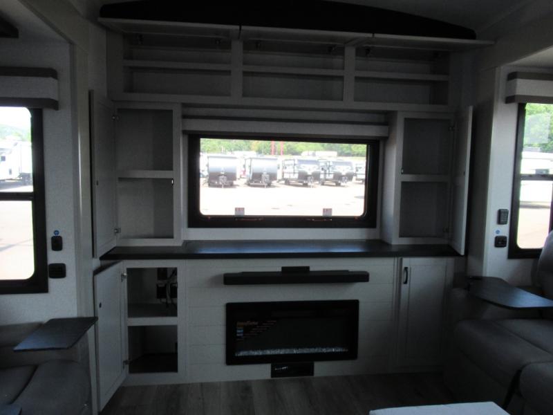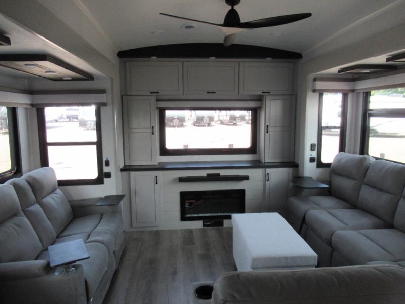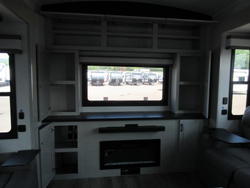 Prepare for great adventures in this fifth wheel! The rear living area features a massive L-shaped sofa which includes a hide-a-bed as well as recliner seats! Plus there's an additional theater seat all facing the entertainment center with a fireplace and 50" Smart TV. A flexible desk/coffee bar connects the living room to the kitchen so you can work or relax as needed. Meals will be easy to prepare with the island with sink and pull-out cutting board, plus pantry, microwave, and residential refrigerator. Up front you will find the private bedroom with its king bed, closet with drawers and hamper, and even a second TV. The full bath features a shower with seat and a linen closet for convenient storage.