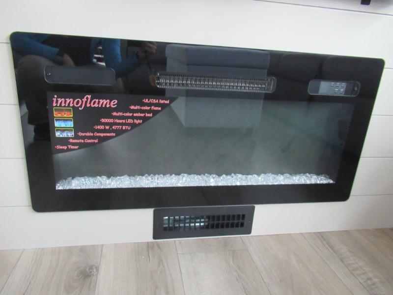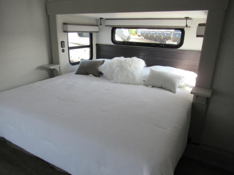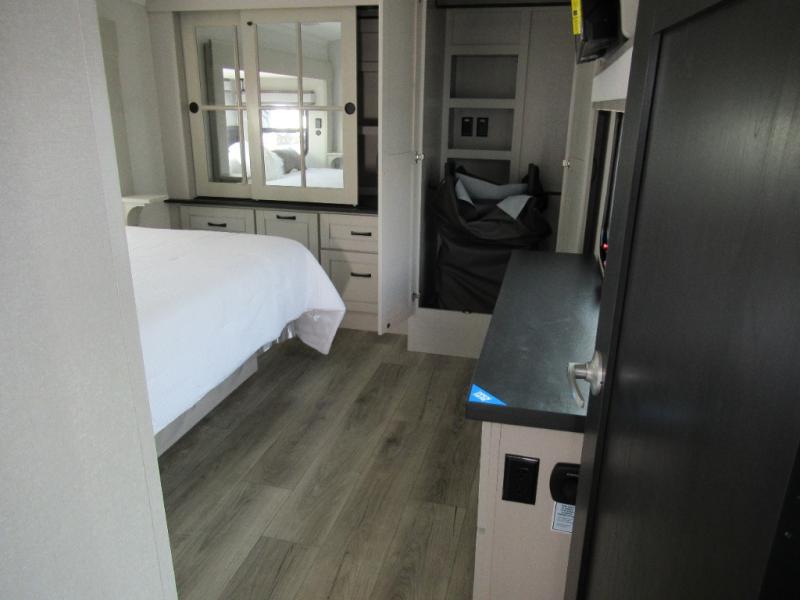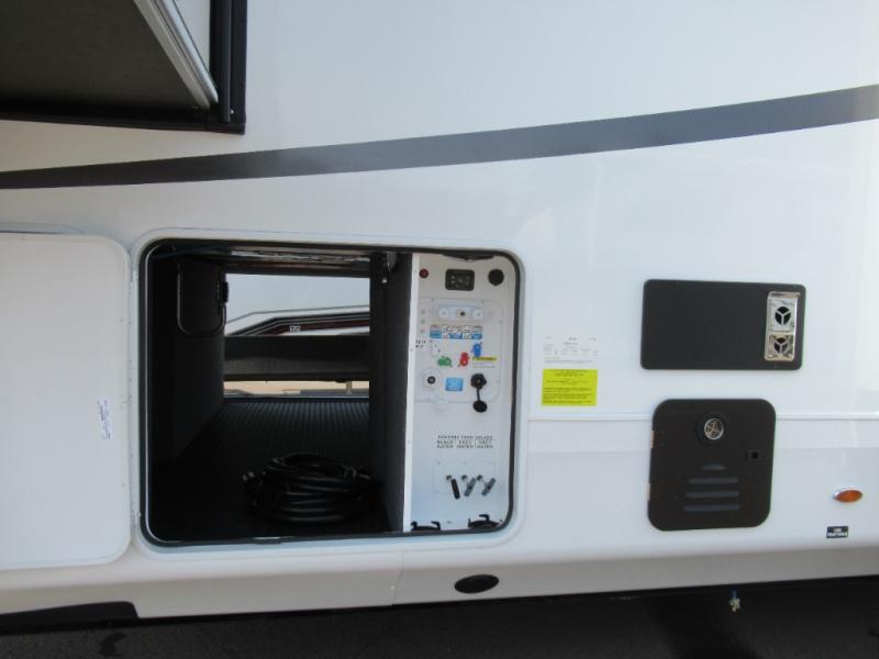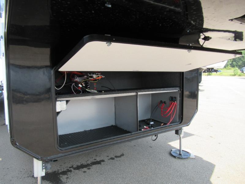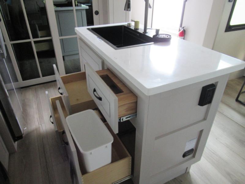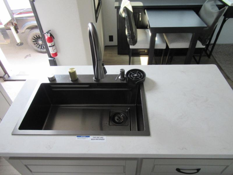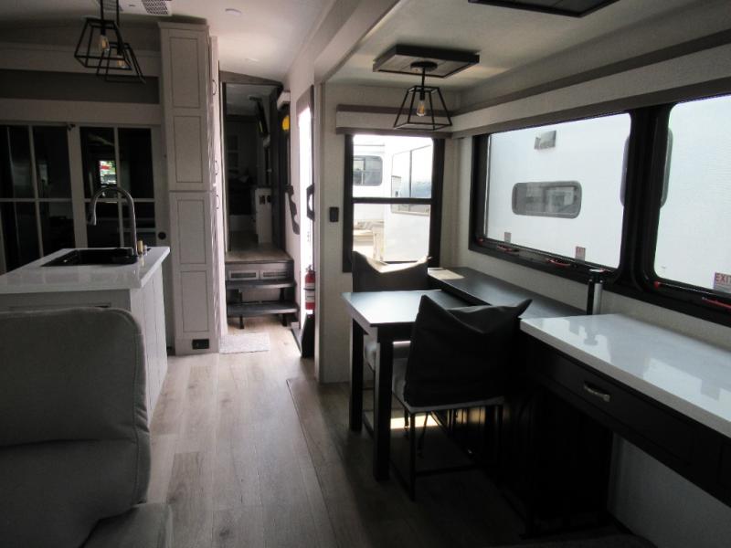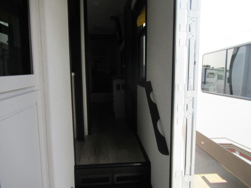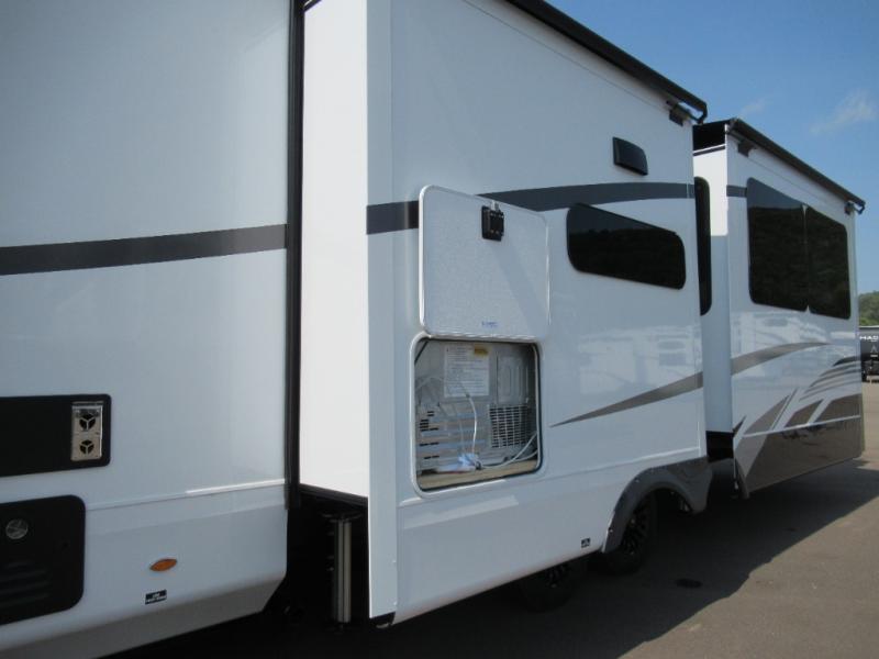 Prepare for great adventures in this fifth wheel! The rear living area features a massive L-shaped sofa which includes a hide-a-bed as well as recliner seats! Plus there's an additional theater seat all facing the entertainment center with a fireplace and 50" Smart TV. A flexible desk/coffee bar connects the living room to the kitchen so you can work or relax as needed. Meals will be easy to prepare with the island with sink and pull-out cutting board, plus pantry, microwave, and residential refrigerator. Up front you will find the private bedroom with its king bed, closet with drawers and hamper, and even a second TV. The full bath features a shower with seat and a linen closet for convenient storage.