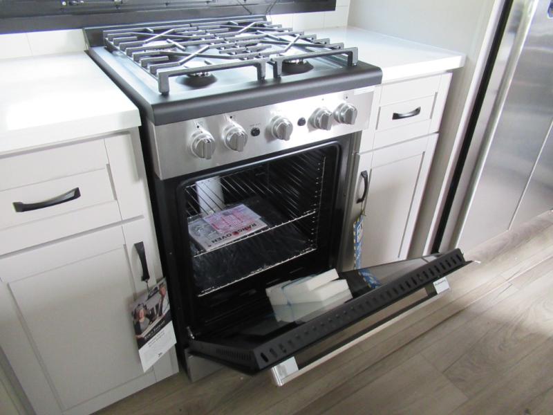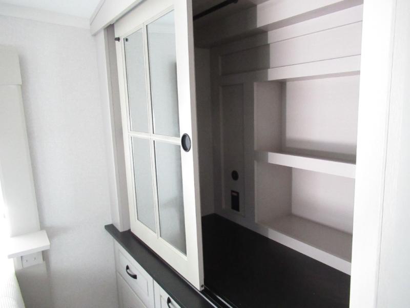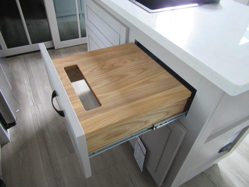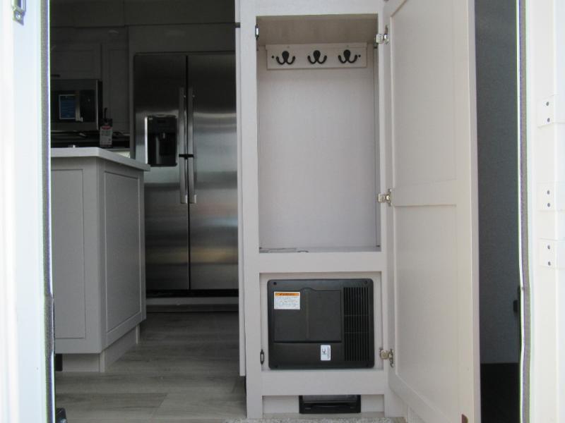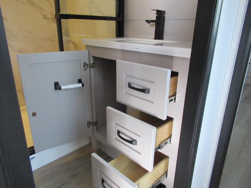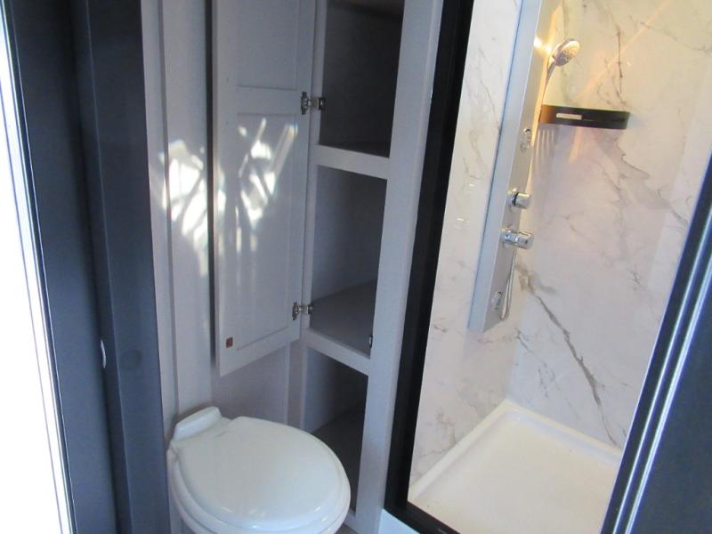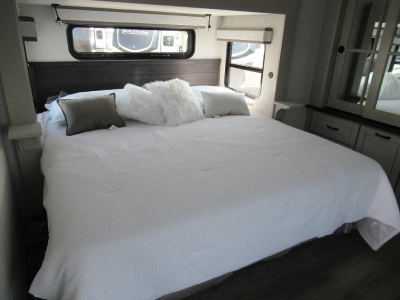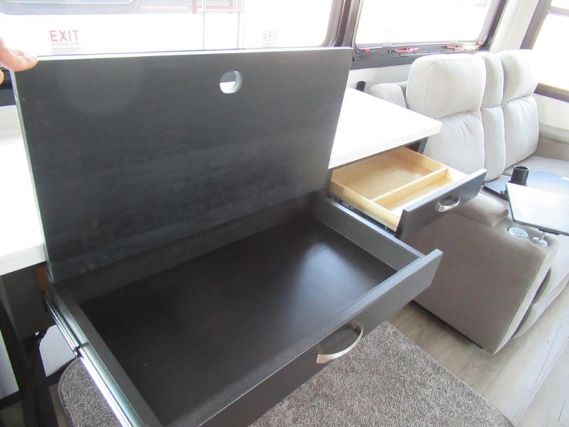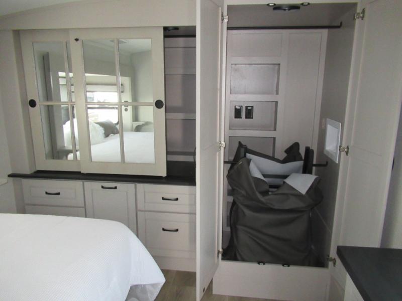 Prepare for great adventures in this fifth wheel! The rear living area features a massive L-shaped sofa which includes a hide-a-bed as well as recliner seats! Plus there's an additional theater seat all facing the entertainment center with a fireplace and 50" Smart TV. A flexible desk/coffee bar connects the living room to the kitchen so you can work or relax as needed. Meals will be easy to prepare with the island with sink and pull-out cutting board, plus pantry, microwave, and residential refrigerator. Up front you will find the private bedroom with its king bed, closet with drawers and hamper, and even a second TV. The full bath features a shower with seat and a linen closet for convenient storage.