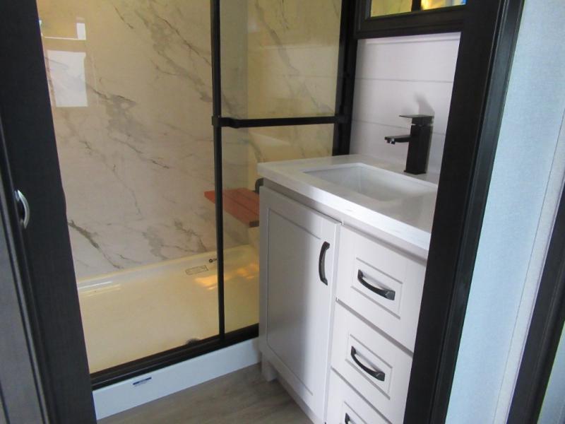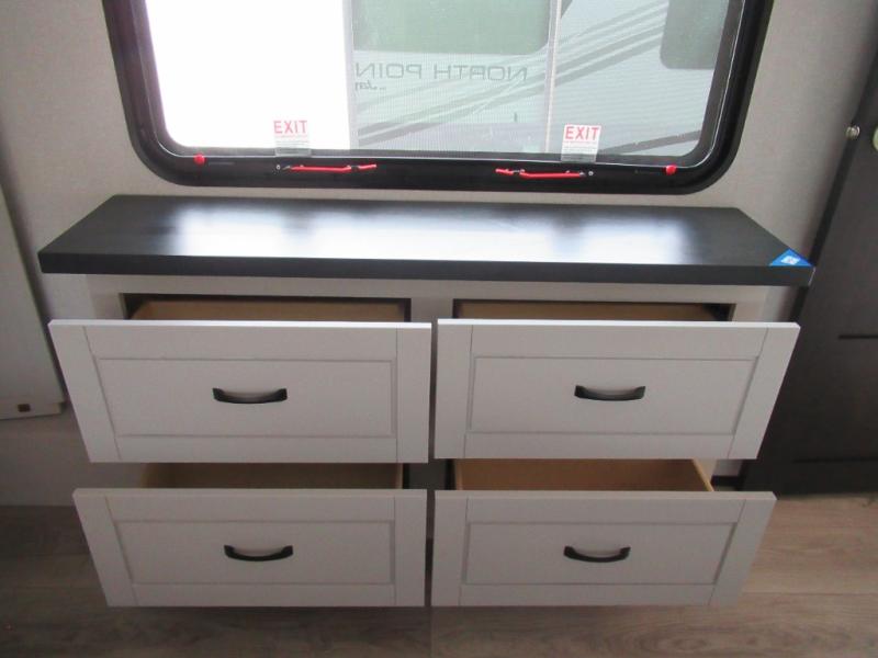 With any North Point fifth wheel by Jayco you begin with a strong foundation with a custom frame, designed and sized specifically to best support each unit. Constructed with Stronghold VBL™ aluminum framed, vacuum bond laminated walls and the Magnum Truss™ XL6™ roof system with an Alpha roof membrane system, which is the strongest tested roof in the industry. The 5-Star Handling package is included with Uniroyal tires, a MORryde rubber pin box, Dexter axles with Nev-R-Adjust brakes, MORryde CRE-3000 rubberized suspension and wet bolt fasteners and bronze bushings. The interior has handcrafted hardwood glazed doors and drawers, vinyl flooring throughout, an integrated under-mount sink in the main bathroom, plus so much more you just have to see one to believe it all!