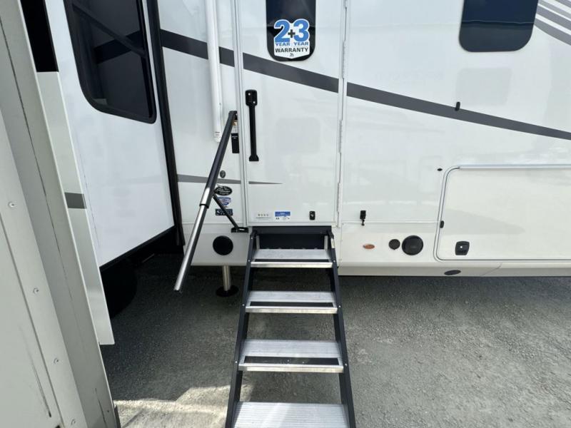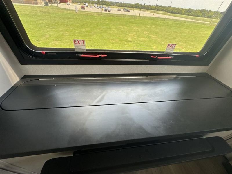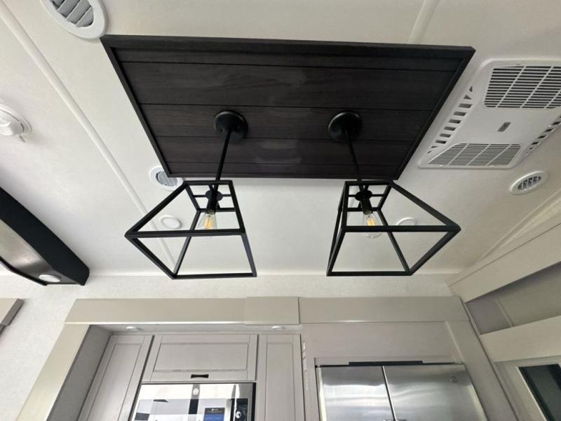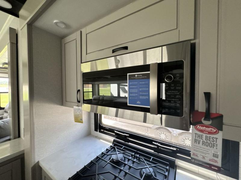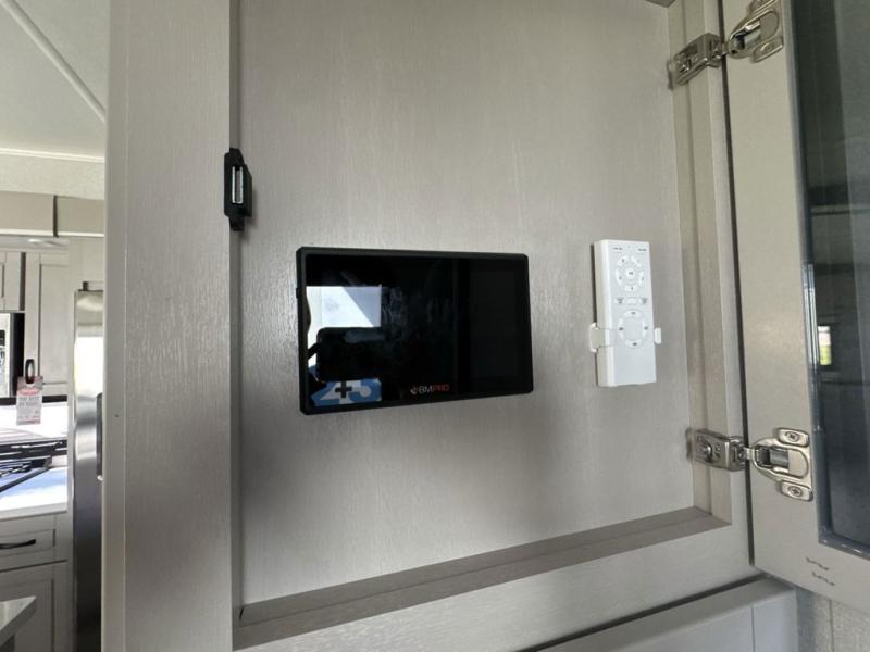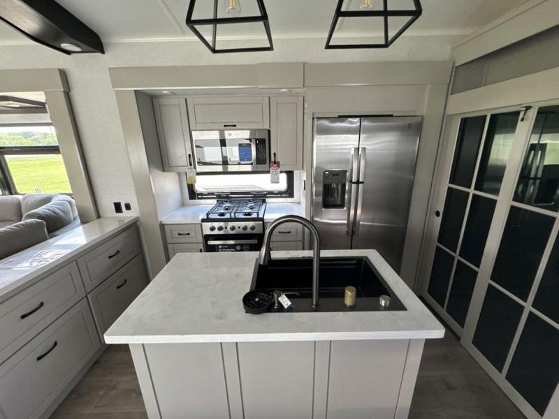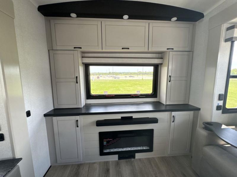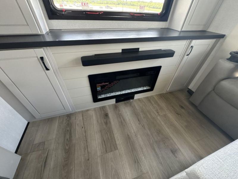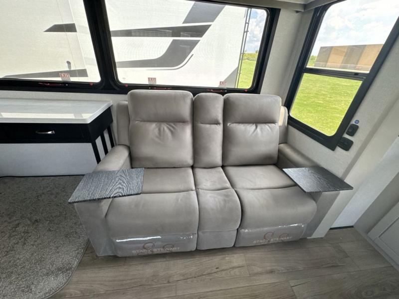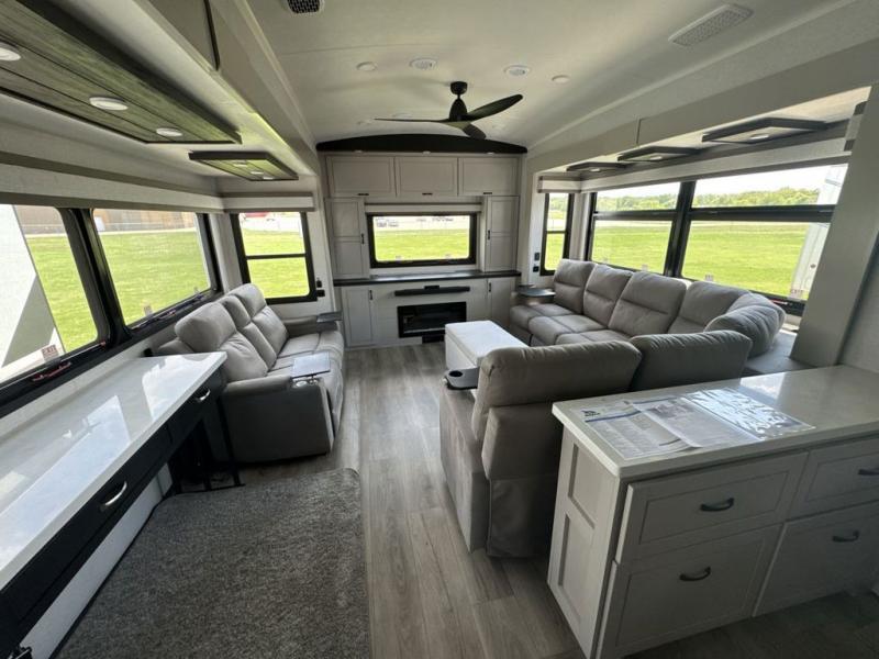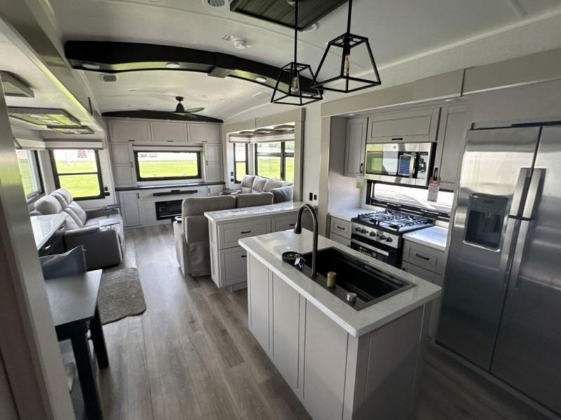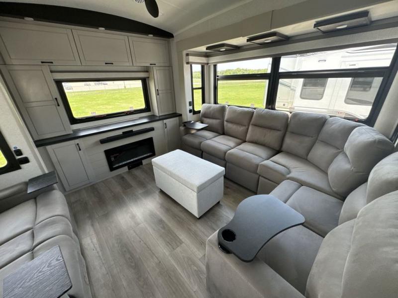 Prepare for great adventures in this fifth wheel! The rear living area features a massive L-shaped sofa which includes a hide-a-bed as well as recliner seats! Plus there's an additional theater seat all facing the entertainment center with a fireplace and 50" Smart TV. A flexible desk/coffee bar connects the living room to the kitchen so you can work or relax as needed. Meals will be easy to prepare with the island with sink and pull-out cutting board, plus pantry, microwave, and residential refrigerator. Up front you will find the private bedroom with its king bed, closet with drawers and hamper, and even a second TV. The full bath features a shower with seat and a linen closet for convenient storage.