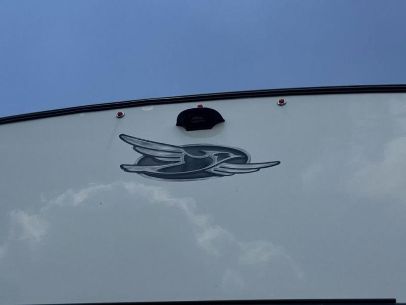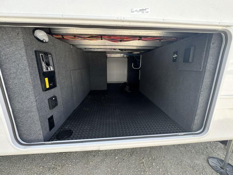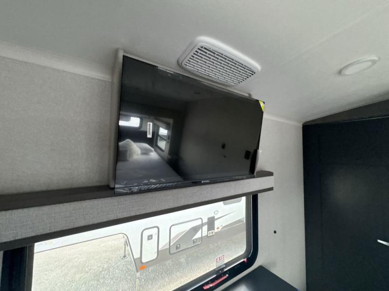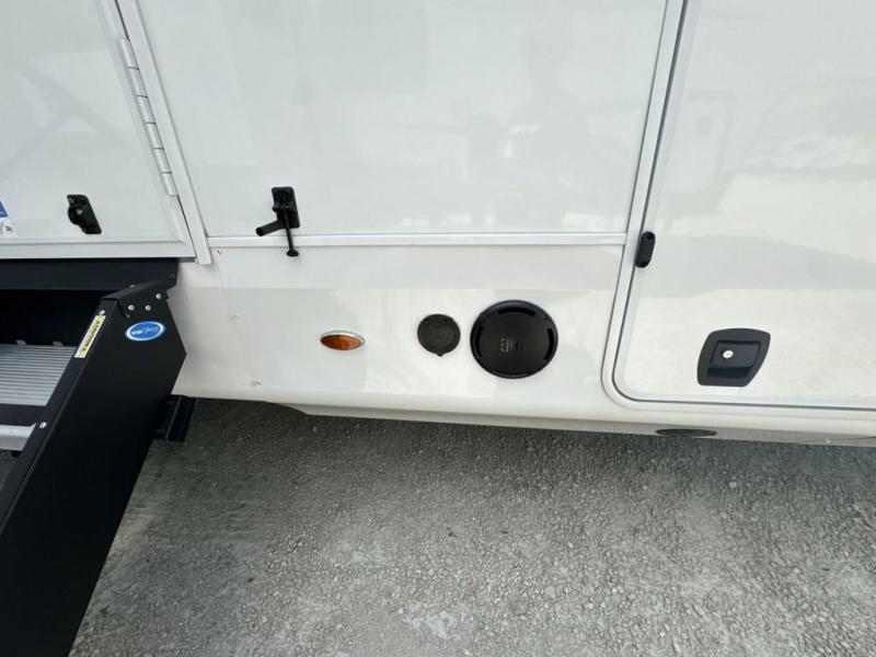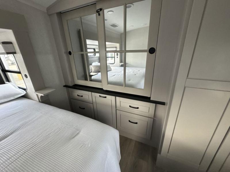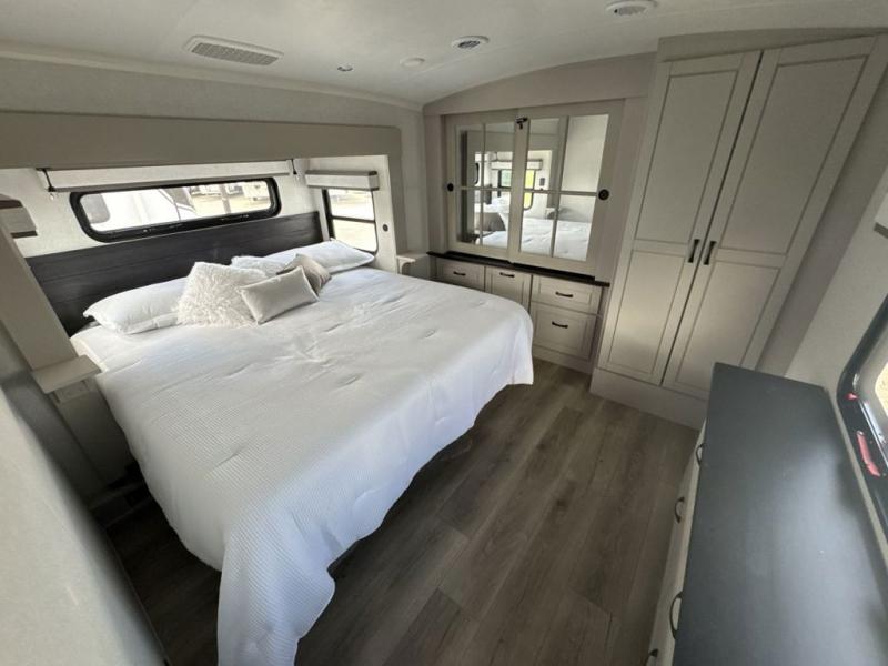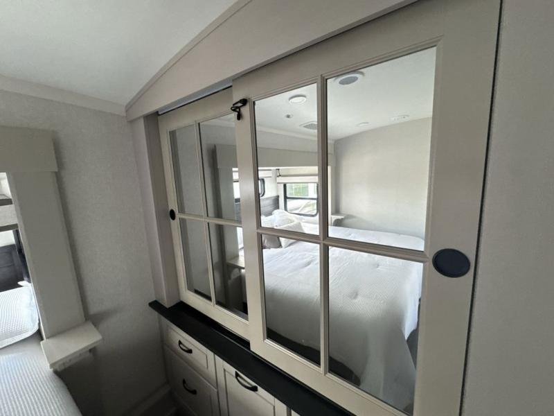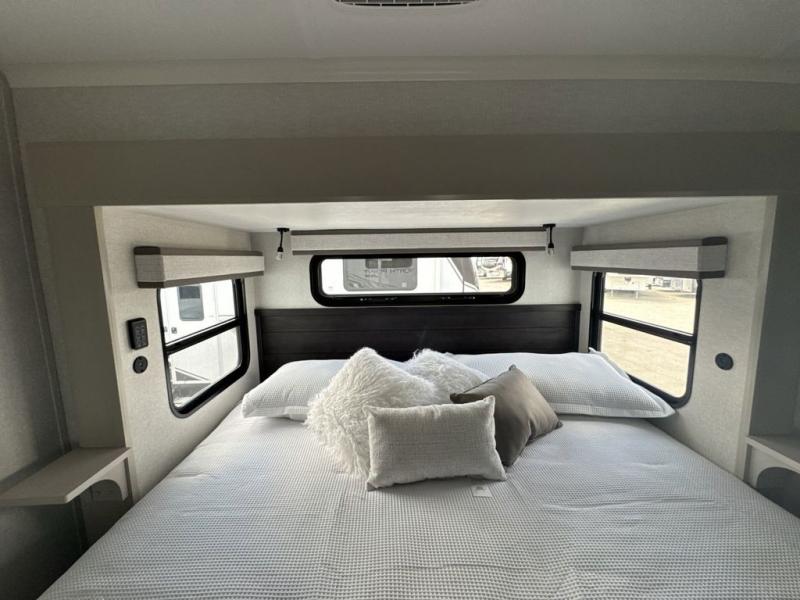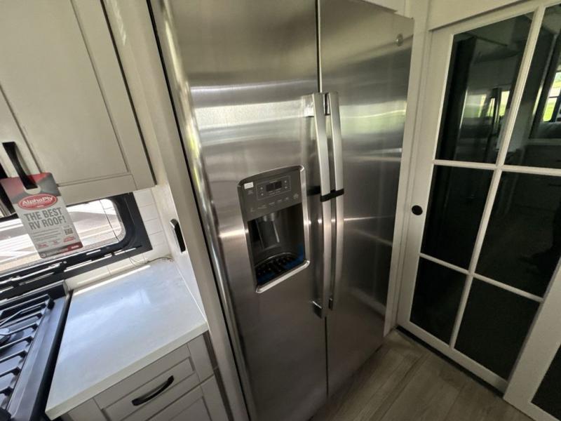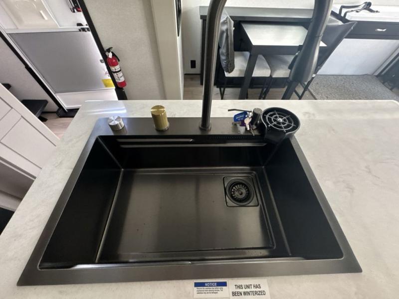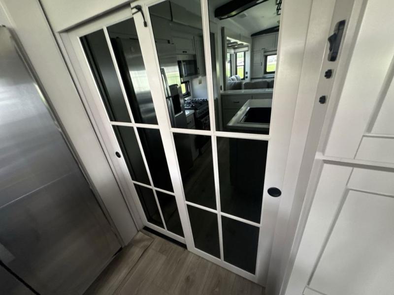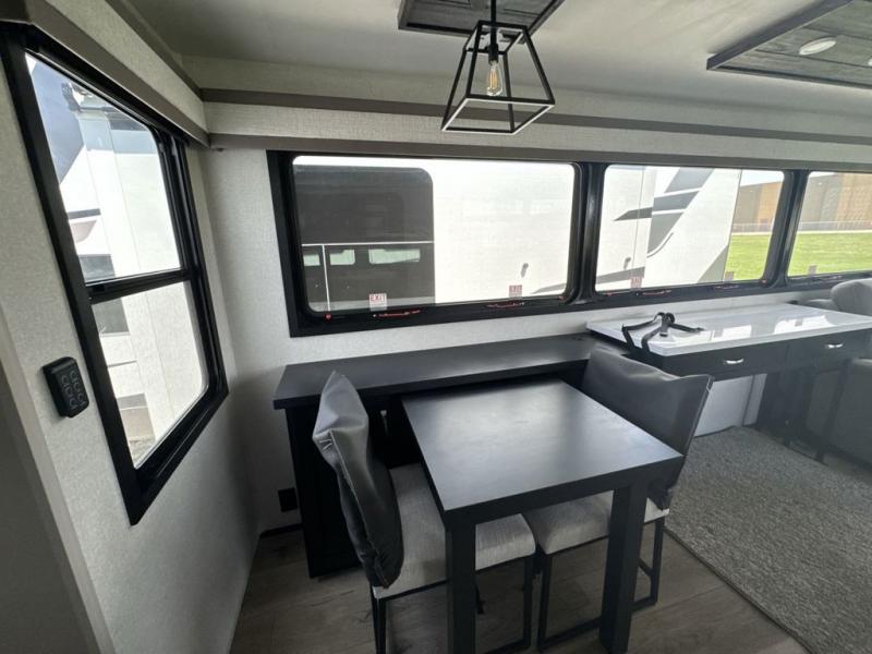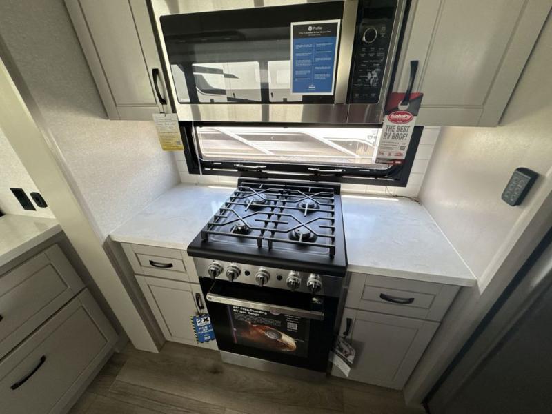 Prepare for great adventures in this fifth wheel! The rear living area features a massive L-shaped sofa which includes a hide-a-bed as well as recliner seats! Plus there's an additional theater seat all facing the entertainment center with a fireplace and 50" Smart TV. A flexible desk/coffee bar connects the living room to the kitchen so you can work or relax as needed. Meals will be easy to prepare with the island with sink and pull-out cutting board, plus pantry, microwave, and residential refrigerator. Up front you will find the private bedroom with its king bed, closet with drawers and hamper, and even a second TV. The full bath features a shower with seat and a linen closet for convenient storage.