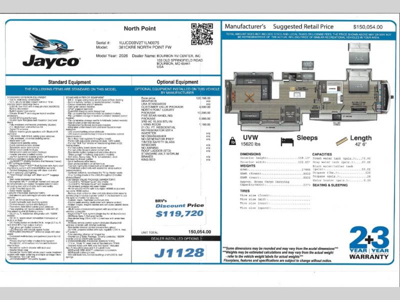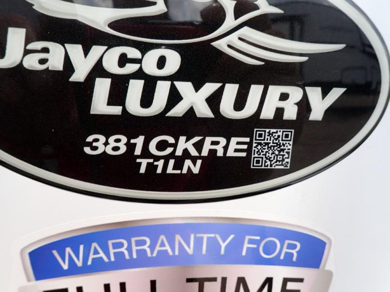 This North Point has a huge rear living room with a L-shaped sofa, theater seating, entertainment center, and fireplace. The North Point 381CKRE is backed by Jayco's industry best 2-year full-time use warranty.