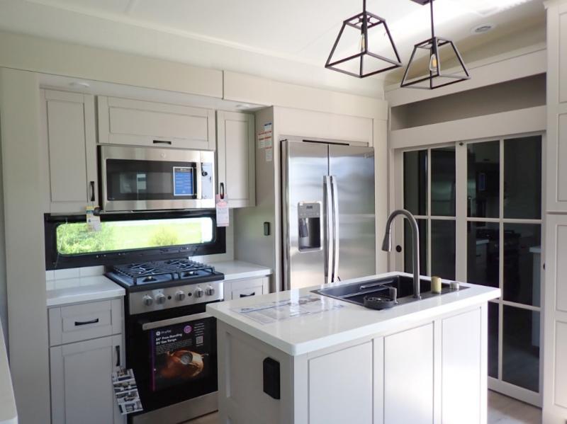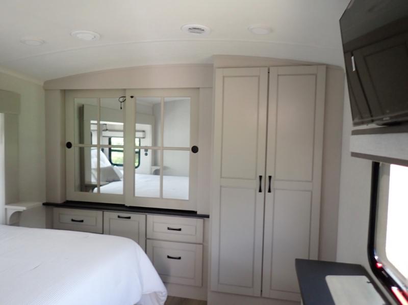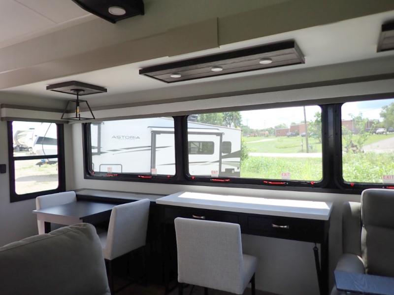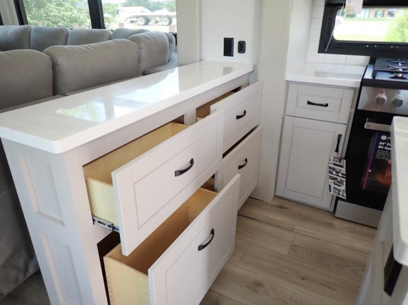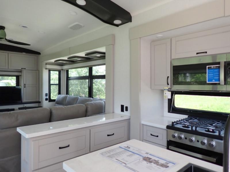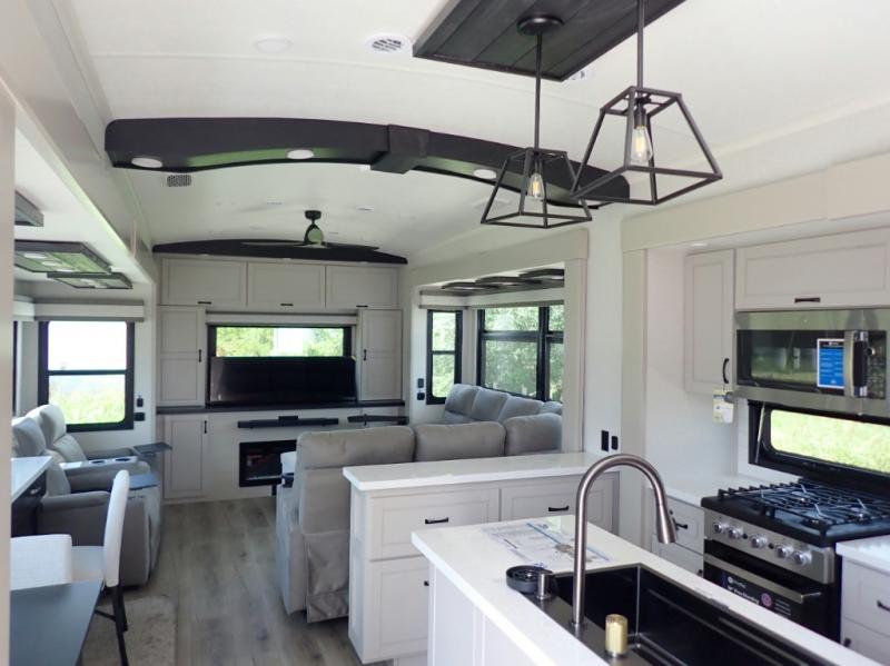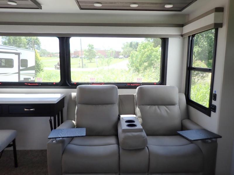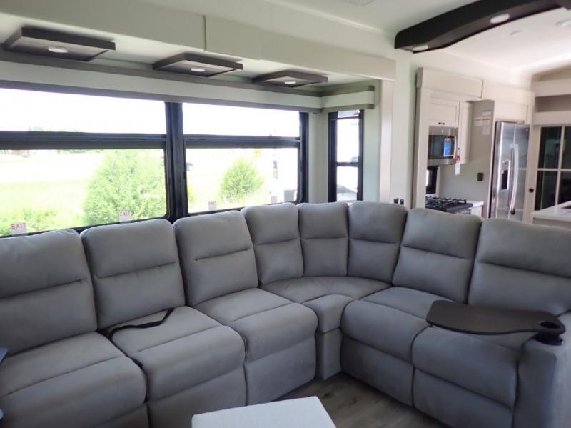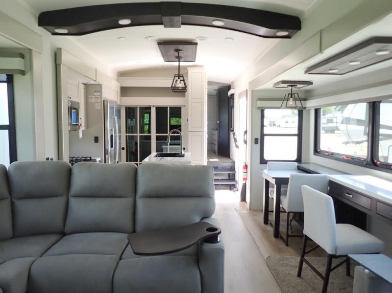 Prepare for great adventures in this fifth wheel! The rear living area features a massive L-shaped sofa which includes a hide-a-bed as well as recliner seats! Plus there's an additional theater seat all facing the entertainment center with a fireplace and 50" Smart TV. A flexible desk/coffee bar connects the living room to the kitchen so you can work or relax as needed. Meals will be easy to prepare with the island with sink and pull-out cutting board, plus pantry, microwave, and residential refrigerator. Up front you will find the private bedroom with its king bed, closet with drawers and hamper, and even a second TV. The full bath features a shower with seat and a linen closet for convenient storage.