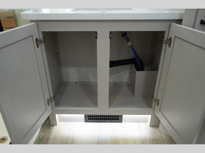 Inside, handcrafted hardwood glazed doors and drawers, vinyl flooring, and an integrated under-mount sink in the main bathroom highlight the elegant and practical interior craftsmanship.