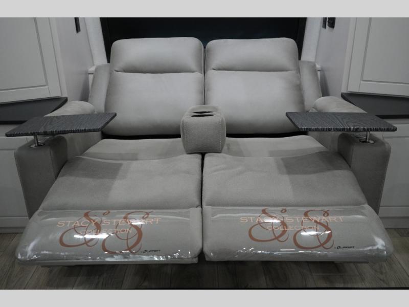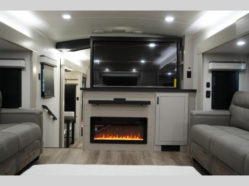 Front Living Area with theater seats, two tri-fold sofas, a 50" Smart LED HDTV, home entertainment system with subwoofer, and a cozy fireplace