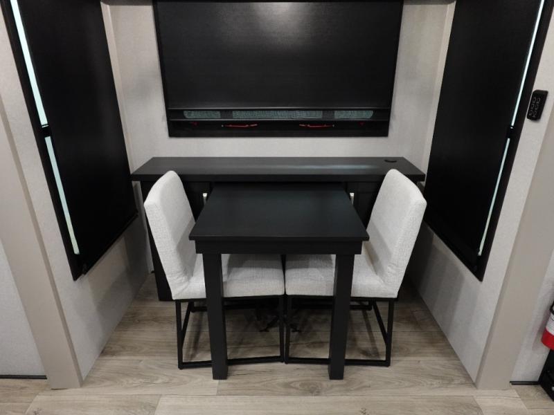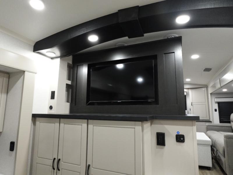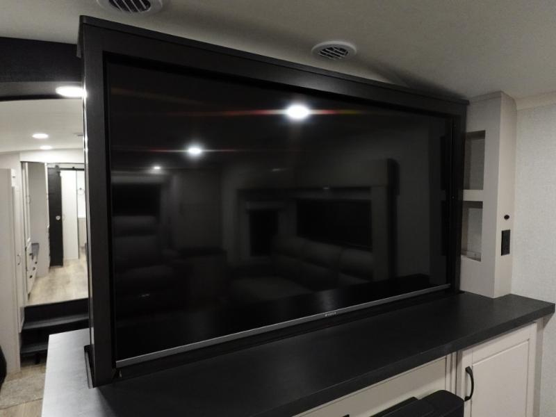 Entertainment can be found throughout this fifth wheel from the front living area with a 50" Smart LED HDTV with fully digital HDMI output and home entertainment system with subwoofer including a fireplace below that you can enjoy while relaxing on theater seats and two tri-fold sofas, a 32" TV in the middle kitchen and there is a bedroom 32" TV. Back inside the kitchen, the cook will love the center island, the pantry, the residential refrigerator, and the roll-top dinette. The half bath is a few steps away as an added convenience. The master bedroom includes a king bed slide, a bench, two wardrobes and a sliding door into the bathroom which offers two sinks and a walk-in shower. And don't forget about the exterior features such as the outside kitchen for more choices when making meals, the storage for your outdoor gear and chairs, and two awnings with integrated LED lighting.