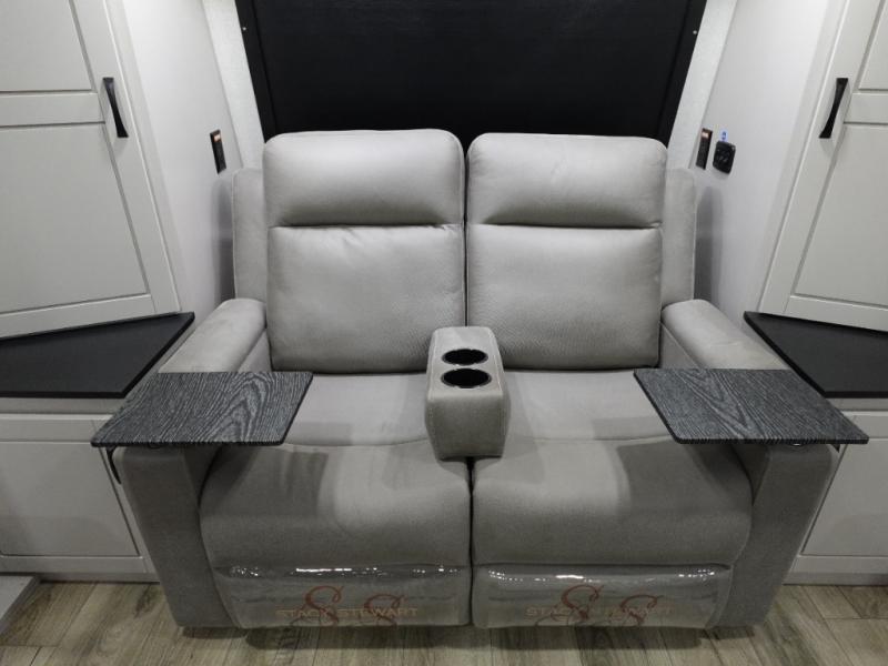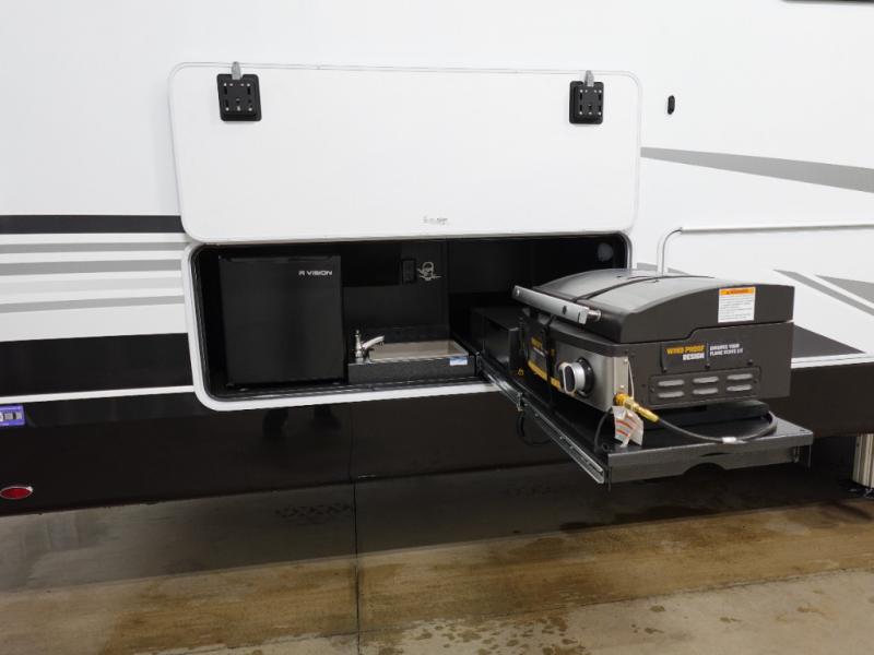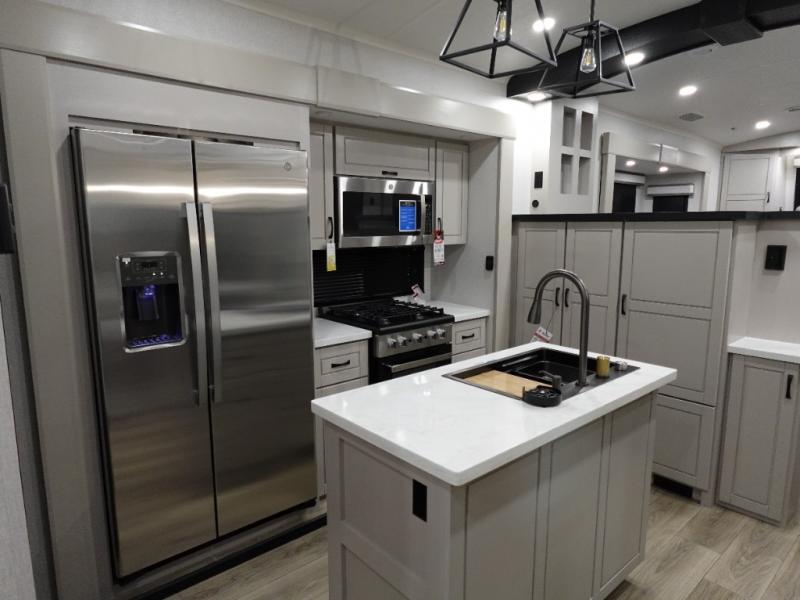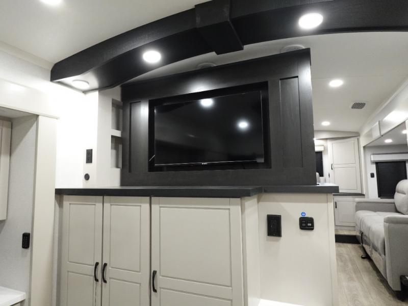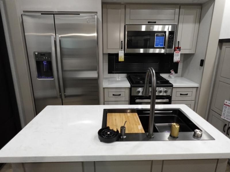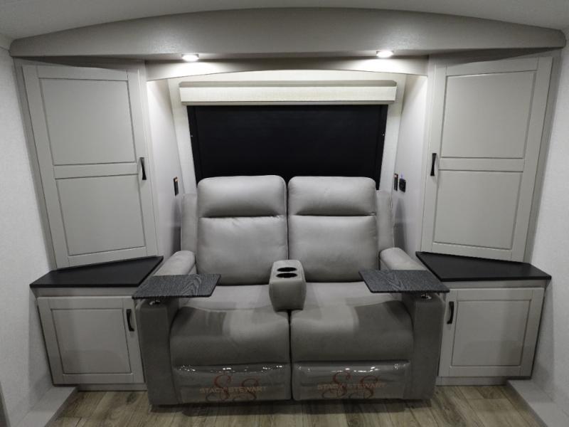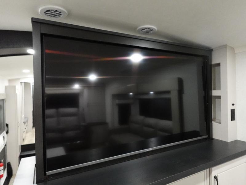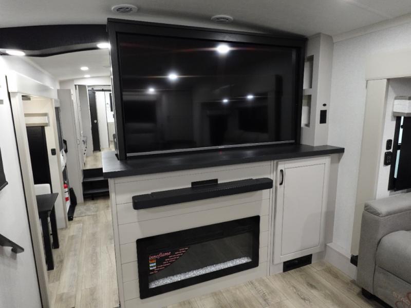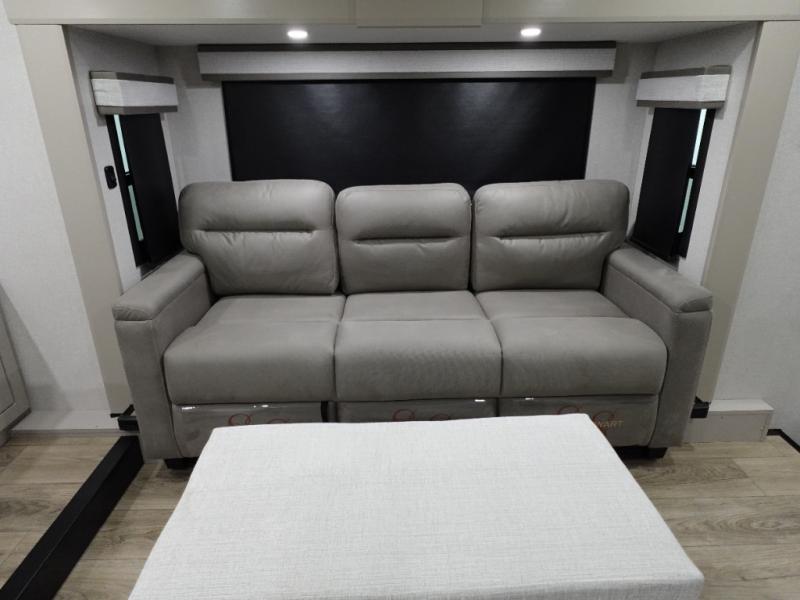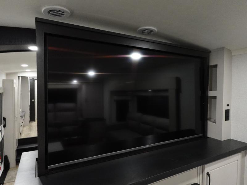 Entertainment can be found throughout this fifth wheel from the front living area with a 50" Smart LED HDTV with fully digital HDMI output and home entertainment system with subwoofer including a fireplace below that you can enjoy while relaxing on theater seats and two tri-fold sofas, a 32" TV in the middle kitchen and there is a bedroom 32" TV. Back inside the kitchen, the cook will love the center island, the pantry, the residential refrigerator, and the roll-top dinette. The half bath is a few steps away as an added convenience. The master bedroom includes a king bed slide, a bench, two wardrobes and a sliding door into the bathroom which offers two sinks, a space prepped for a washer/dryer option, and a walk-in shower. And don't forget about the exterior features such as the outside kitchen for more choices when making meals, the storage for your outdoor gear and chairs, and two awnings with integrated LED lighting.