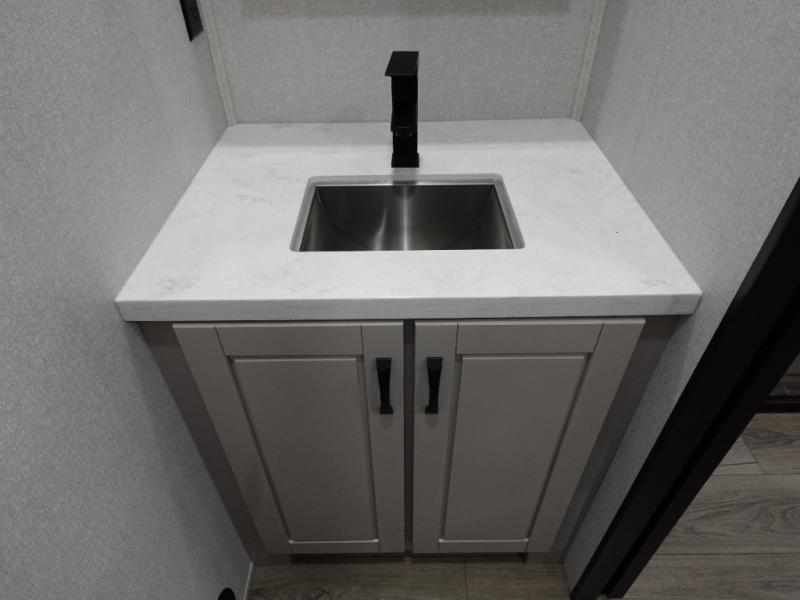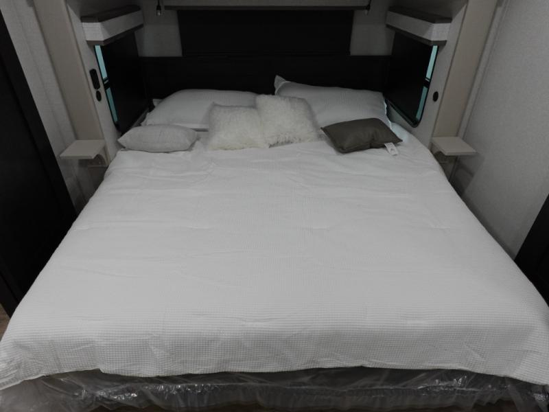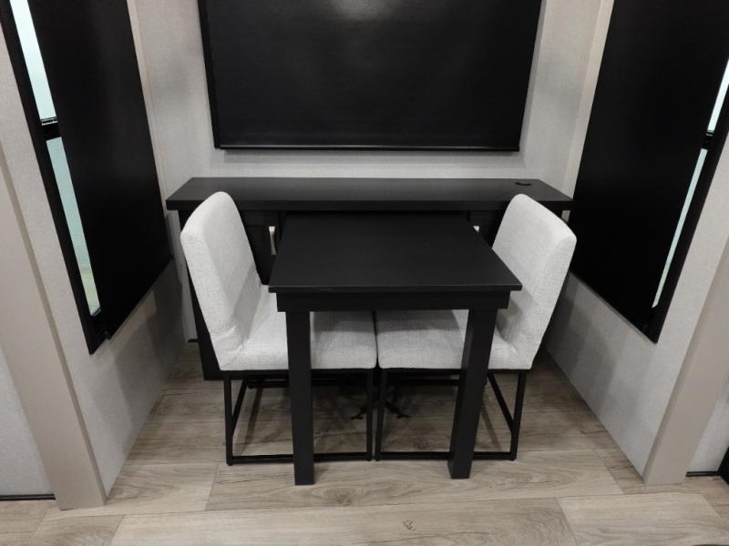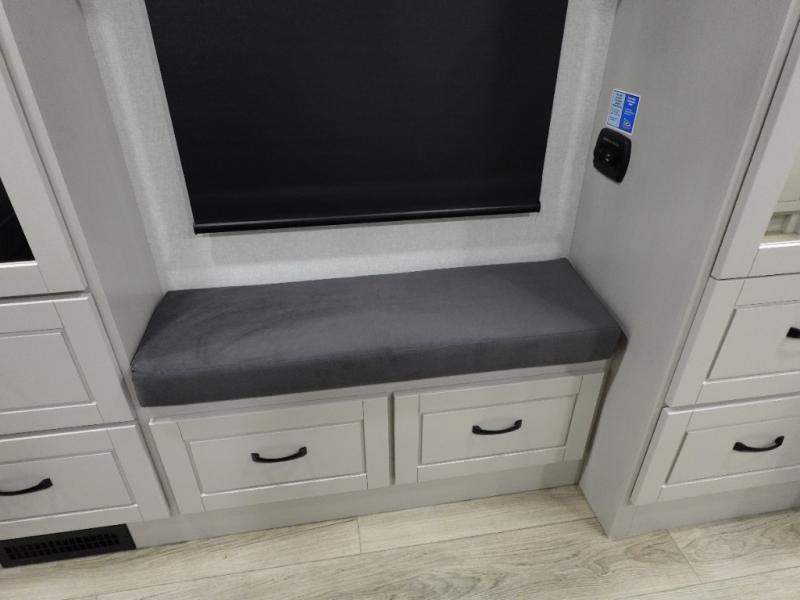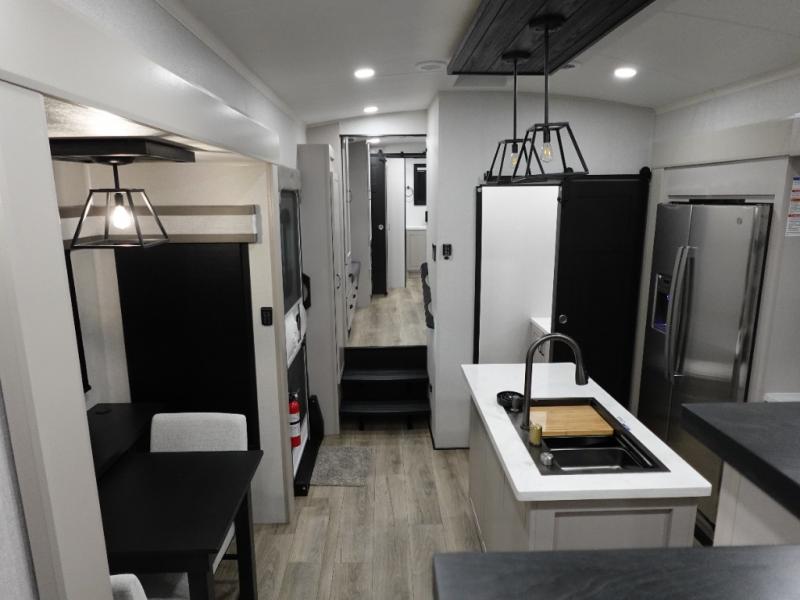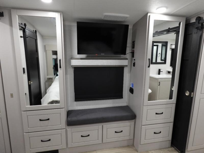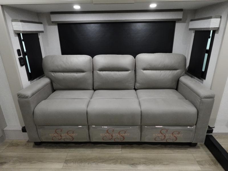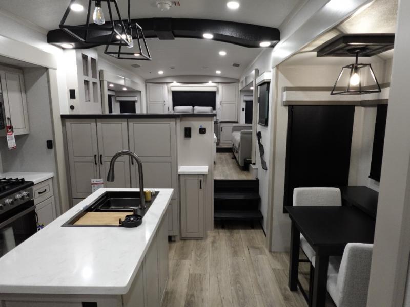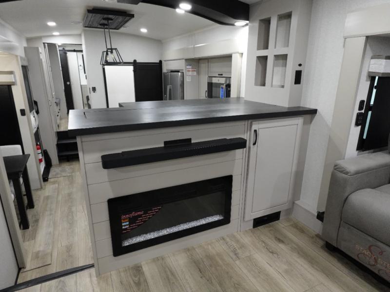Entertainment can be found throughout this fifth wheel from the front living area with a 50" Smart LED HDTV with fully digital HDMI output and home entertainment system with subwoofer including a fireplace below that you can enjoy while relaxing on theater seats and two tri-fold sofas, a 32" TV in the middle kitchen and there is a bedroom 32" TV. Back inside the kitchen, the cook will love the center island, the pantry, the residential refrigerator, and the roll-top dinette. The half bath is a few steps away as an added convenience. The master bedroom includes a king bed slide, a bench, two wardrobes and a sliding door into the bathroom which offers two sinks, a space prepped for a washer/dryer option, and a walk-in shower. And don't forget about the exterior features such as the outside kitchen for more choices when making meals, the storage for your outdoor gear and chairs, and two awnings with integrated LED lighting.