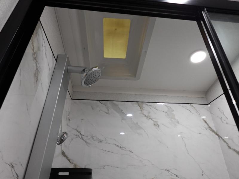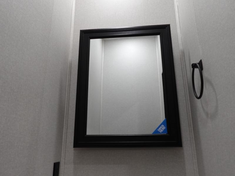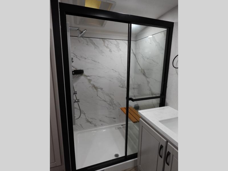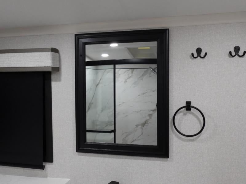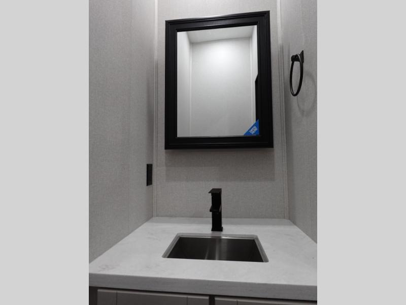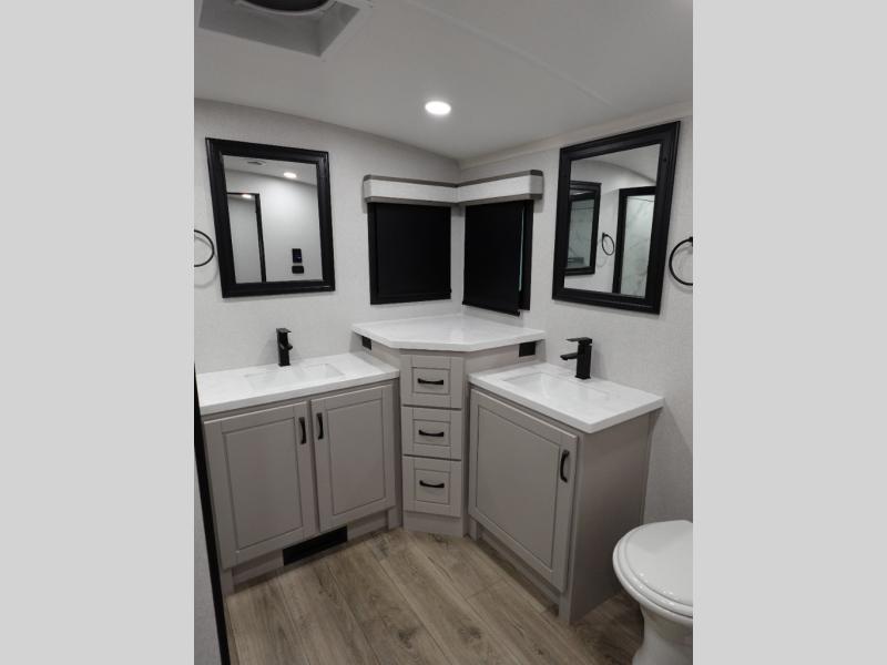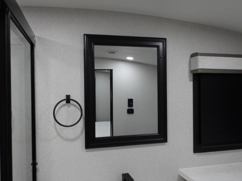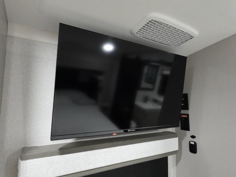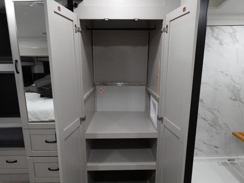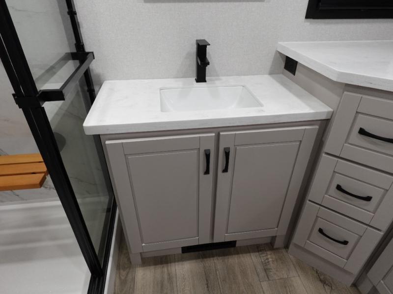 Entertainment can be found throughout this fifth wheel from the front living area with a 50" Smart LED HDTV with fully digital HDMI output and home entertainment system with subwoofer including a fireplace below that you can enjoy while relaxing on theater seats and two tri-fold sofas, a 32" TV in the middle kitchen and there is a bedroom 32" TV. Back inside the kitchen, the cook will love the center island, the pantry, the residential refrigerator, and the roll-top dinette. The half bath is a few steps away as an added convenience. The master bedroom includes a king bed slide, a bench, two wardrobes and a sliding door into the bathroom which offers two sinks, a space prepped for a washer/dryer option, and a walk-in shower. And don't forget about the exterior features such as the outside kitchen for more choices when making meals, the storage for your outdoor gear and chairs, and two awnings with integrated LED lighting.