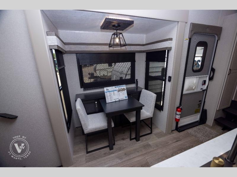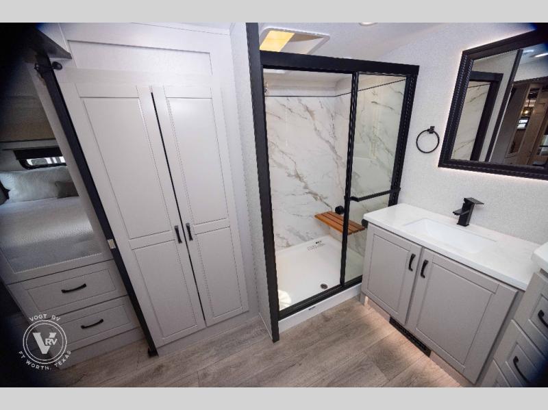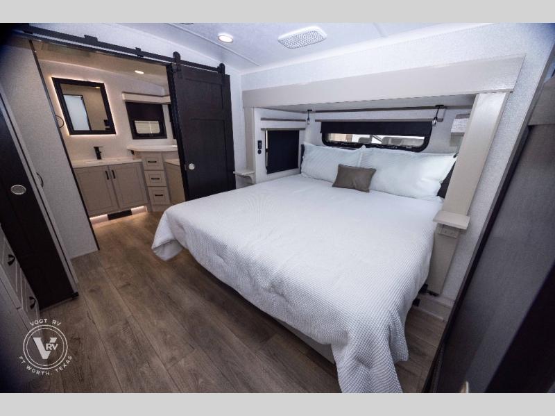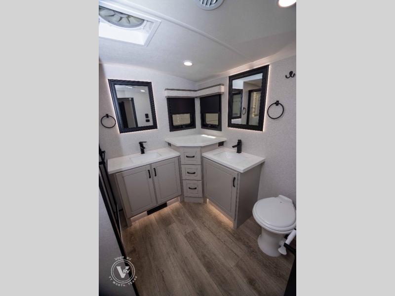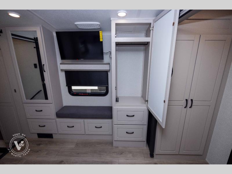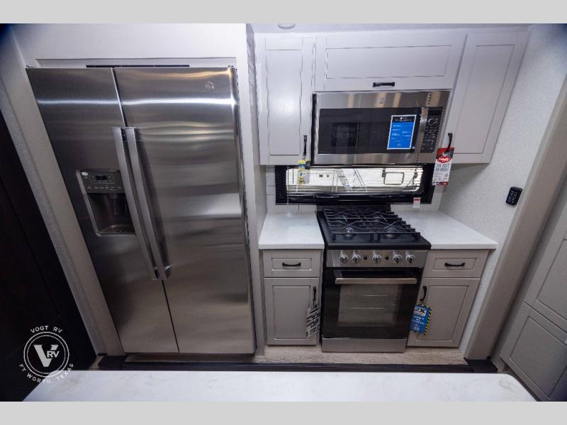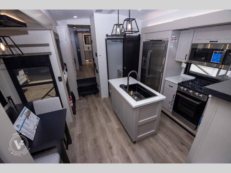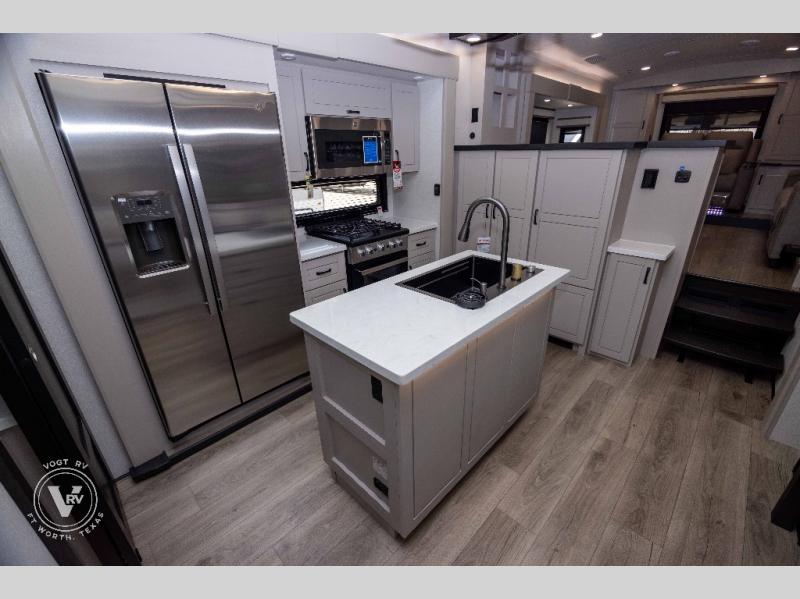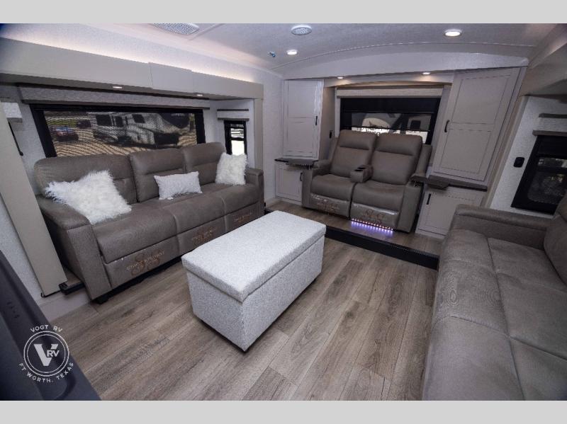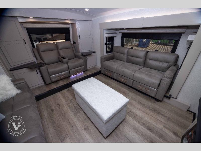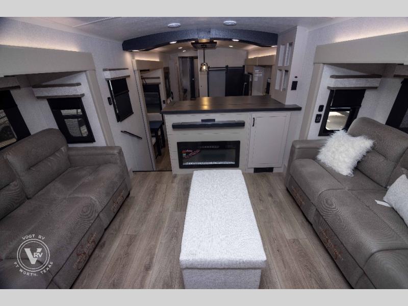 Entertainment can be found throughout this fifth wheel from the front living area with a 50" Smart LED HDTV with fully digital HDMI output and home entertainment system with subwoofer including a fireplace below that you can enjoy while relaxing on theater seats and two tri-fold sofas, a 32" TV in the middle kitchen and there is a bedroom 32" TV. You might even like to add the tailgate TV option along the exterior. Back inside the kitchen, the cook will love the center island, the pantry, the residential refrigerator, and the roll-top dinette. The half bath is a few steps away as an added convenience. The master bedroom includes a king bed slide, a bench, two wardrobes and a sliding door into the bathroom which offers two sinks, a space prepped for a washer/dryer option, and a walk-in shower. And don't forget about the exterior features such as the outside kitchen for more choices when making meals, the storage for your outdoor gear and chairs, and two awnings with integrated LED lighting.