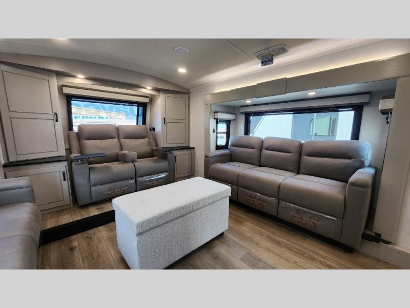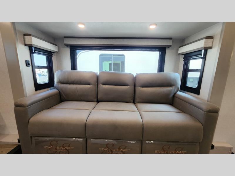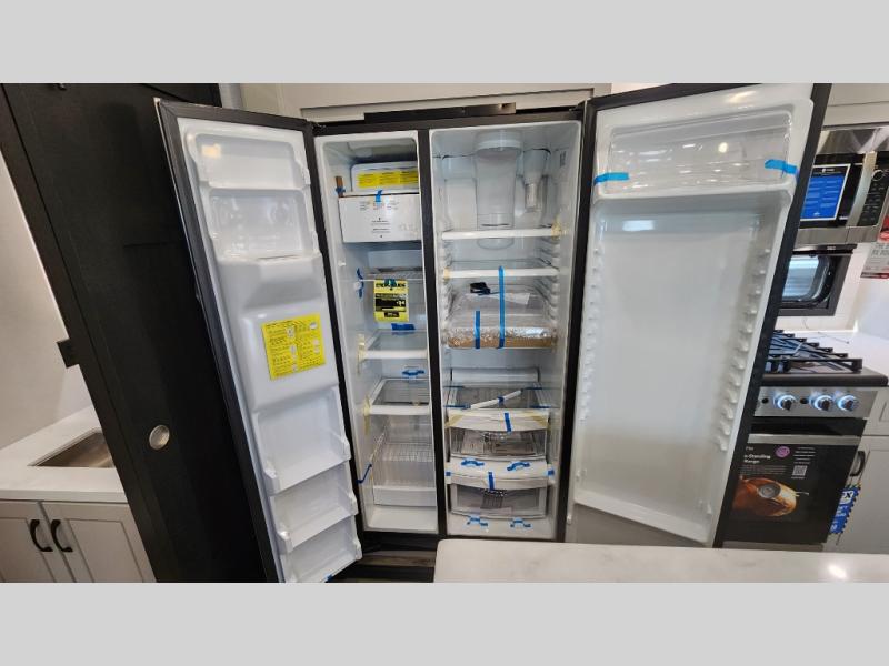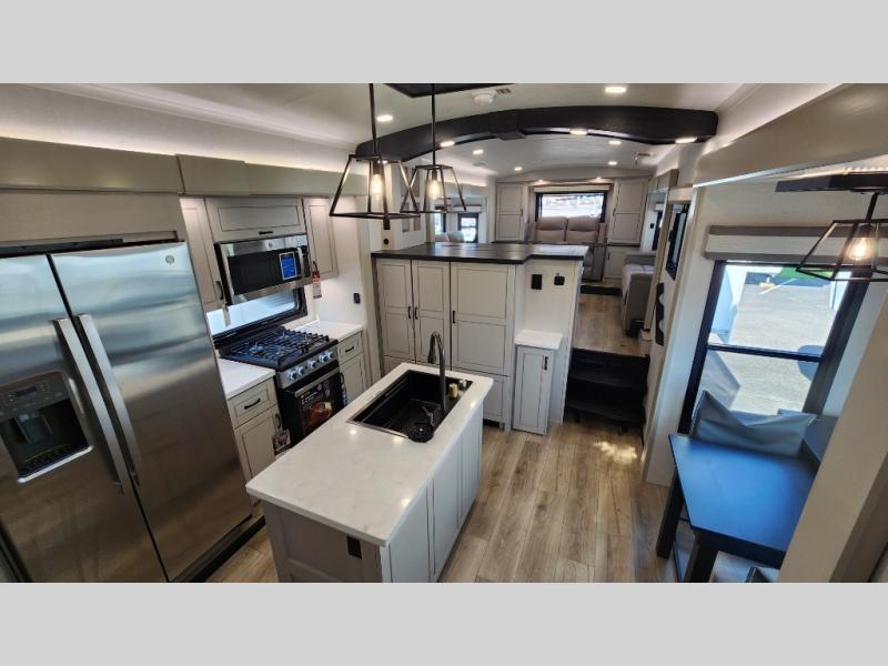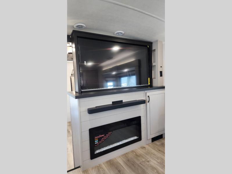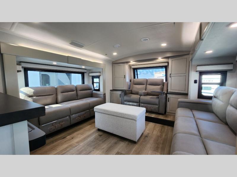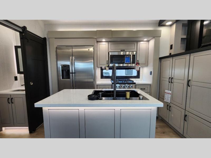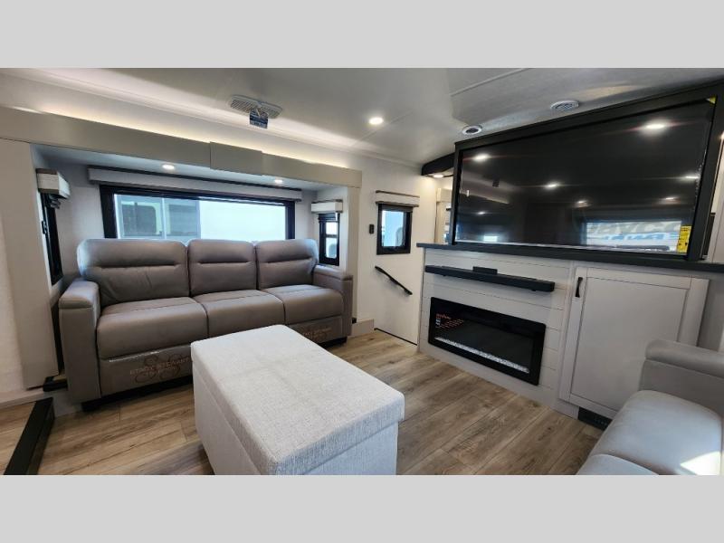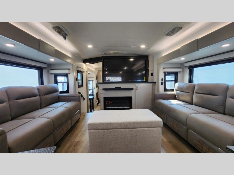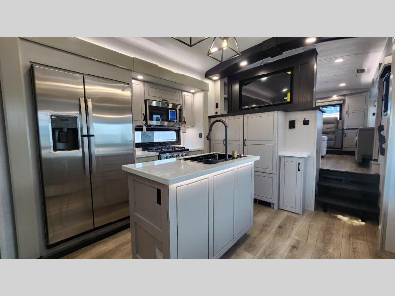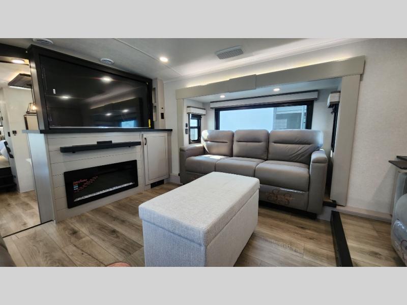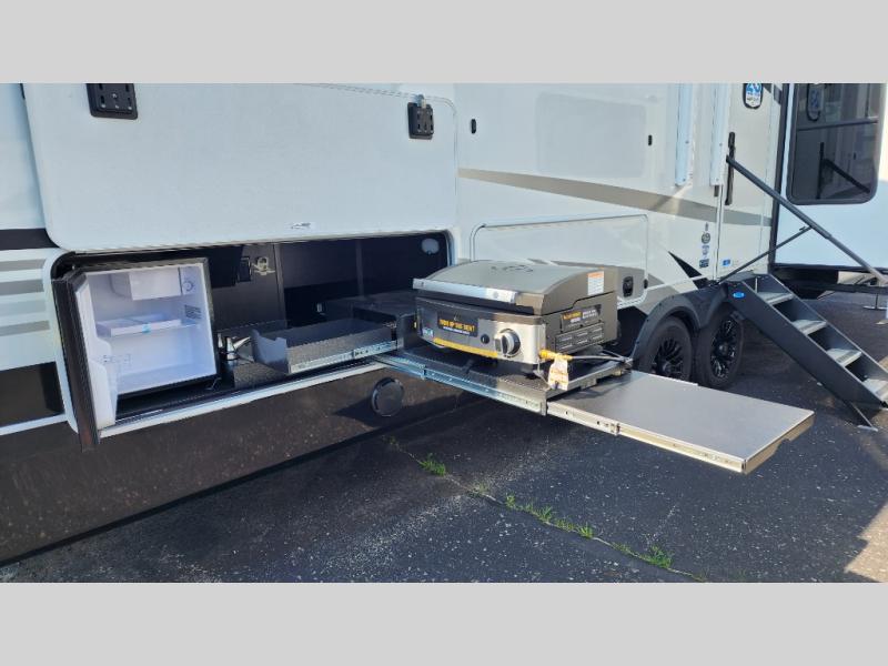 Entertainment can be found throughout this fifth wheel from the front living area with a 50" Smart LED HDTV with fully digital HDMI output and home entertainment system with subwoofer including a fireplace below that you can enjoy while relaxing on theater seats and two tri-fold sofas, a 32" TV in the middle kitchen and there is a bedroom 32" TV. You might even like to add the tailgate TV option along the exterior. Back inside the kitchen, the cook will love the center island, the pantry, the residential refrigerator, and the roll-top dinette. The half bath is a few steps away as an added convenience. The master bedroom includes a king bed slide, a bench, two wardrobes and a sliding door into the bathroom which offers two sinks, a space prepped for a washer/dryer option, and a walk-in shower. And don't forget about the exterior features such as the outside kitchen for more choices when making meals, the storage for your outdoor gear and chairs, and two awnings with integrated LED lighting.