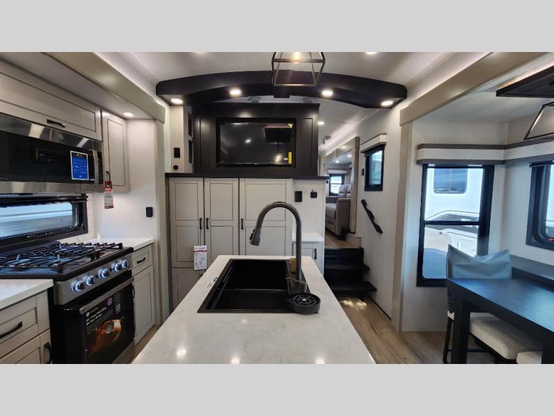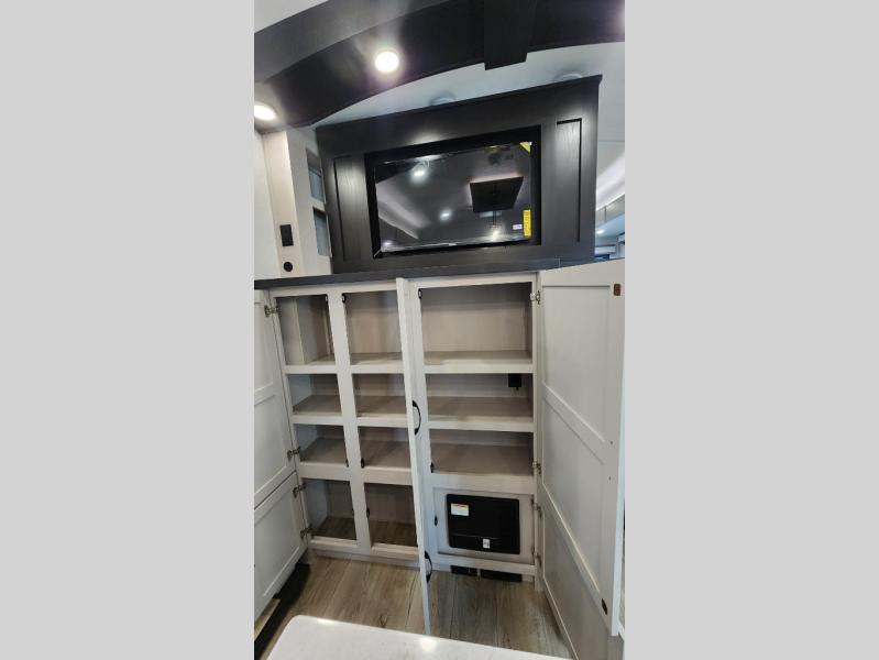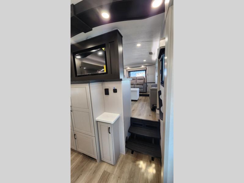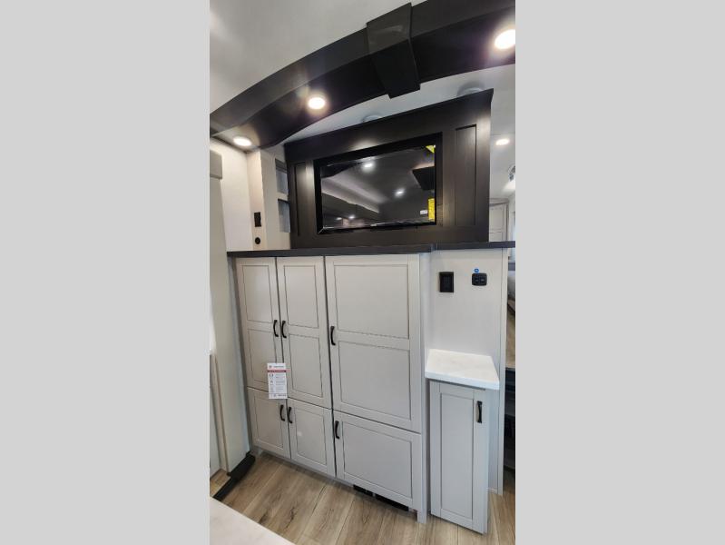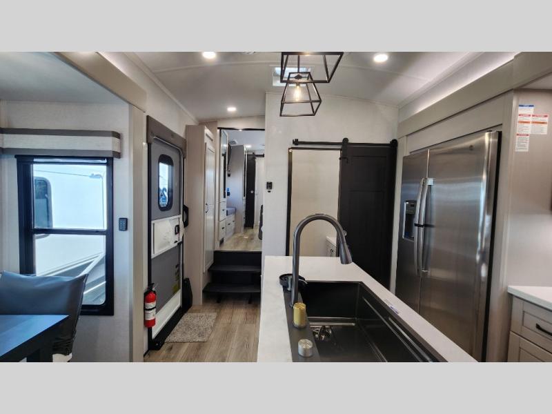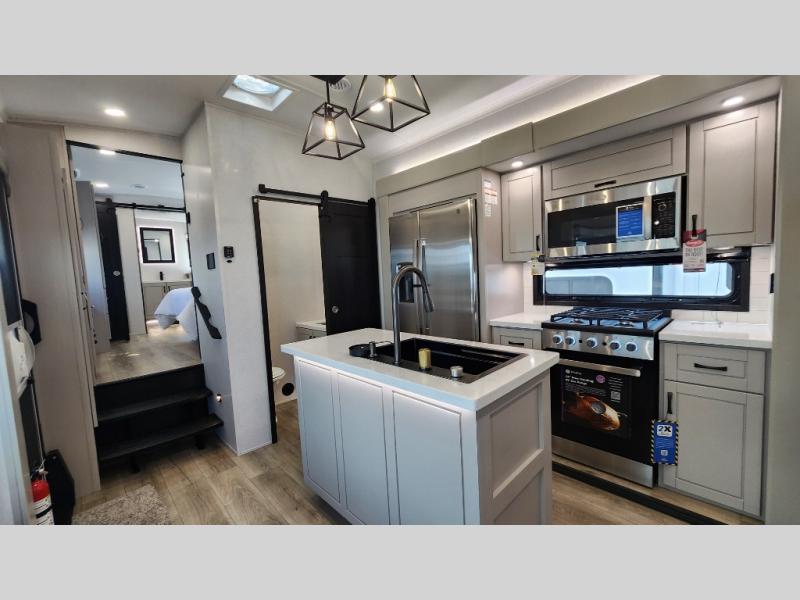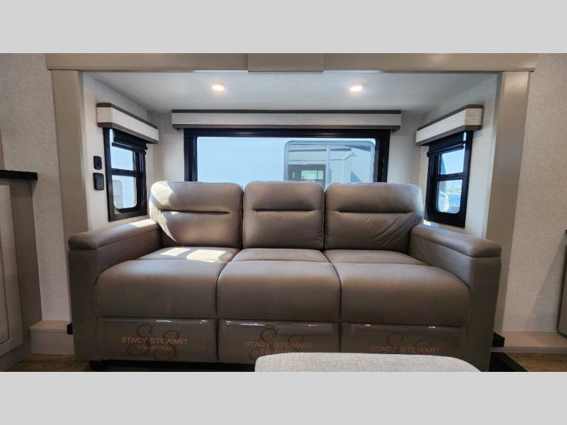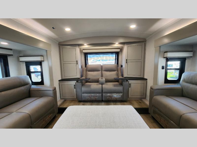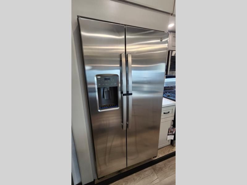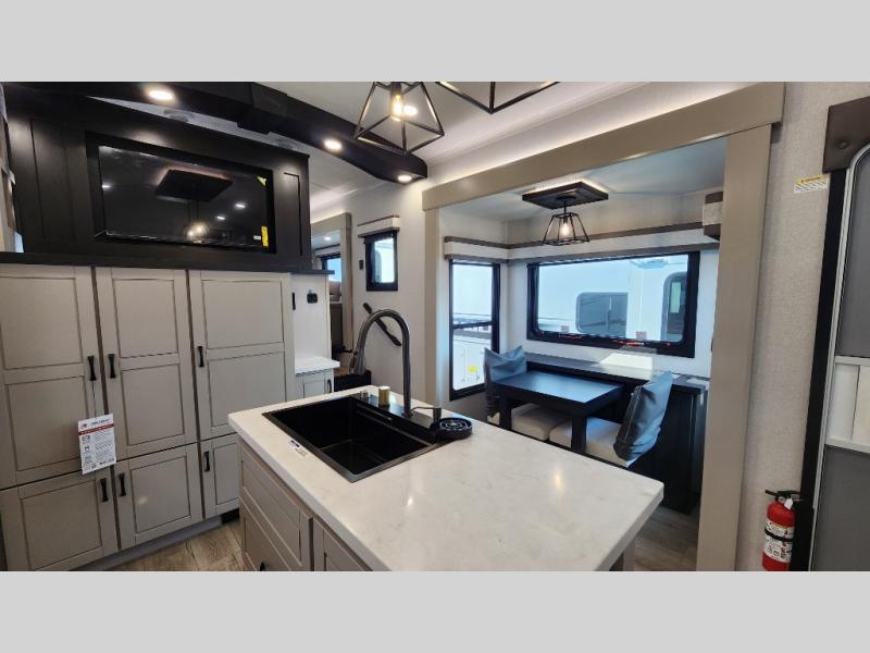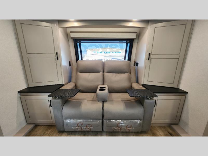 Entertainment can be found throughout this fifth wheel from the front living area with a 50" Smart LED HDTV with fully digital HDMI output and home entertainment system with subwoofer including a fireplace below that you can enjoy while relaxing on theater seats and two tri-fold sofas, a 32" TV in the middle kitchen and there is a bedroom 32" TV. You might even like to add the tailgate TV option along the exterior. Back inside the kitchen, the cook will love the center island, the pantry, the residential refrigerator, and the roll-top dinette. The half bath is a few steps away as an added convenience. The master bedroom includes a king bed slide, a bench, two wardrobes and a sliding door into the bathroom which offers two sinks, a space prepped for a washer/dryer option, and a walk-in shower. And don't forget about the exterior features such as the outside kitchen for more choices when making meals, the storage for your outdoor gear and chairs, and two awnings with integrated LED lighting.