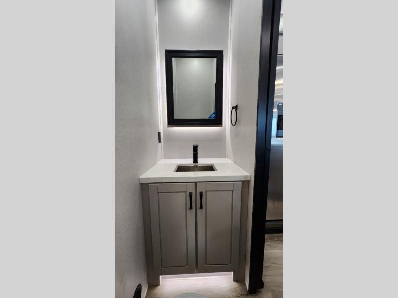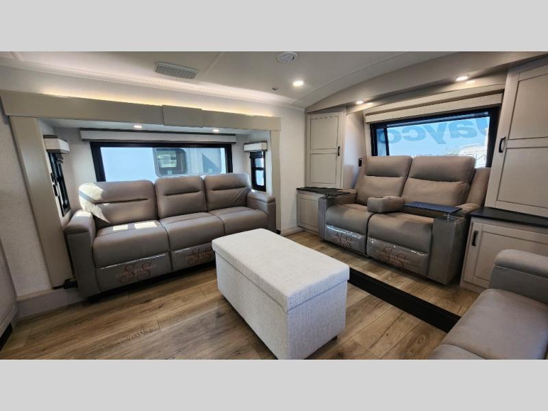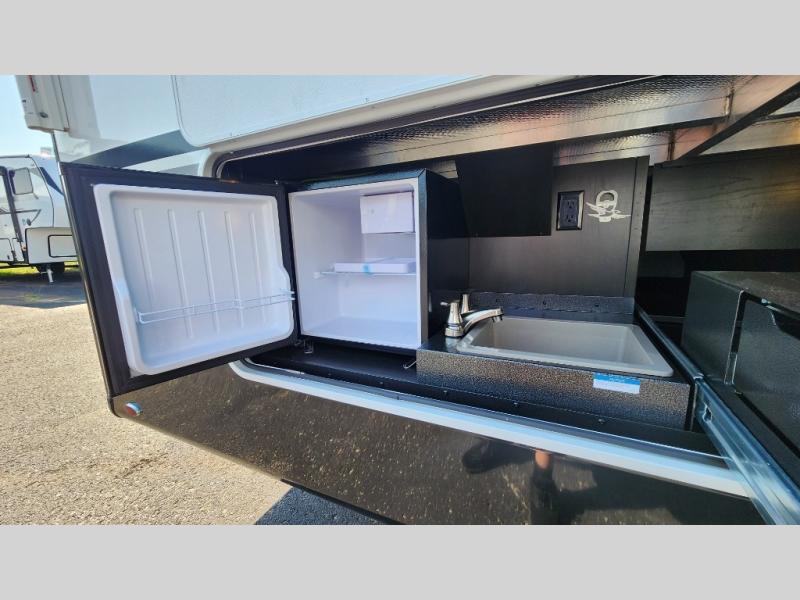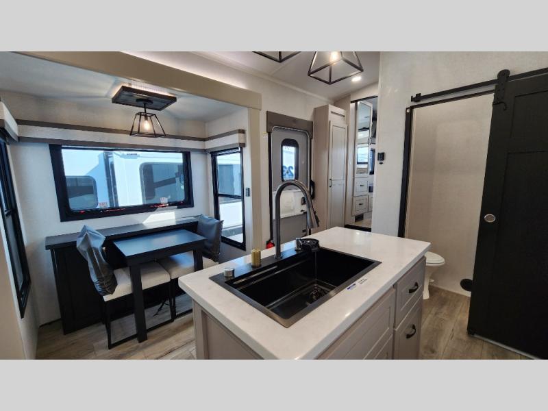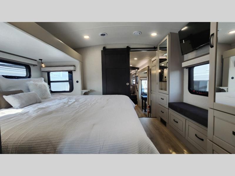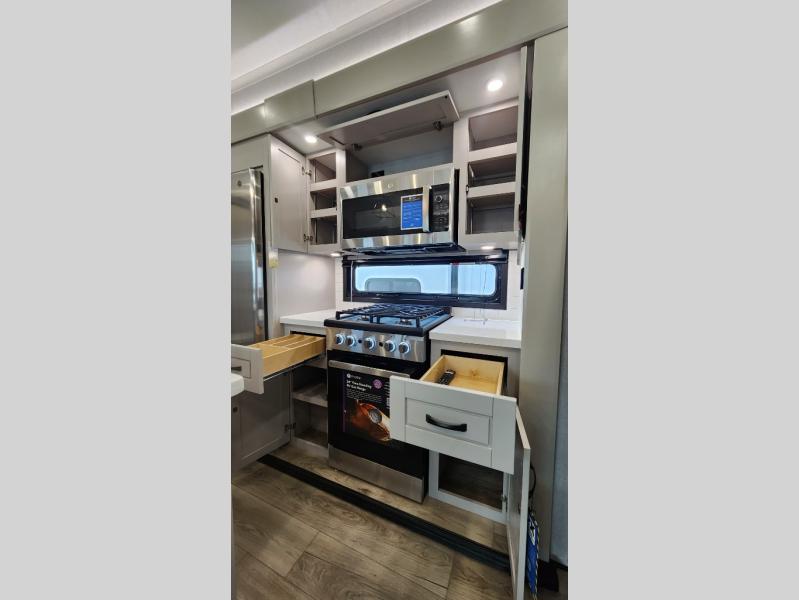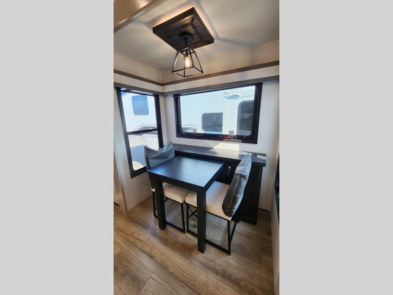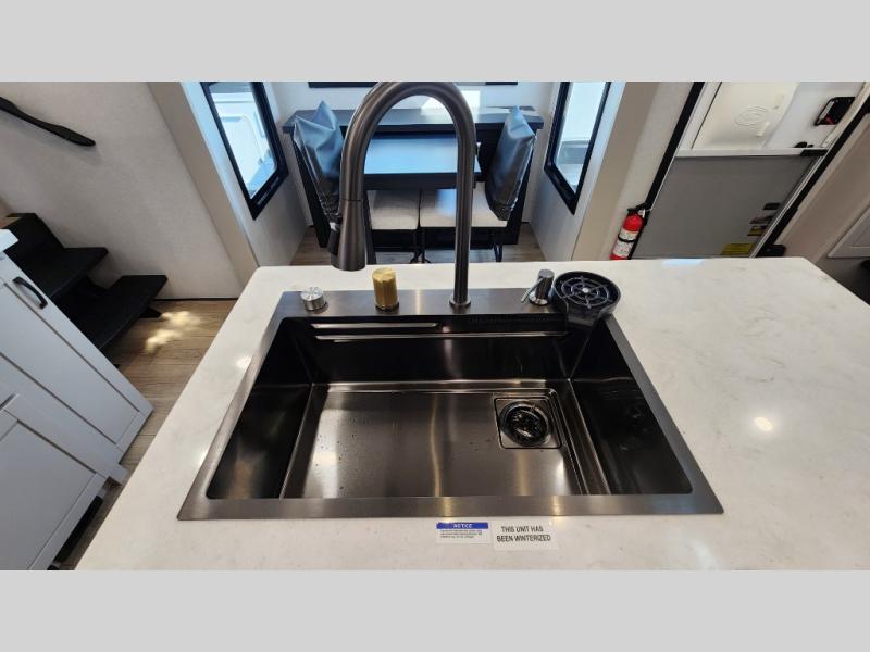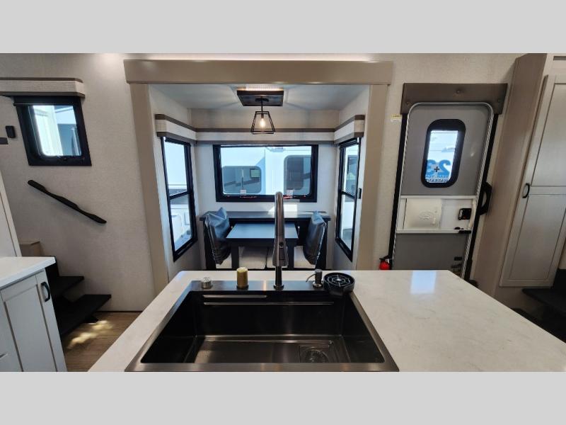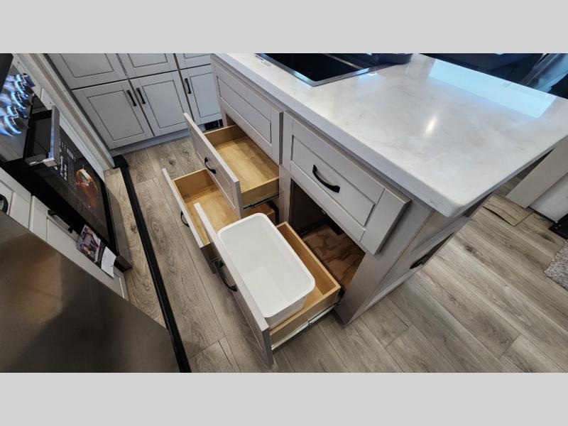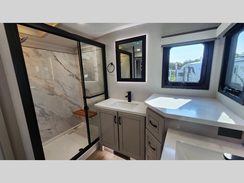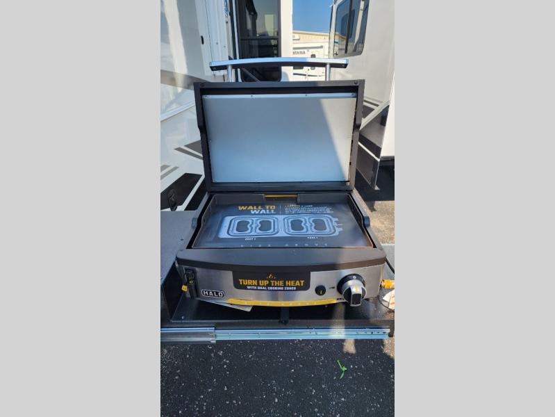 Entertainment can be found throughout this fifth wheel from the front living area with a 50" Smart LED HDTV with fully digital HDMI output and home entertainment system with subwoofer including a fireplace below that you can enjoy while relaxing on theater seats and two tri-fold sofas, a 32" TV in the middle kitchen and there is a bedroom 32" TV. You might even like to add the tailgate TV option along the exterior. Back inside the kitchen, the cook will love the center island, the pantry, the residential refrigerator, and the roll-top dinette. The half bath is a few steps away as an added convenience. The master bedroom includes a king bed slide, a bench, two wardrobes and a sliding door into the bathroom which offers two sinks, a space prepped for a washer/dryer option, and a walk-in shower. And don't forget about the exterior features such as the outside kitchen for more choices when making meals, the storage for your outdoor gear and chairs, and two awnings with integrated LED lighting.