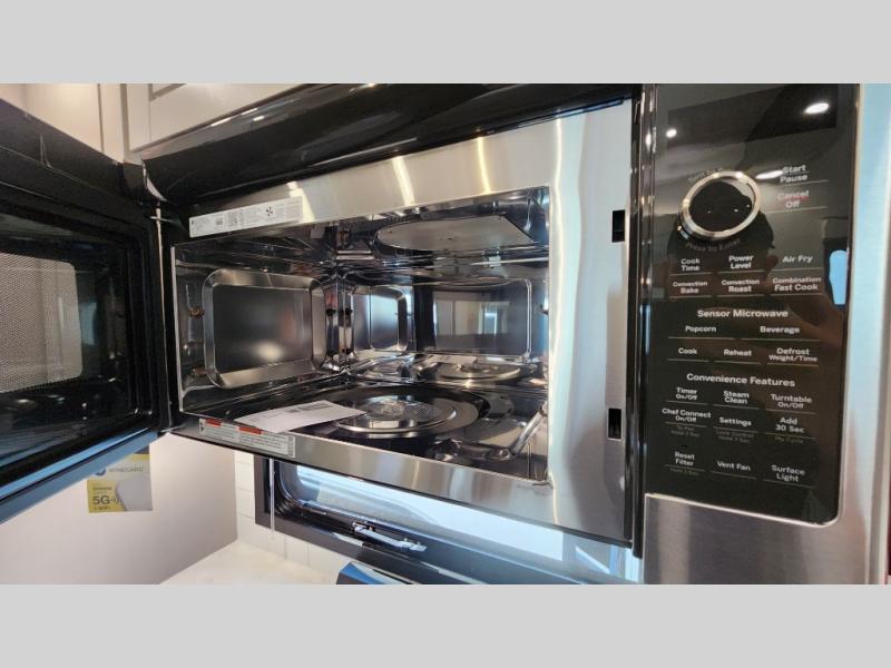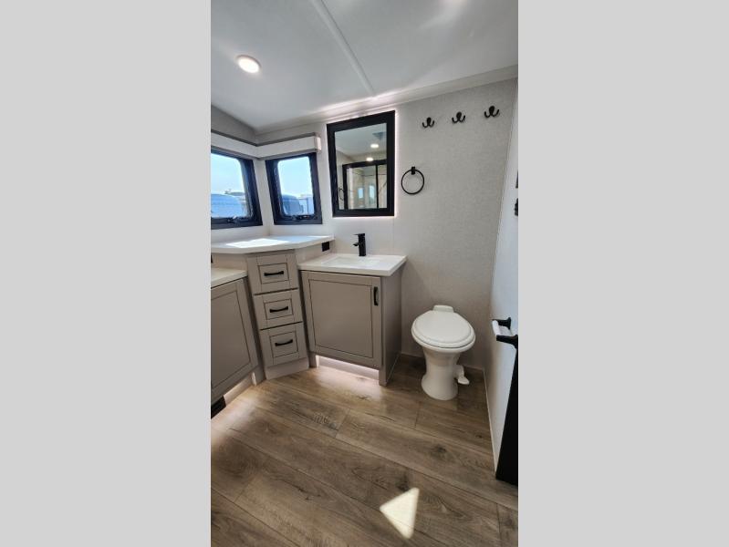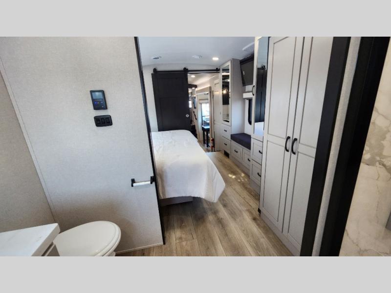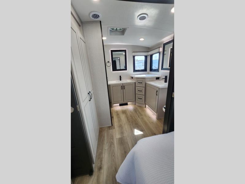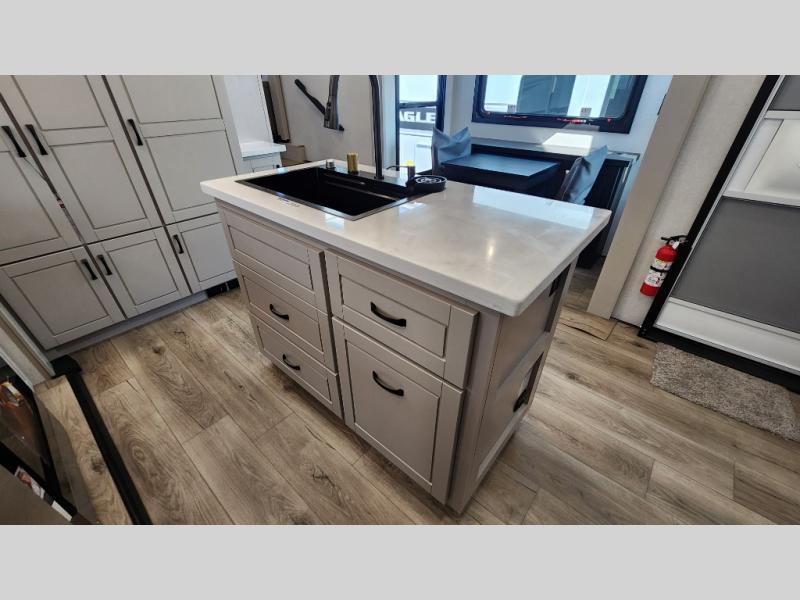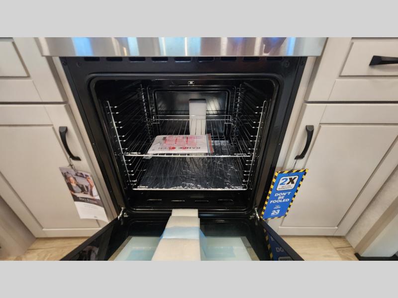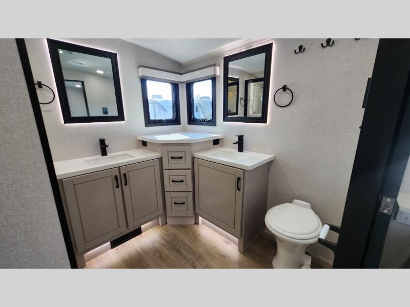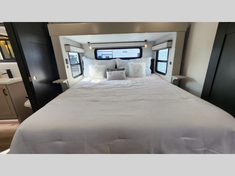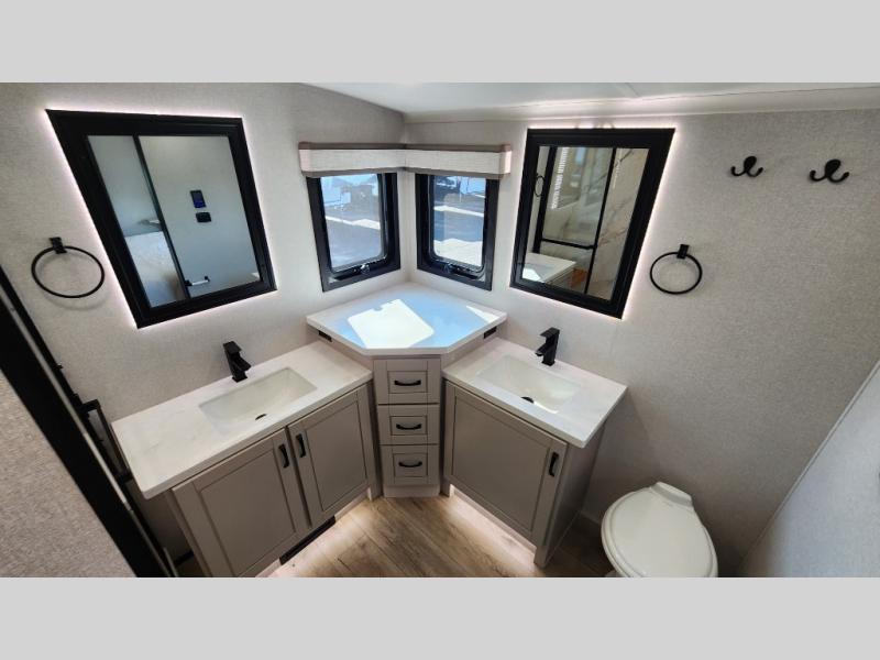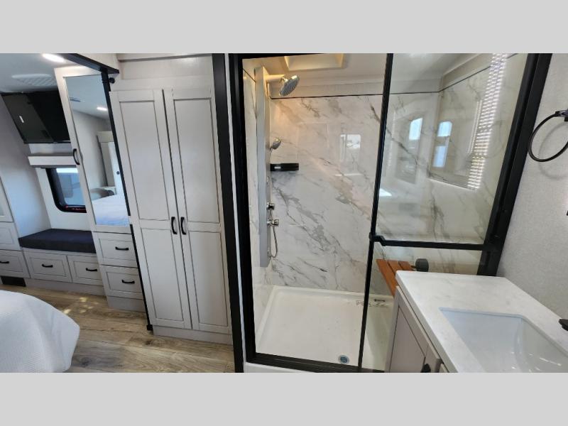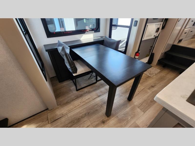 Entertainment can be found throughout this fifth wheel from the front living area with a 50" Smart LED HDTV with fully digital HDMI output and home entertainment system with subwoofer including a fireplace below that you can enjoy while relaxing on theater seats and two tri-fold sofas, a 32" TV in the middle kitchen and there is a bedroom 32" TV. You might even like to add the tailgate TV option along the exterior. Back inside the kitchen, the cook will love the center island, the pantry, the residential refrigerator, and the roll-top dinette. The half bath is a few steps away as an added convenience. The master bedroom includes a king bed slide, a bench, two wardrobes and a sliding door into the bathroom which offers two sinks, a space prepped for a washer/dryer option, and a walk-in shower. And don't forget about the exterior features such as the outside kitchen for more choices when making meals, the storage for your outdoor gear and chairs, and two awnings with integrated LED lighting.
