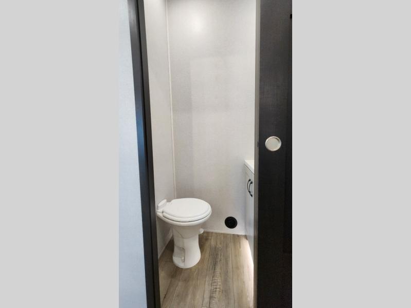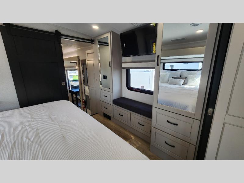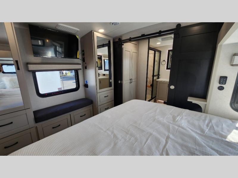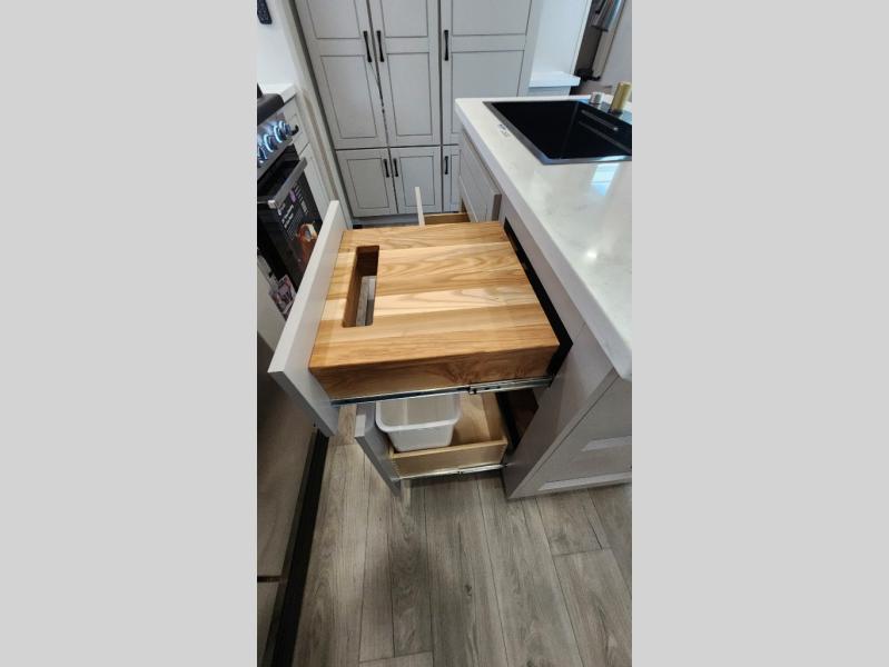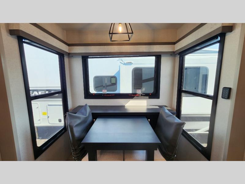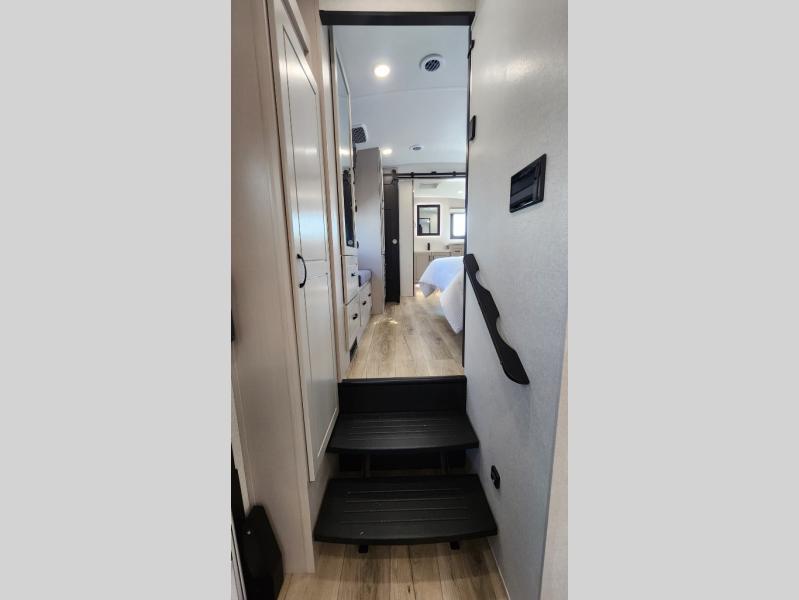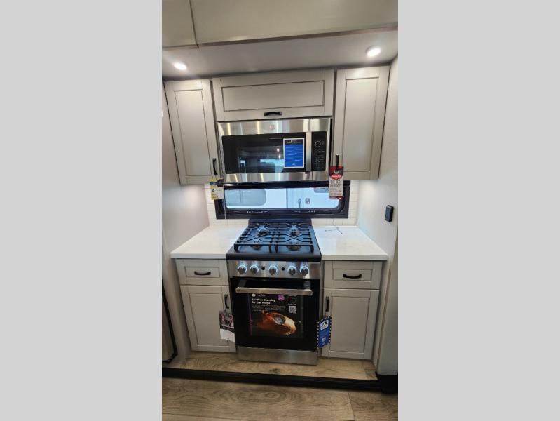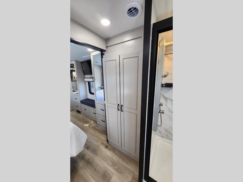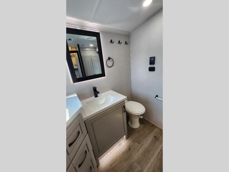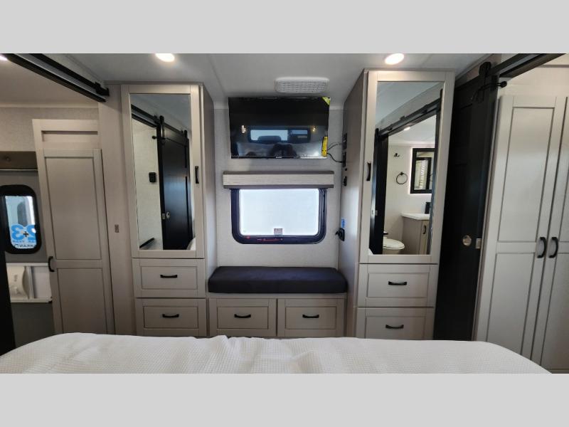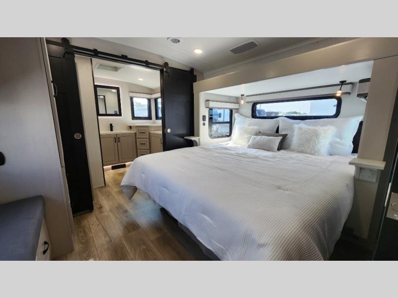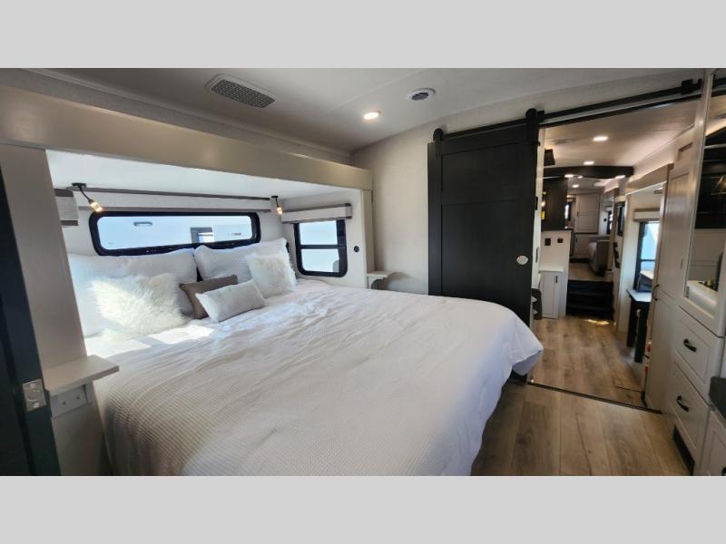 Entertainment can be found throughout this fifth wheel from the front living area with a 50" Smart LED HDTV with fully digital HDMI output and home entertainment system with subwoofer including a fireplace below that you can enjoy while relaxing on theater seats and two tri-fold sofas, a 32" TV in the middle kitchen and there is a bedroom 32" TV. You might even like to add the tailgate TV option along the exterior. Back inside the kitchen, the cook will love the center island, the pantry, the residential refrigerator, and the roll-top dinette. The half bath is a few steps away as an added convenience. The master bedroom includes a king bed slide, a bench, two wardrobes and a sliding door into the bathroom which offers two sinks, a space prepped for a washer/dryer option, and a walk-in shower. And don't forget about the exterior features such as the outside kitchen for more choices when making meals, the storage for your outdoor gear and chairs, and two awnings with integrated LED lighting.